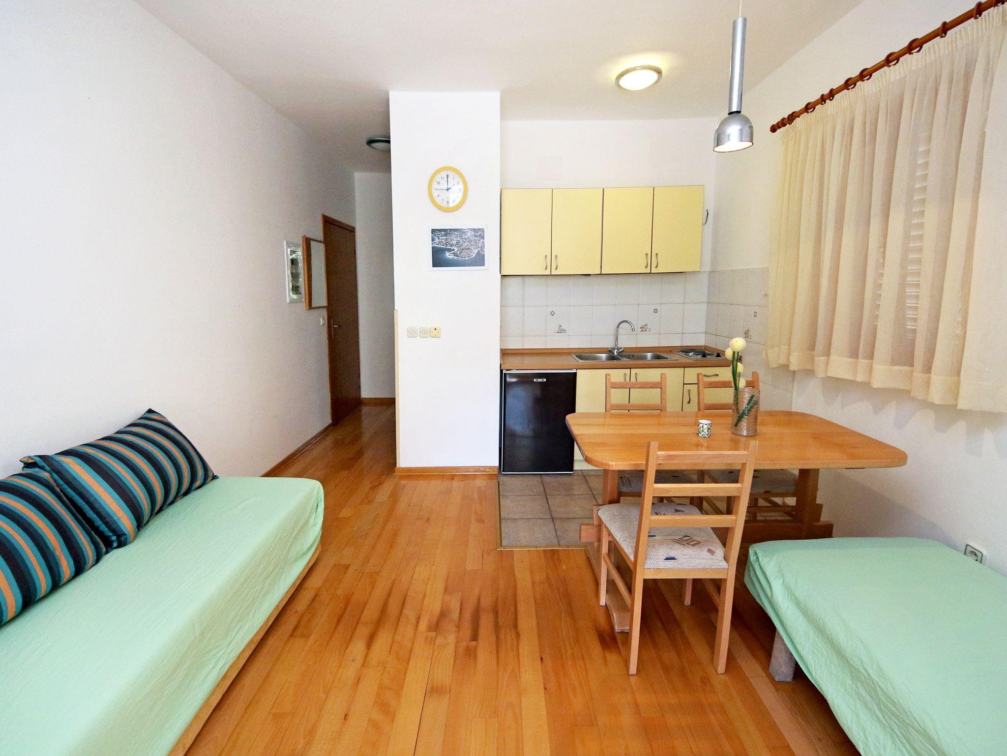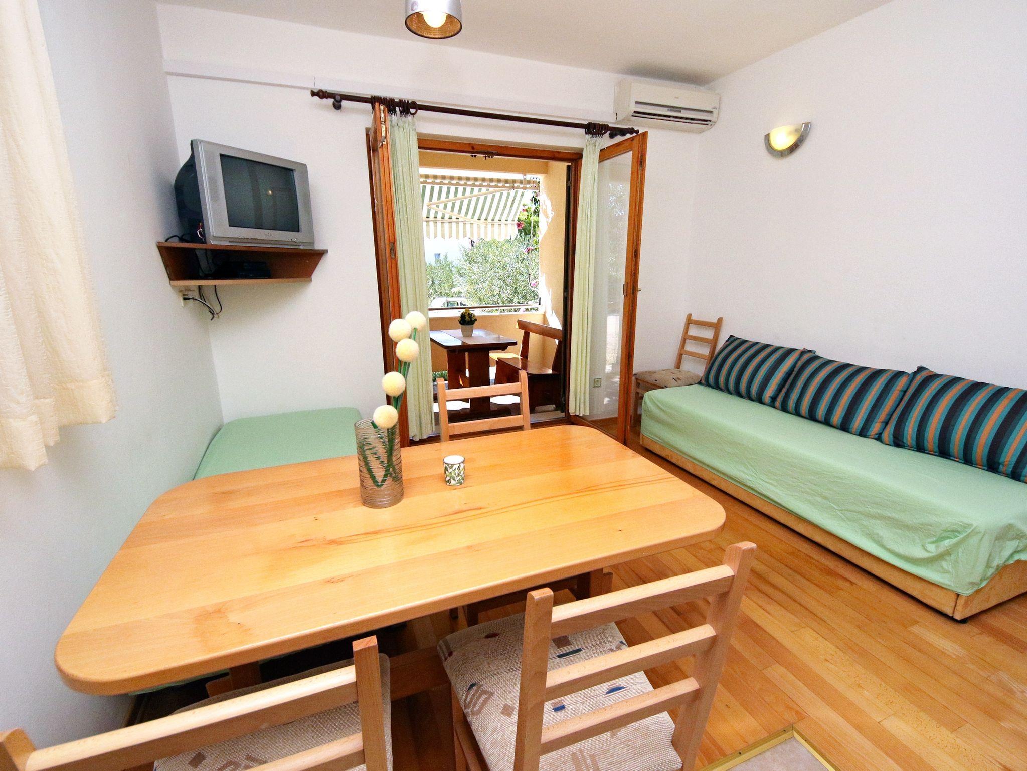 Ferienwohnung bietet Platz für 4 Gäste. Die Betten sind in Schlafzimmern, die es 1 gibt, und in Esszimmer, innerhalb einer Gesamtfläche von 30m2, angeordnet. Die Gäste haben eine eigene Terrasse zur Verfügung, auf der sie in warmen Sommernächten genießen können. Es ist erlaubt, Speisen auf dem Gemeinschafts-Grill vorzubereiten. IM PREIS INBEGRIFFEN: Kurtaxe, Endreinigung, Klimatisierung, Parkplatz, Internet, Wäschewaschen, Kinderbett, Bügeleisen, Bügelbrett, Föhn. VERBINDLICHE ZUSÄTZLICHE KOSTEN: Aufzahlung für Kurzaufenthalte (prozentualer Zuschlag pro Nächtigungsanzahl: 30% - 1, 20% - 2, 10% - 3). UNVERBINDLICHE ZUSÄTZLICHE KOSTEN: Bootsanlegeplatz (10,00 € pro Nacht). Die Verfügbarkeit zusätzlicher Dienstleistungen in Ihrem reservierten Termin und die Preise derselben (falls nicht aufgeführt) müssen im Voraus überprüft werden. Zusätzliche Dienstleistungen die in der Zahlungsaufforderung nicht aufgeführt sind werden direkt beim Vermieter bezahlt, angenommen der Gast nutzt auch diese. Ermäßigung auf den Grundpreis: Gratistag 14=13 (bei einem Aufenthalt von 14 Tagen oder mehr erhalten Sie einen Gratistag für den Aufenthalt bis 31.12.26).