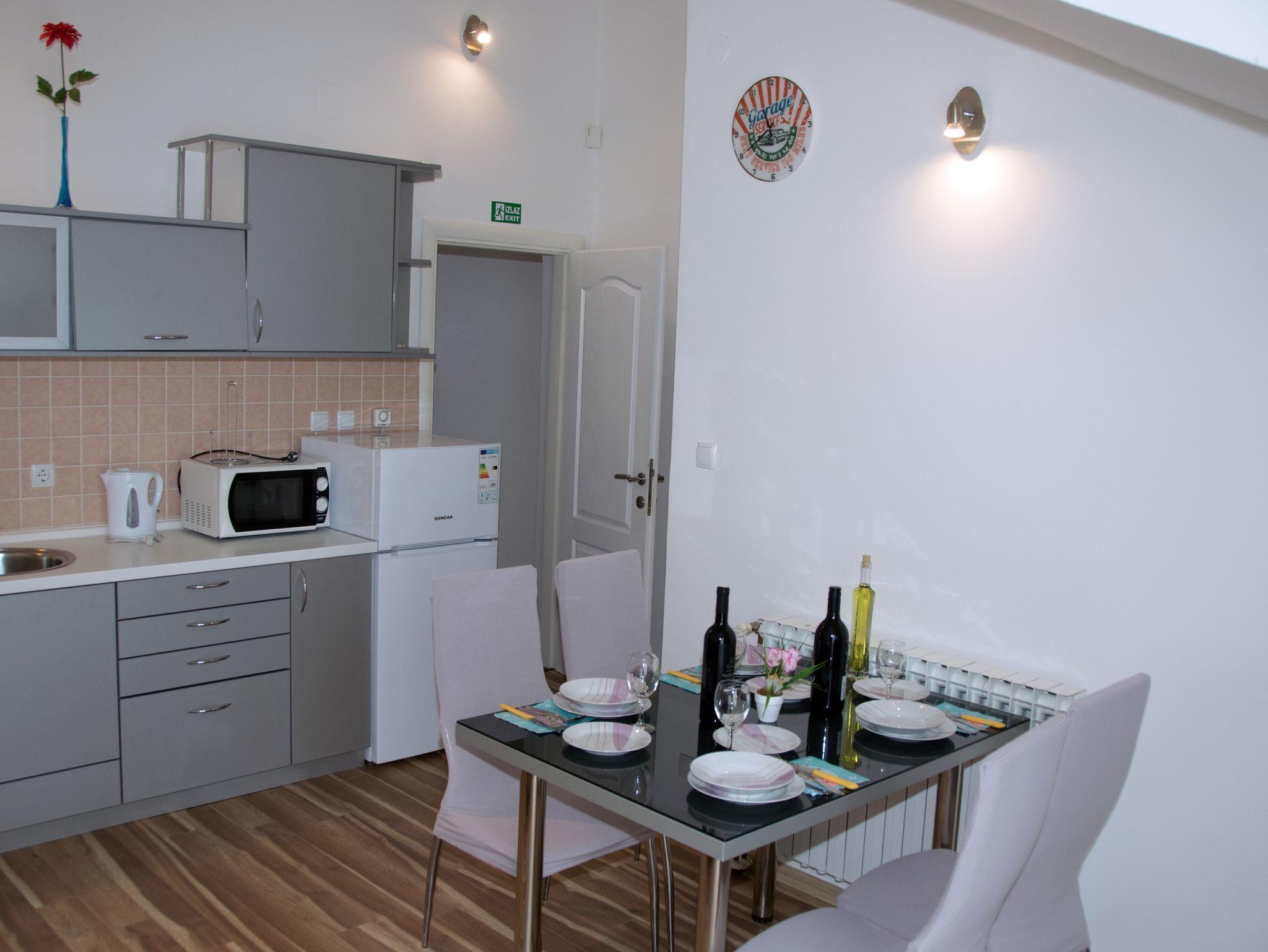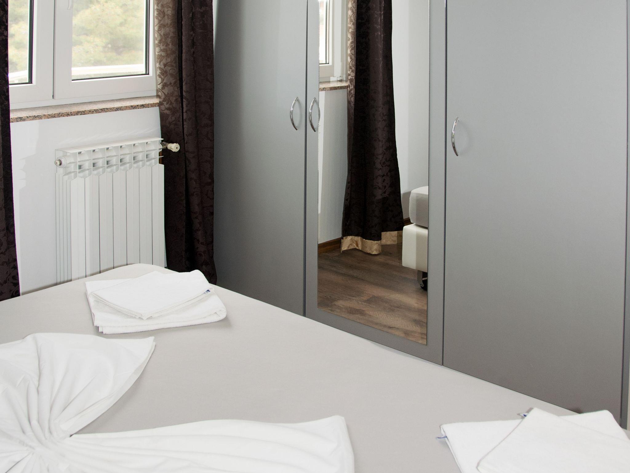 Ferienwohnung bietet Platz für 4 Gäste. Die Betten sind in Schlafzimmern, die es 1 gibt, und in Esszimmer, innerhalb einer Gesamtfläche von 32m2, angeordnet. Die Gäste haben einen eigenen Balkon zur Verfügung, auf der sie in warmen Sommernächten genießen können. Es ist erlaubt, Speisen auf dem Gemeinschafts-Grill vorzubereiten. Während ihres Aufenthalts können Gäste das gemeinsam zur Nutzung stehende Schwimmbad benutzen. In der Unterkunftseinheit besteht die Möglichkeit des Mitbringens von Haustieren gegen Aufpreis. IM PREIS INBEGRIFFEN: Kurtaxe, Endreinigung, Klimatisierung, Zentralheizung, Pool, Parkplatz, Internet, Föhn. VERBINDLICHE ZUSÄTZLICHE KOSTEN: Aufzahlung für Kurzaufenthalte (prozentualer Zuschlag pro Nächtigungsanzahl: 30% - 1, 20% - 2, 10% - 3). UNVERBINDLICHE ZUSÄTZLICHE KOSTEN: Haustiere (5,00 € pro Nacht). Die Verfügbarkeit zusätzlicher Dienstleistungen in Ihrem reservierten Termin und die Preise derselben (falls nicht aufgeführt) müssen im Voraus überprüft werden. Zusätzliche Dienstleistungen die in der Zahlungsaufforderung nicht aufgeführt sind werden direkt beim Vermieter bezahlt, angenommen der Gast nutzt auch diese.