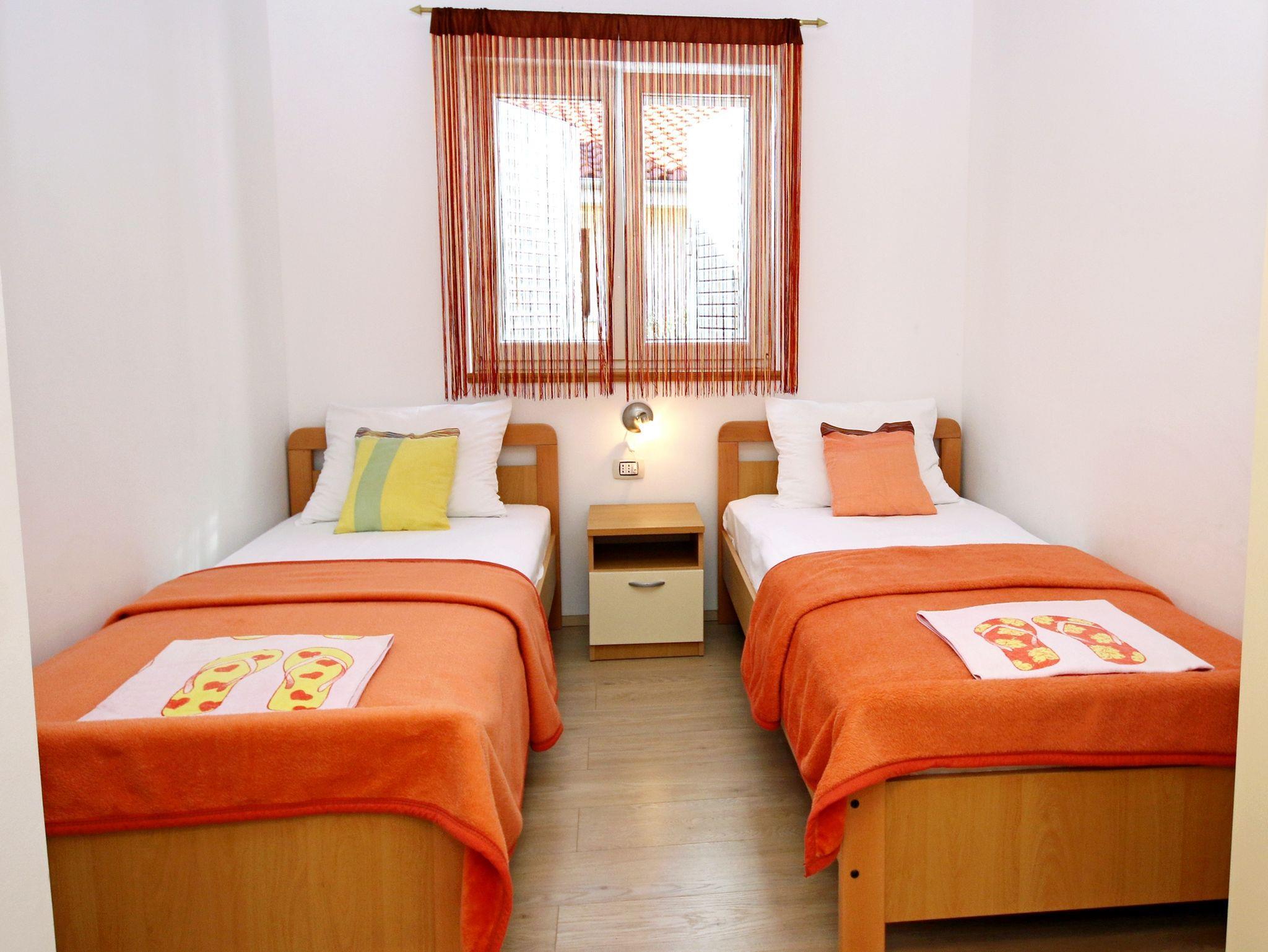 Ferienwohnung bietet Platz für 4 Gäste. Die Betten sind in Schlafzimmern, die es 2 gibt, innerhalb einer Gesamtfläche von 52m2, angeordnet. Die Gäste haben eine eigene Terrasse zur Verfügung, auf der sie in warmen Sommernächten genießen können. Es ist erlaubt, Speisen auf dem Gemeinschafts-Grill vorzubereiten. IM PREIS INBEGRIFFEN: Kurtaxe, Endreinigung, Klimatisierung, Parkplatz, Internet, Wäschewaschen, Kinderbett, Bügeleisen, Bügelbrett, Föhn. VERBINDLICHE ZUSÄTZLICHE KOSTEN: Aufzahlung für Kurzaufenthalte (prozentualer Zuschlag pro Nächtigungsanzahl: 30% - 1, 20% - 2, 10% - 3). UNVERBINDLICHE ZUSÄTZLICHE KOSTEN: Bootsanlegeplatz (10,00 € pro Nacht). Die Verfügbarkeit zusätzlicher Dienstleistungen in Ihrem reservierten Termin und die Preise derselben (falls nicht aufgeführt) müssen im Voraus überprüft werden. Zusätzliche Dienstleistungen die in der Zahlungsaufforderung nicht aufgeführt sind werden direkt beim Vermieter bezahlt, angenommen der Gast nutzt auch diese. Ermäßigung auf den Grundpreis: Gratistag 14=13 (bei einem Aufenthalt von 14 Tagen oder mehr erhalten Sie einen Gratistag für den Aufenthalt bis 31.12.26).