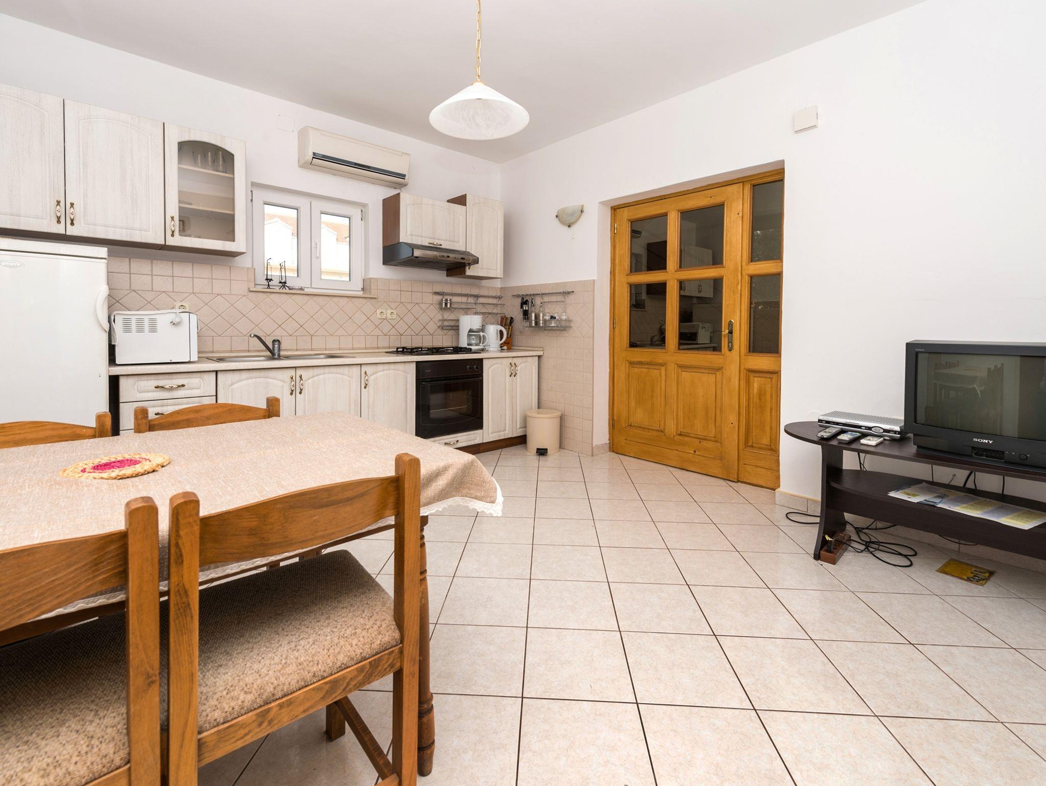 Ferienwohnung bietet Platz für 5 Gäste. Die Betten sind in Schlafzimmern, die es 2 gibt, innerhalb einer Gesamtfläche von 50m2, angeordnet. Die Gäste haben eine eigene Terrasse zur Verfügung, auf der sie in warmen Sommernächten genießen können. Das Apartment bietet Meerblick. Es ist erlaubt, Speisen auf dem Gemeinschafts-Grill vorzubereiten. IM PREIS INBEGRIFFEN: Kurtaxe, Endreinigung, Klimatisierung, Parkplatz, Internet, Bootsanlegeplatz, Kinderbett, Bügeleisen, Bügelbrett, Föhn. VERBINDLICHE ZUSÄTZLICHE KOSTEN: Aufzahlung für Kurzaufenthalte (prozentualer Zuschlag pro Nächtigungsanzahl: 30% - 1, 20% - 2, 10% - 3). Die Verfügbarkeit zusätzlicher Dienstleistungen in Ihrem reservierten Termin und die Preise derselben (falls nicht aufgeführt) müssen im Voraus überprüft werden. Zusätzliche Dienstleistungen die in der Zahlungsaufforderung nicht aufgeführt sind werden direkt beim Vermieter bezahlt, angenommen der Gast nutzt auch diese. Ermäßigung auf den Grundpreis: Gratistag 14=13 (bei einem Aufenthalt von 14 Tagen oder mehr erhalten Sie einen Gratistag für den Aufenthalt bis 31.12.26).