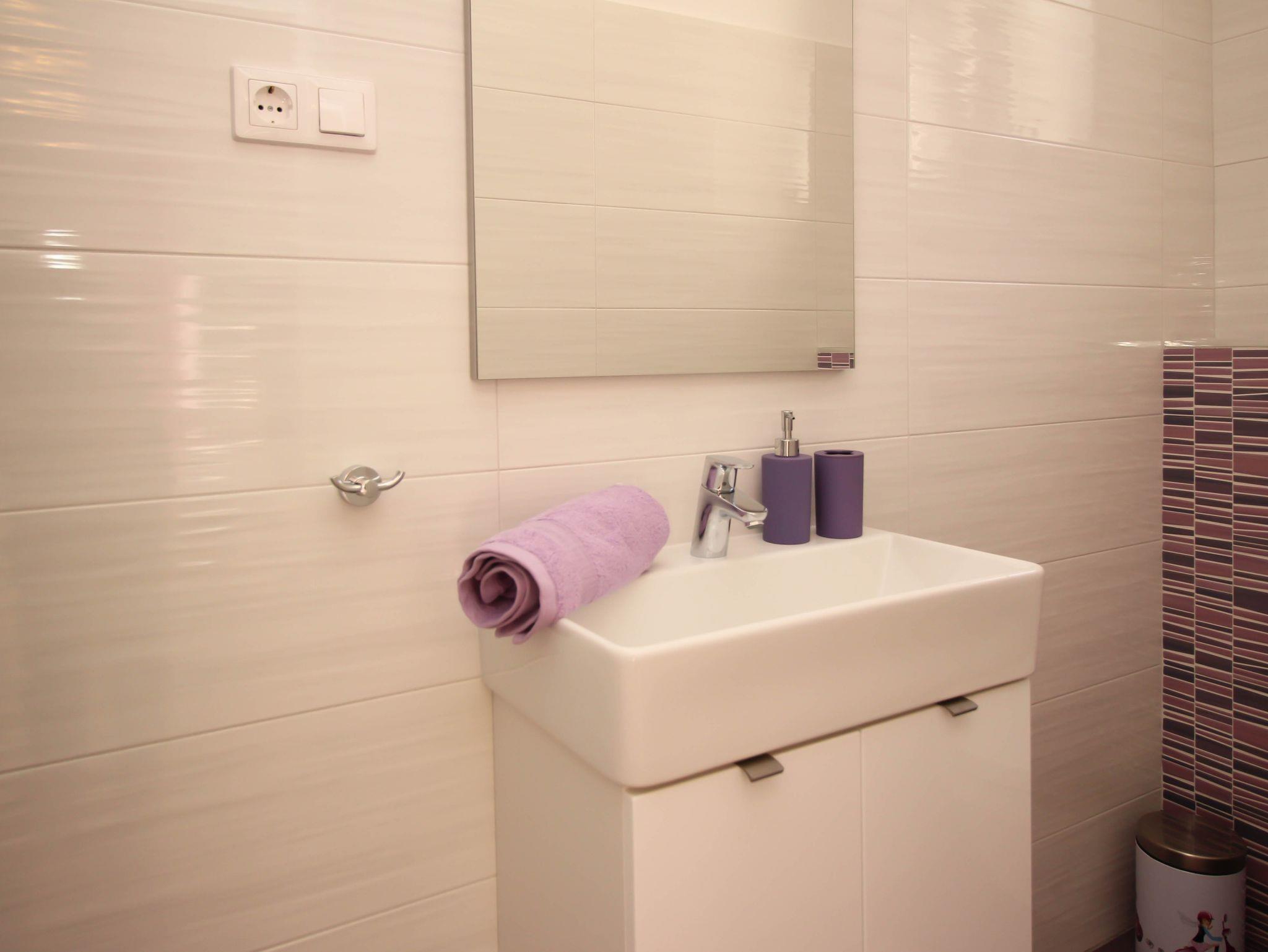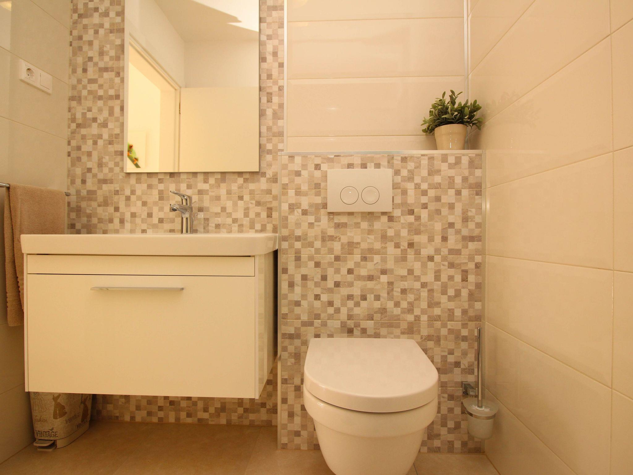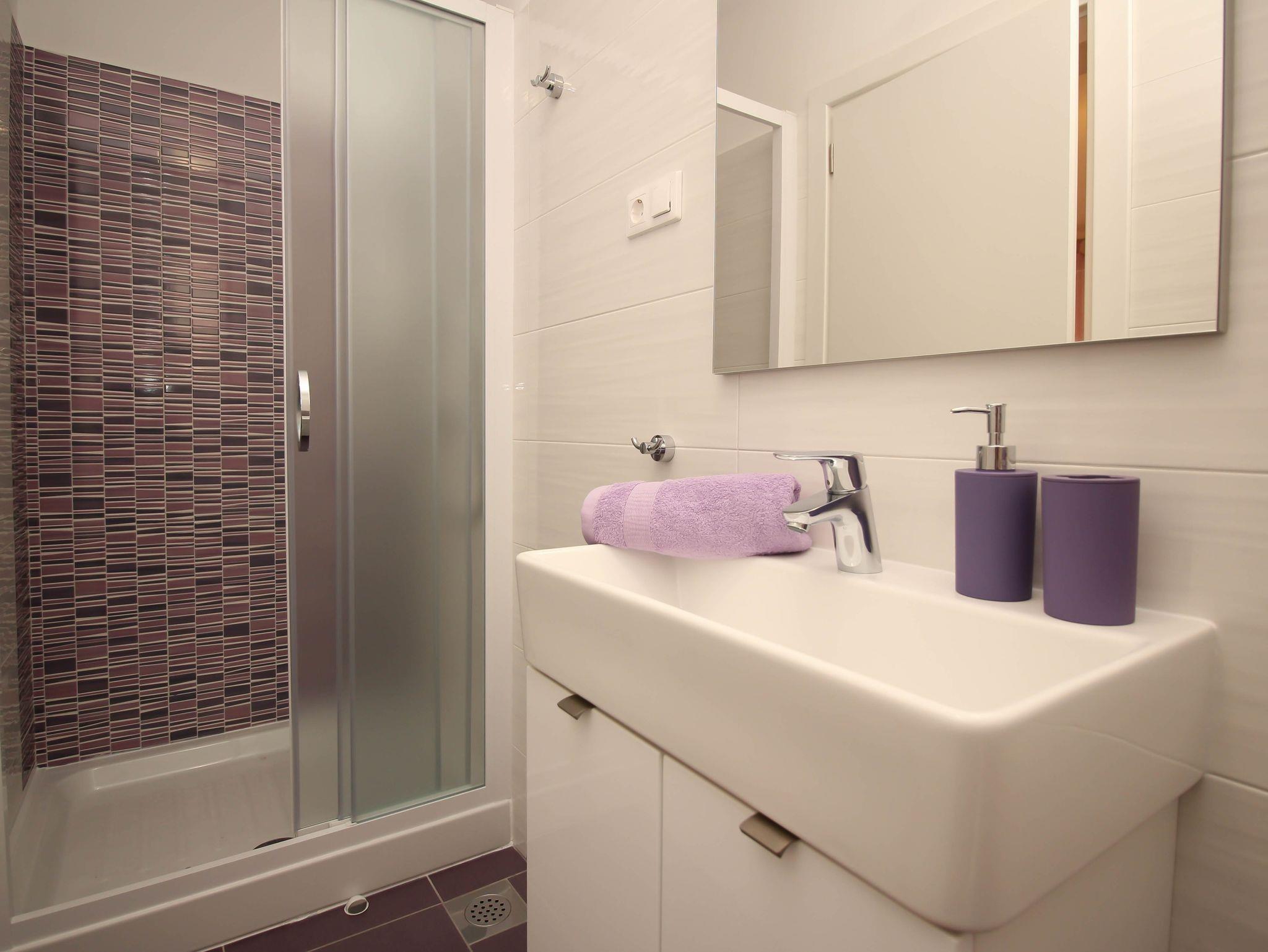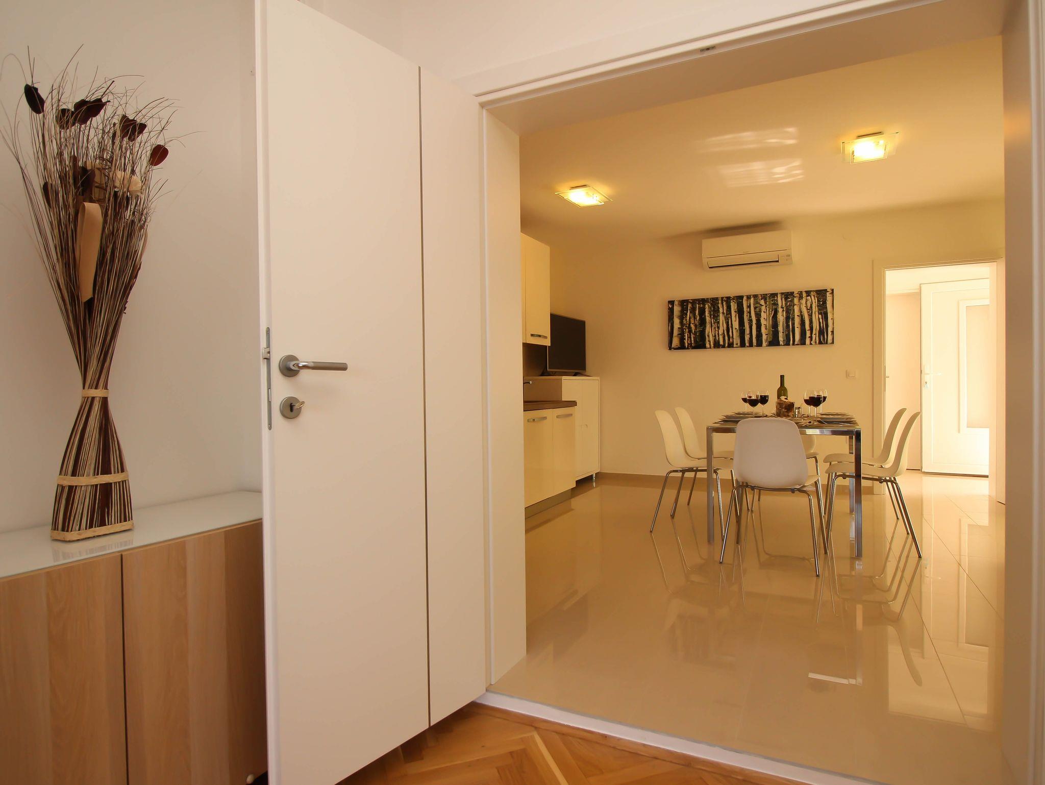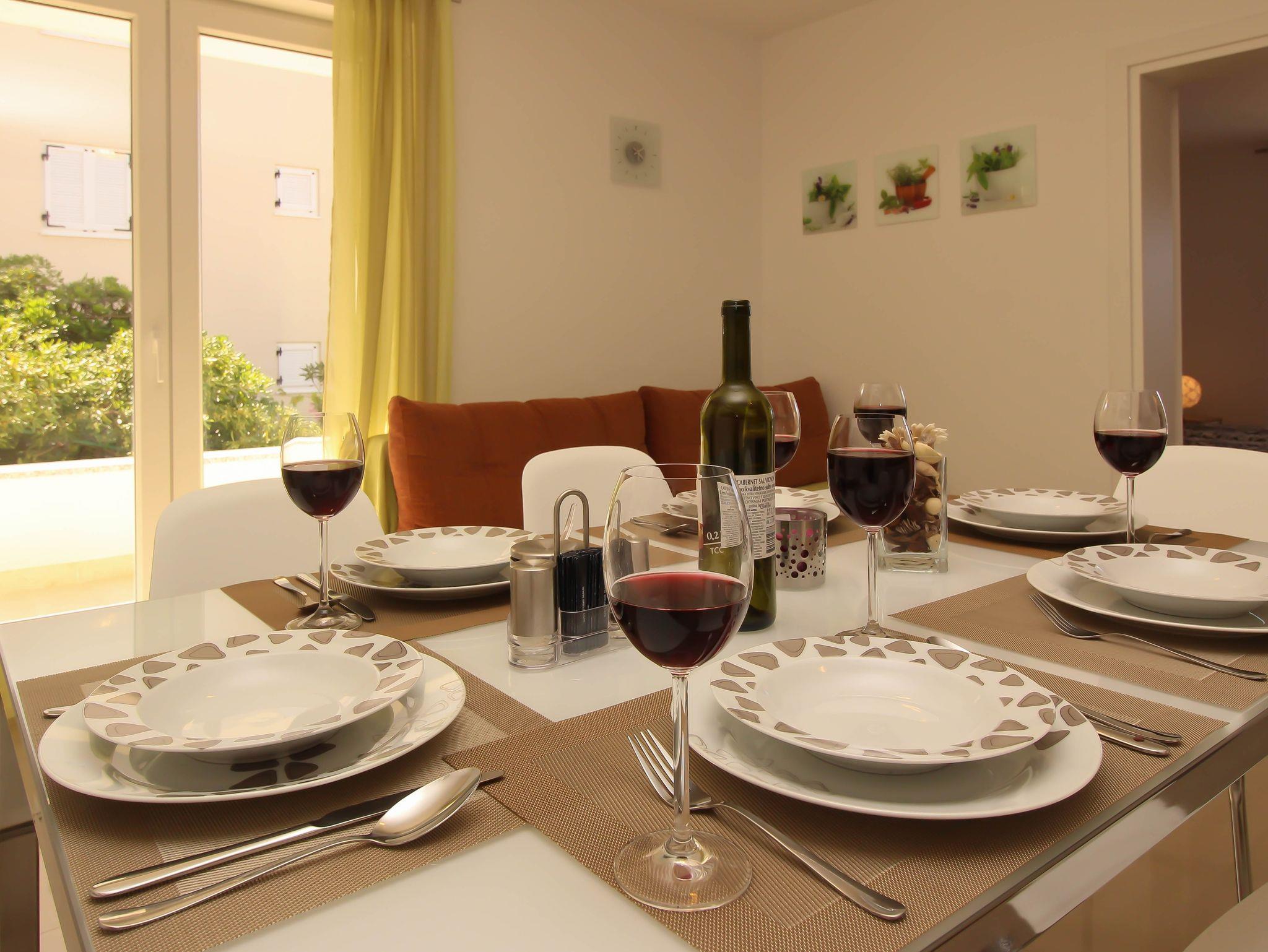 Ferienwohnung bietet Platz für 5 Gäste. Die Betten sind in Schlafzimmern, die es 2 gibt, und in Esszimmer, innerhalb einer Gesamtfläche von 58m2, angeordnet. Die Gäste haben eine eigene Terrasse zur Verfügung, auf der sie in warmen Sommernächten genießen können. Das Apartment bietet Meerblick. Es ist erlaubt, Speisen auf dem Gemeinschafts-Grill vorzubereiten. IM PREIS INBEGRIFFEN: Kurtaxe, Endreinigung, Klimatisierung, Parkplatz, Internet, Wäschewaschen, Bügeleisen, Bügelbrett, Föhn. Die Verfügbarkeit zusätzlicher Dienstleistungen in Ihrem reservierten Termin und die Preise derselben (falls nicht aufgeführt) müssen im Voraus überprüft werden. Zusätzliche Dienstleistungen die in der Zahlungsaufforderung nicht aufgeführt sind werden direkt beim Vermieter bezahlt, angenommen der Gast nutzt auch diese.