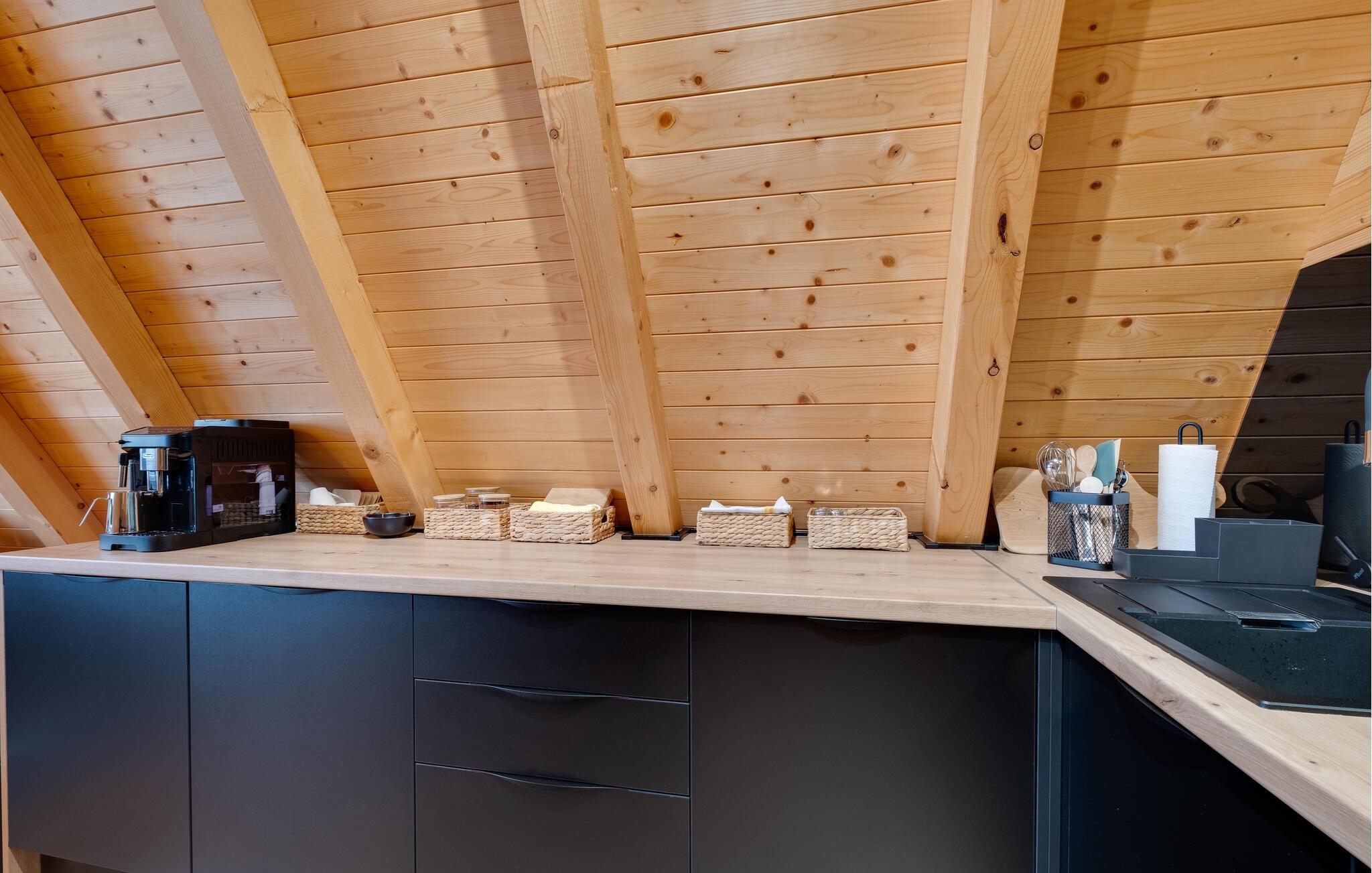 I jeres udendørsområde kan I forkæle jer selv i den indbydende jacuzzi og nyde morgenmaden på den rummelige terrasse omgivet af uberørt natur. Læn jer tilbage i de komfortable liggestole og lad blikket vandre ud over det idylliske landskab. Om aftenen skaber de stemningsfulde lys det perfekte miljø til afslappende timer under stjernerne.