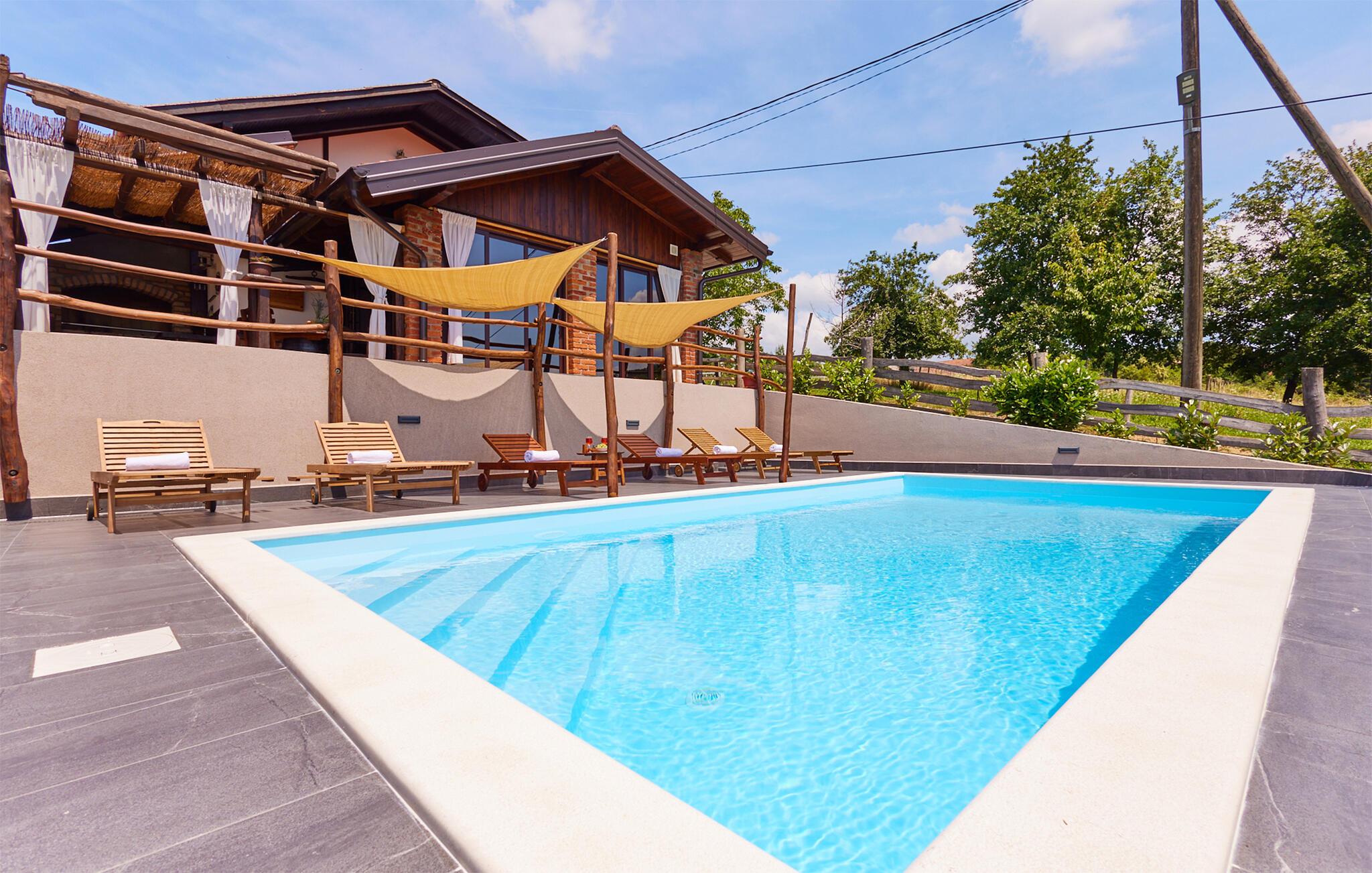 Huset ligger i forstaden Popovaca i grønne, rolige omgivelser - det perfekte sted at genoplade batterierne. Det er velegnet til små børn og kæledyr, så her kan hele familien samles. Fra morgen til aften kan I nyde en smuk udsigt over landskabet. Huset har takket være sine mange træ- og stenelementer en hyggelig, rustik atmosfære, som gør, at I øjeblikkeligt vil føle jer hjemme. Start dagen med morgenmad og kaffe på terrassen og læg planer for dagen. Måske I har mest lyst til at blive hjemme og spille fodbold, badminton eller volleyball eller lade børnene lege på grunden, som er udstyret med gynge, sandkasse, udendørsspil- og legetøj, klatrestativ og rutsjebane. Senere kan I tilberede en lækker feriemiddag i udekøkkenet og på grillen, og derefter kan I nyde en drink i indespaet med flot udsigt over landskabet gennem de store vinduer. Afslut dagen med at se en god film eller serie via Netflix.