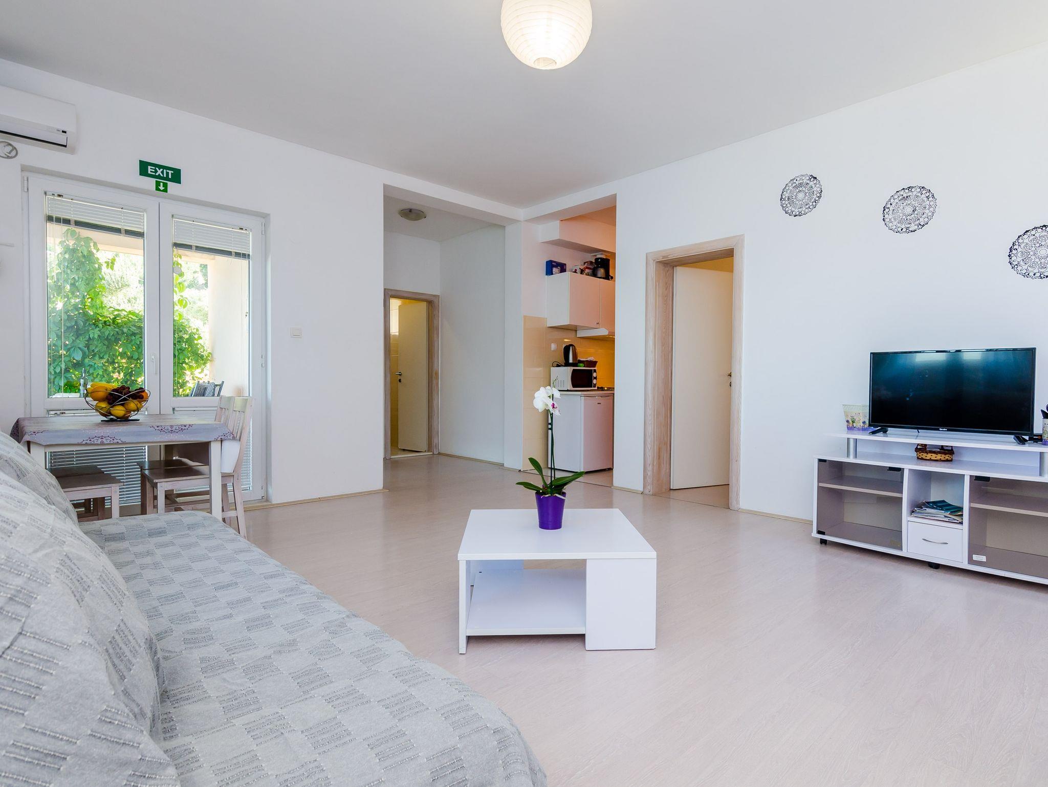 Ferienwohnung bietet Platz für 4 Gäste. Die Betten sind in Schlafzimmern, die es 1 gibt, und in Wohnzimmer, innerhalb einer Gesamtfläche von 47m2, angeordnet. Die Gäste haben eine eigene Terrasse zur Verfügung, auf der sie in warmen Sommernächten genießen können. Das Apartment bietet Meerblick. Es ist erlaubt, Speisen auf dem Gemeinschafts-Grill vorzubereiten. IM PREIS INBEGRIFFEN: Kurtaxe, Endreinigung, Klimatisierung, Parkplatz, Internet, Bootsanlegeplatz, Kinderbett, Zusatzbett, Bügeleisen, Bügelbrett, Föhn, Sonnenschirm, Liegestühle. Die Verfügbarkeit zusätzlicher Dienstleistungen in Ihrem reservierten Termin und die Preise derselben (falls nicht aufgeführt) müssen im Voraus überprüft werden. Zusätzliche Dienstleistungen die in der Zahlungsaufforderung nicht aufgeführt sind werden direkt beim Vermieter bezahlt, angenommen der Gast nutzt auch diese. Ermäßigung auf den Grundpreis: Gratistag 14=13 (bei einem Aufenthalt von 14 Tagen oder mehr erhalten Sie einen Gratistag für den Aufenthalt bis 31.12.26).