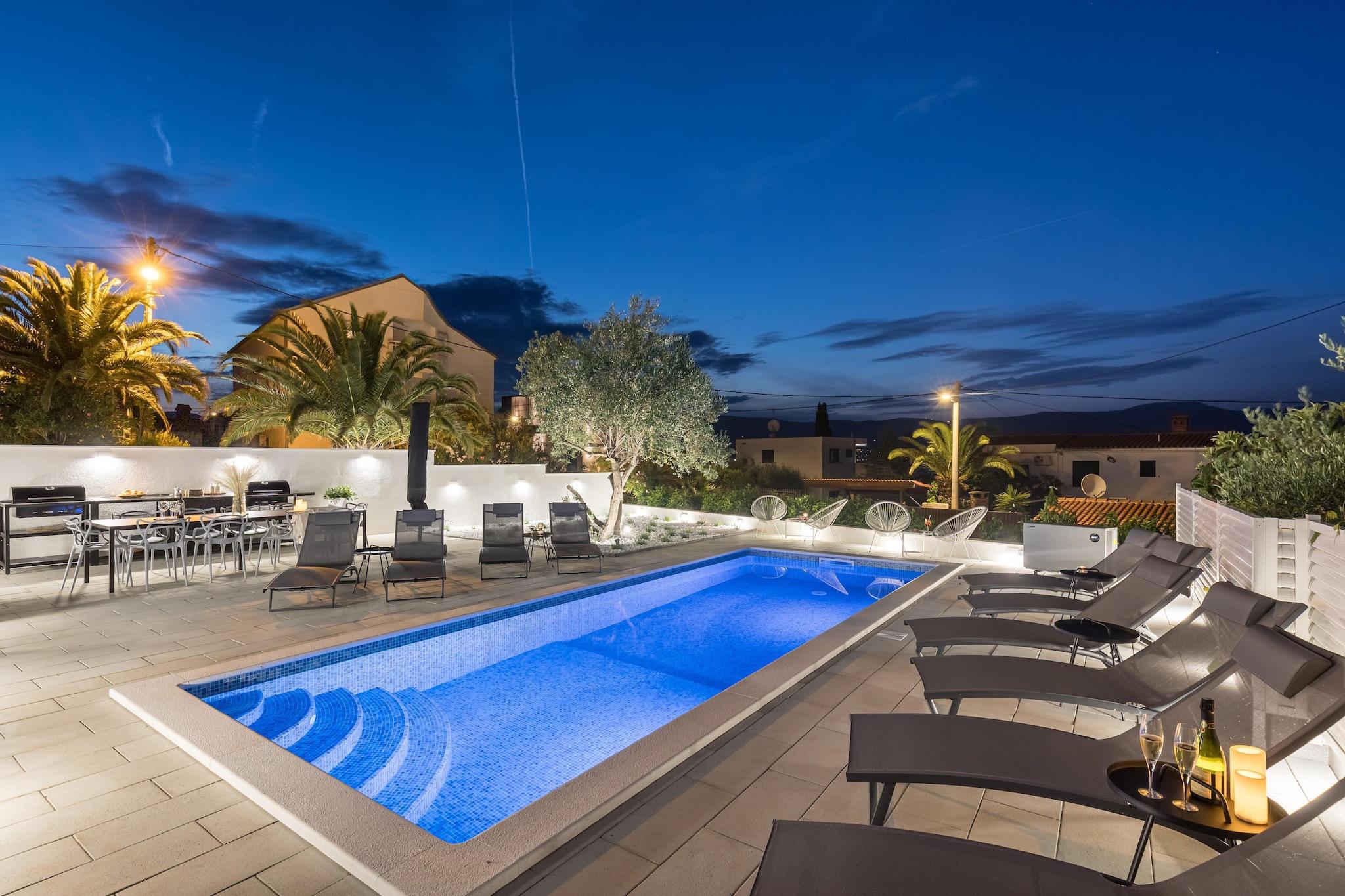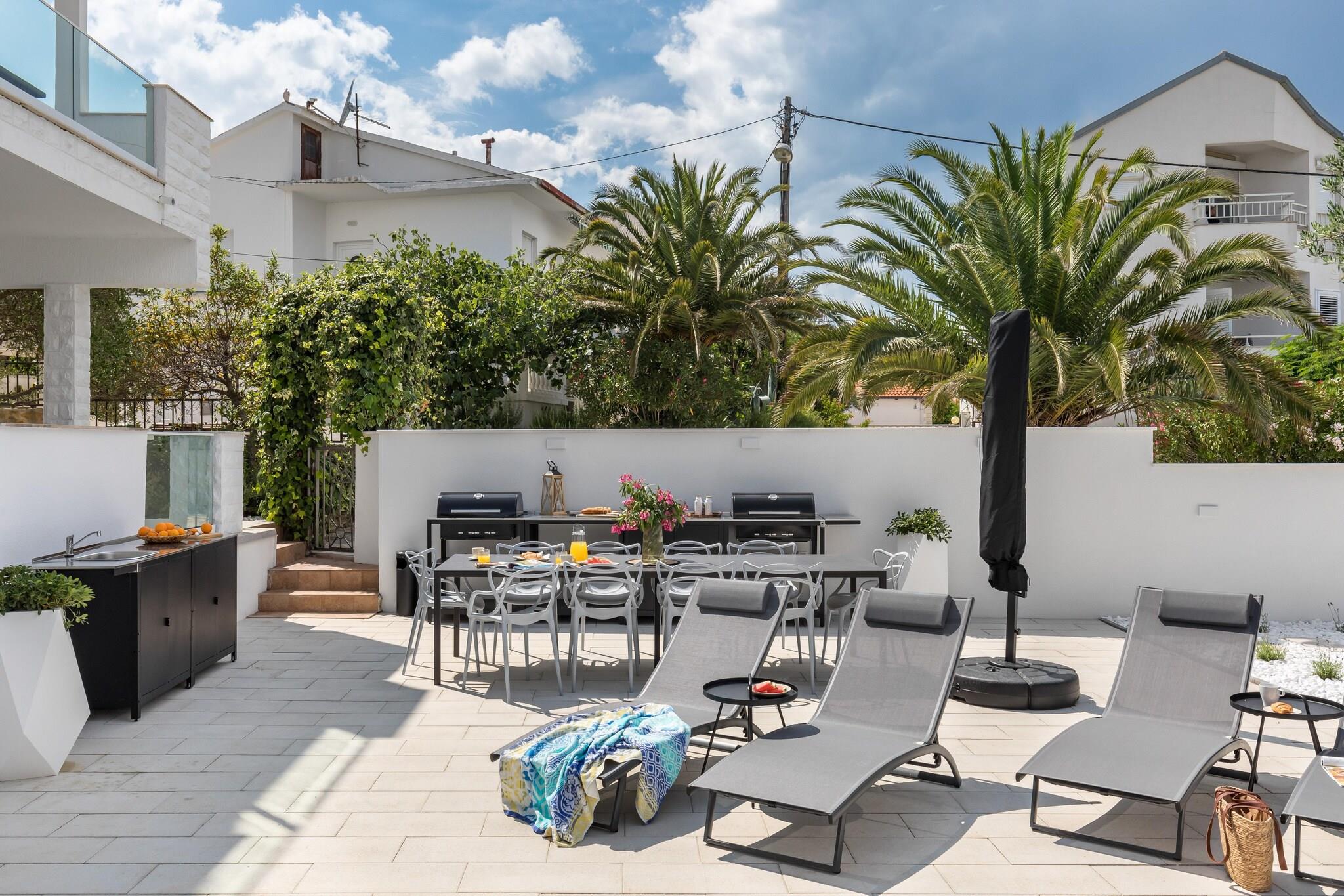 Denne kæledyrsvenlige lejlighed ligger i den fredelige landsby Slatine, kun 70 meter fra stranden og 5 km fra Trogirs historiske centrum, og tilbyder et komfortabelt tilflugtssted for op til fire gæster. Den er ideelt beliggende tæt på restauranter, butikker og offentlig transport, hvilket gør det nemt at nyde både den afslappende kystnære beliggenhed og de kulturelle seværdigheder i de nærliggende byer. Lejligheden ligger på første sal og har to soveværelser med dobbeltsenge, en hyggelig opholdsstue med sovesofa og fladskærms-tv samt et fuldt udstyret køkken. Gæsterne kan nyde en privat terrasse, adgang til en fælles swimmingpool og boblebad samt en have med liggestole og grill. Lejligheden har moderne bekvemmeligheder såsom aircondition, Wi-Fi og gulvvarme. Indtjekning er nem med en privat indgang og adgang med nøglekode. Parkering er tilgængelig både foran og bag bygningen, hvor den venlige husholderske Alicia bor og kan hjælpe med alt, hvad du behøver. Gæster skal betale et depositum på EURO100 ved ankomsten, som refunderes ved afrejse. Pasregistrering kan ske via QR-kode eller gennem Alicia. Lufthavnstransport og billeje kan også arrangeres efter anmodning.