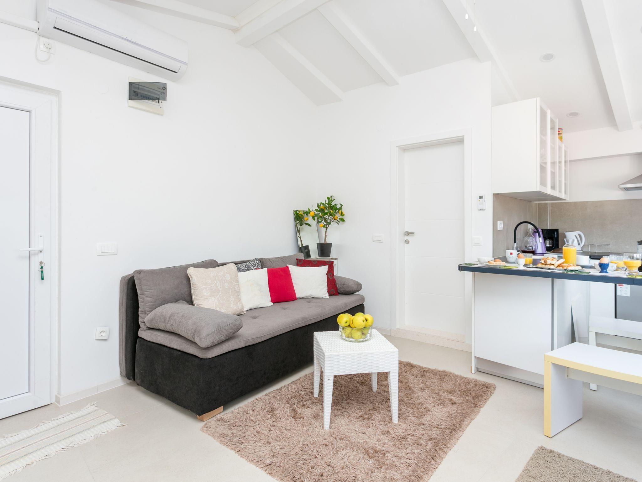 Ferienwohnung bietet Platz für 4 Gäste. Die Betten sind in Schlafzimmern, die es 1 gibt, und in Wohnzimmer, innerhalb einer Gesamtfläche von 37m2, angeordnet. In der Unterkunftseinheit besteht die Möglichkeit des Mitbringens von Haustieren gegen Aufpreis. Die reservierte Unterkunftseinheit hat keinen Balkon und keine Terrasse. IM PREIS INBEGRIFFEN: Kurtaxe, Endreinigung, Klimatisierung, Internet, Bügeleisen, Bügelbrett, Föhn. VERBINDLICHE ZUSÄTZLICHE KOSTEN: Aufzahlung für Kurzaufenthalte (prozentualer Zuschlag pro Nächtigungsanzahl: 30% - 1, 20% - 2, 10% - 3). UNVERBINDLICHE ZUSÄTZLICHE KOSTEN: Haustiere (10,00 € pro Nacht). Die Verfügbarkeit zusätzlicher Dienstleistungen in Ihrem reservierten Termin und die Preise derselben (falls nicht aufgeführt) müssen im Voraus überprüft werden. Zusätzliche Dienstleistungen die in der Zahlungsaufforderung nicht aufgeführt sind werden direkt beim Vermieter bezahlt, angenommen der Gast nutzt auch diese. Ermäßigung auf den Grundpreis: Gratistag 14=13 (bei einem Aufenthalt von 14 Tagen oder mehr erhalten Sie einen Gratistag für den Aufenthalt bis 31.12.26).