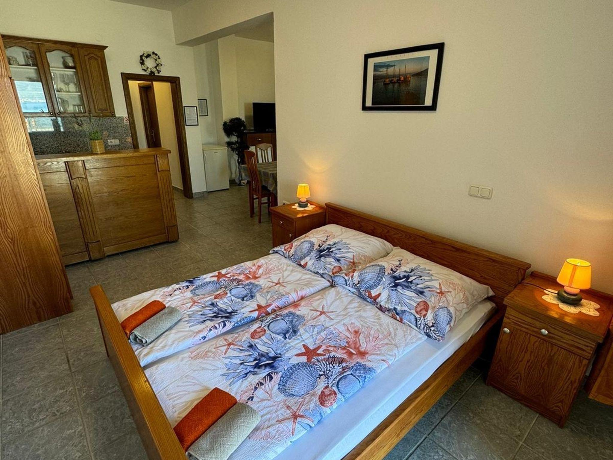 Studio bietet Platz für 4 Gäste. Die Betten sind in Schlafzimmern, die es 1 gibt, und in Esszimmer, innerhalb einer Gesamtfläche von 41m2, angeordnet. Die Gäste haben eine eigene Terrasse zur Verfügung, auf der sie in warmen Sommernächten genießen können. Das Studio-Apartment bietet Meerblick. Es ist erlaubt, Speisen auf dem Gemeinschafts-Grill vorzubereiten. IM PREIS INBEGRIFFEN: Kurtaxe, Endreinigung, Klimatisierung, Parkplatz, Internet, Kinderbett, Bügeleisen, Bügelbrett. VERBINDLICHE ZUSÄTZLICHE KOSTEN: Aufzahlung für Kurzaufenthalte (prozentualer Zuschlag pro Nächtigungsanzahl: 30% - 1, 20% - 2, 10% - 3). Die Verfügbarkeit zusätzlicher Dienstleistungen in Ihrem reservierten Termin und die Preise derselben (falls nicht aufgeführt) müssen im Voraus überprüft werden. Zusätzliche Dienstleistungen die in der Zahlungsaufforderung nicht aufgeführt sind werden direkt beim Vermieter bezahlt, angenommen der Gast nutzt auch diese.