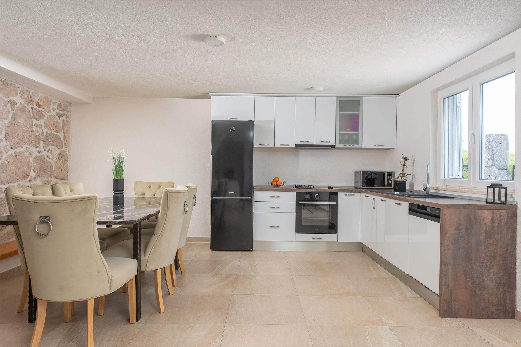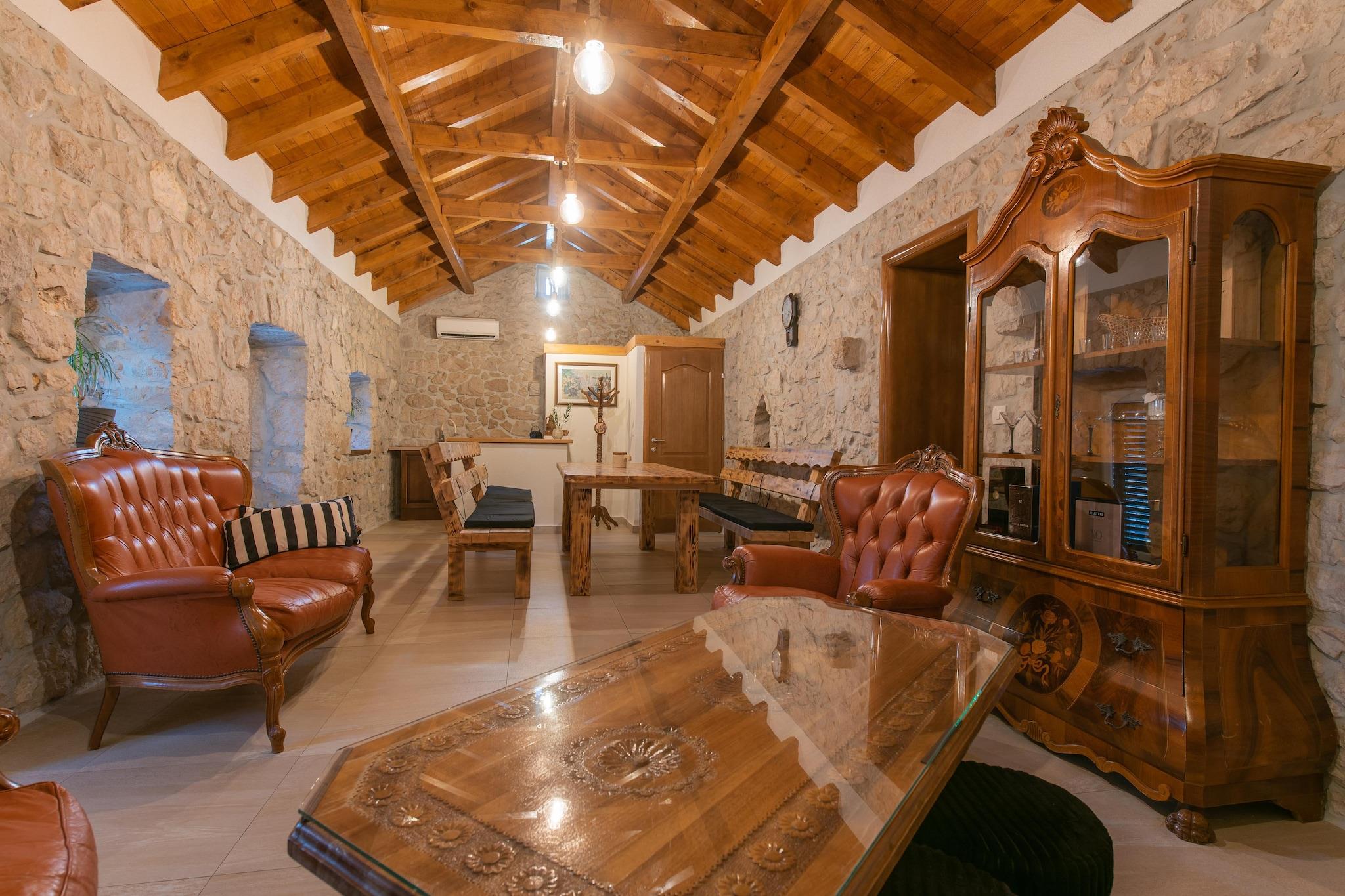 Gemt i Slivnos fredelige bakker er Casa Natura et tilflugtssted skabt til gæster, der længes efter plads, stilhed og ægte forbindelse - med naturen, maden og hinanden. Med plads til op til 10 gæster blander dette bjergparadis rustik karakter med moderne komfort i omgivelser, der føles uberørte, rolige og dybt jordnære. Udeområdet er villaens sjæl - en swimmingpool ligger midt i en anlagt have, liggestole omkranser poolen til afslappende øjeblikke, mens det overdækkede udendørs spiseområde - med pejs - bliver det naturlige samlingspunkt for langsomme måltider og vinfyldte samtaler. Casa Natura balancerer interiør med varme og praktisk anvendelighed. To soveværelser på stueetagen har hver en stor dobbeltseng, ekstra enkeltsenge og tv'er, hvilket gør dem ideelle til familier eller fælles ophold. Et tredje soveværelse i kælderen med eget badeværelse tilbyder ekstra privatliv - perfekt til par eller ældre gæster. Det fælles familiebadeværelse har badekar, vaskemaskine og tørretumbler, mens et ekstra gæstetoilet holder planløsningen glat og komfortabel. Det åbne køkken er fuldt udstyret til ægte hjemmelavet mad, mens flere stue-spisestuer har rigeligt med siddepladser, et spisebord og en sovesofa, samt en pejs, der indbyder til hyggelige aftener, brætspil eller stille glas vin, når bjergluften køler af. Trods den fredelige afsondrethed er eventyret aldrig langt væk. De berømte blå og røde søer i Imotski ligger kun 27 km væk, mens Baška Voda og dens strande ligger inden for en nem, naturskøn køretur. På den anden side af den nærliggende grænse tilbyder Bosniens Pec Mlini-eventyrpark og de dramatiske Kravica-vandfald uforglemmelige dagsture fyldt med ziplining, huler og kaskader.