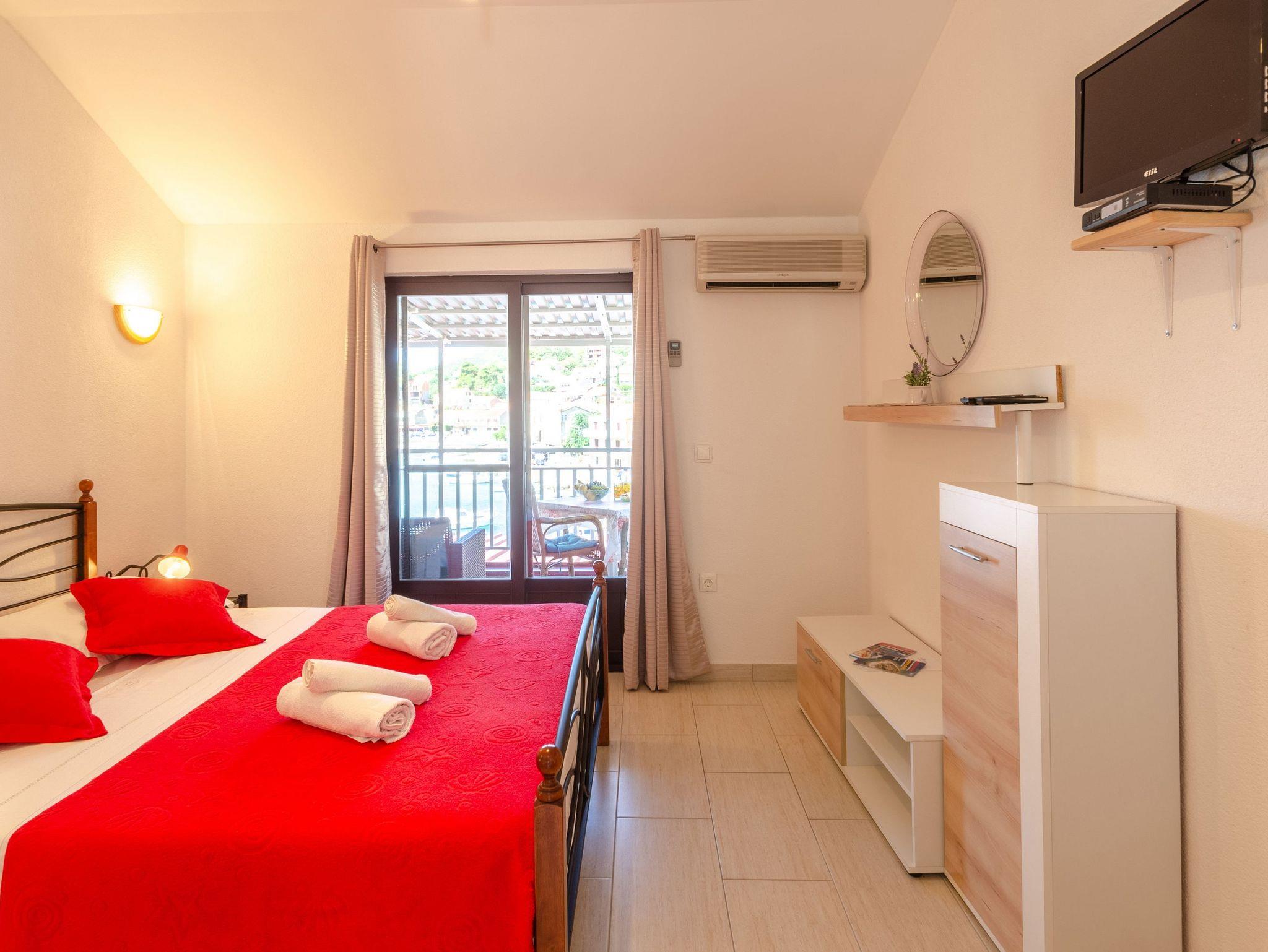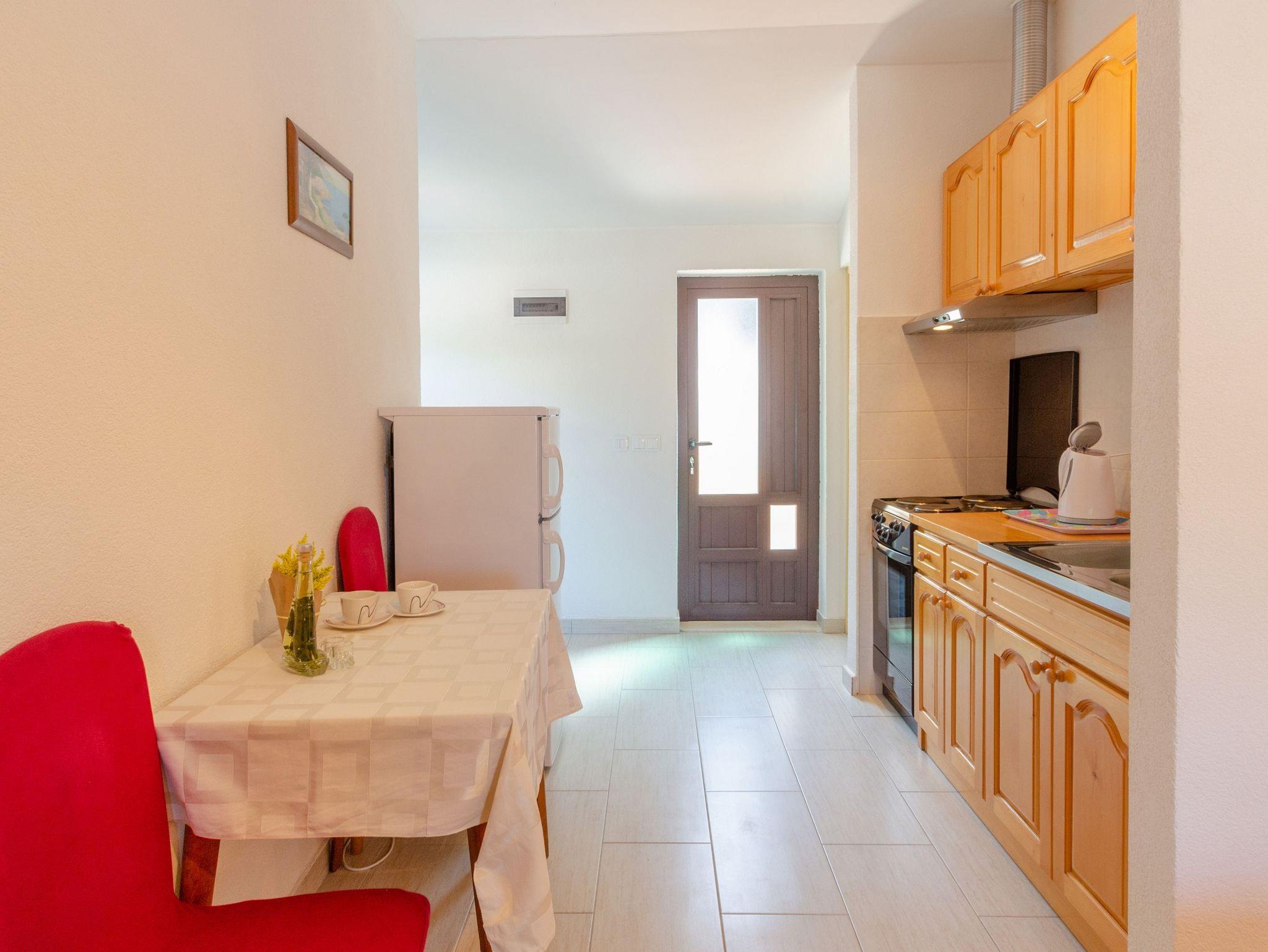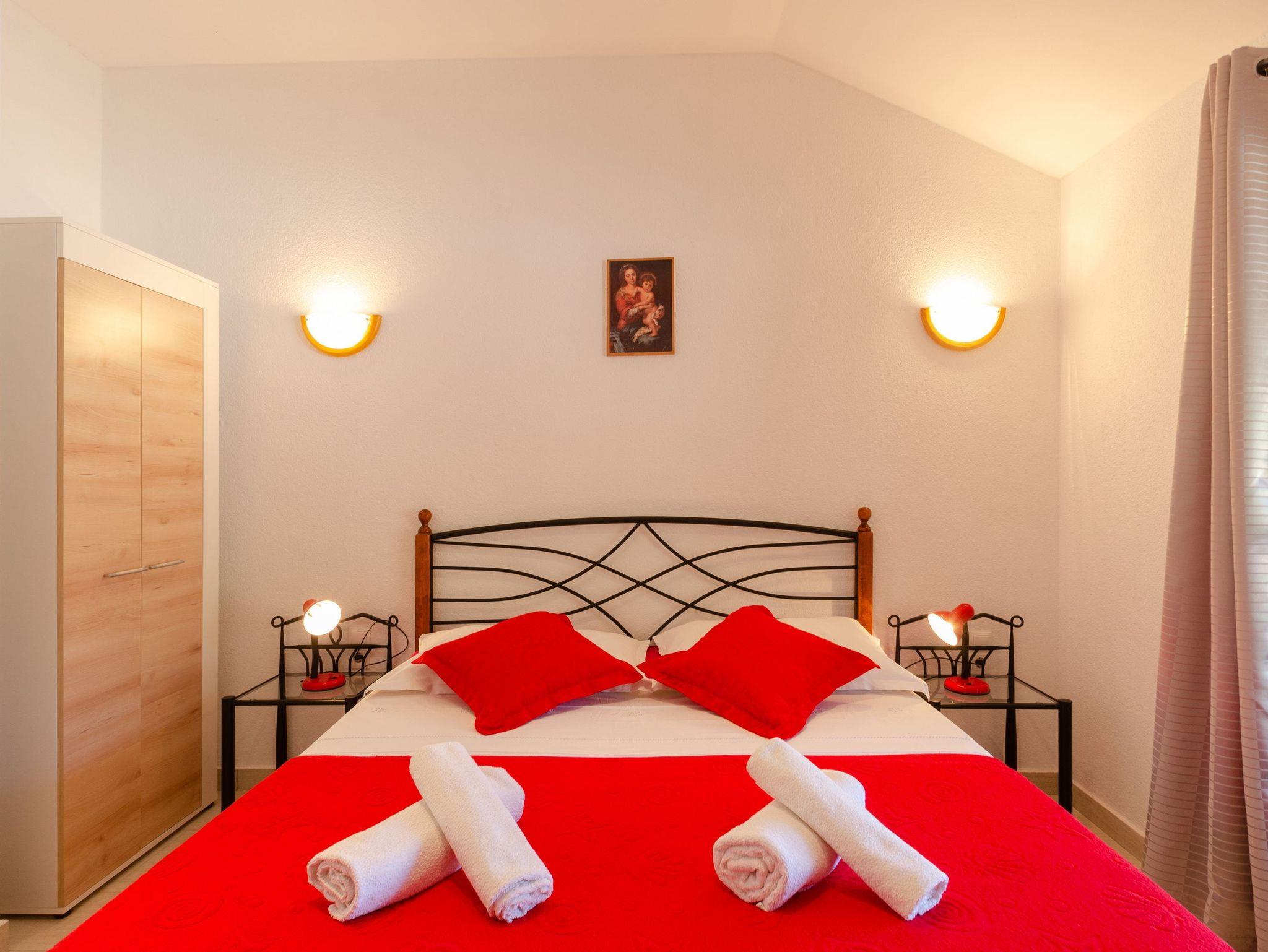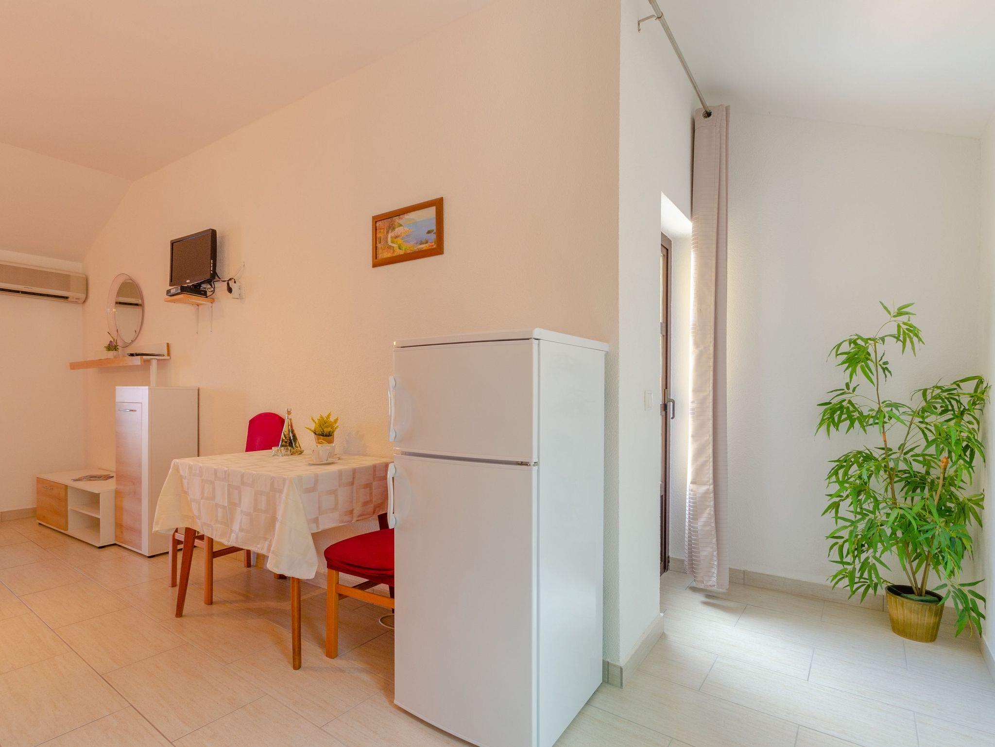 Studio bietet Platz für 2 Gäste. Die Betten sind in Schlafzimmern, die es 1 gibt, innerhalb einer Gesamtfläche von 21m2, angeordnet. Die Gäste haben eine eigene Terrasse zur Verfügung, auf der sie in warmen Sommernächten genießen können. Das Studio-Apartment bietet Meerblick. Es ist erlaubt, Speisen auf dem Gemeinschafts-Grill vorzubereiten. IM PREIS INBEGRIFFEN: Kurtaxe, Endreinigung, Parkplatz, Internet, Kinderbett, Bügeleisen, Bügelbrett, Föhn, tragbarer Grill. VERBINDLICHE ZUSÄTZLICHE KOSTEN: Aufzahlung für Kurzaufenthalte (prozentualer Zuschlag pro Nächtigungsanzahl: 30% - 1, 20% - 2, 10% - 3). UNVERBINDLICHE ZUSÄTZLICHE KOSTEN: Klimatisierung (5,00 € pro Nacht), Wäschewaschen (5,00 € Waschen), Bootsanlegeplatz (5,00 € pro Nacht). Die Verfügbarkeit zusätzlicher Dienstleistungen in Ihrem reservierten Termin und die Preise derselben (falls nicht aufgeführt) müssen im Voraus überprüft werden. Zusätzliche Dienstleistungen die in der Zahlungsaufforderung nicht aufgeführt sind werden direkt beim Vermieter bezahlt, angenommen der Gast nutzt auch diese. Ermäßigung auf den Grundpreis: Gratistag 14=13 (bei einem Aufenthalt von 14 Tagen oder mehr erhalten Sie einen Gratistag für den Aufenthalt bis 31.12.26).