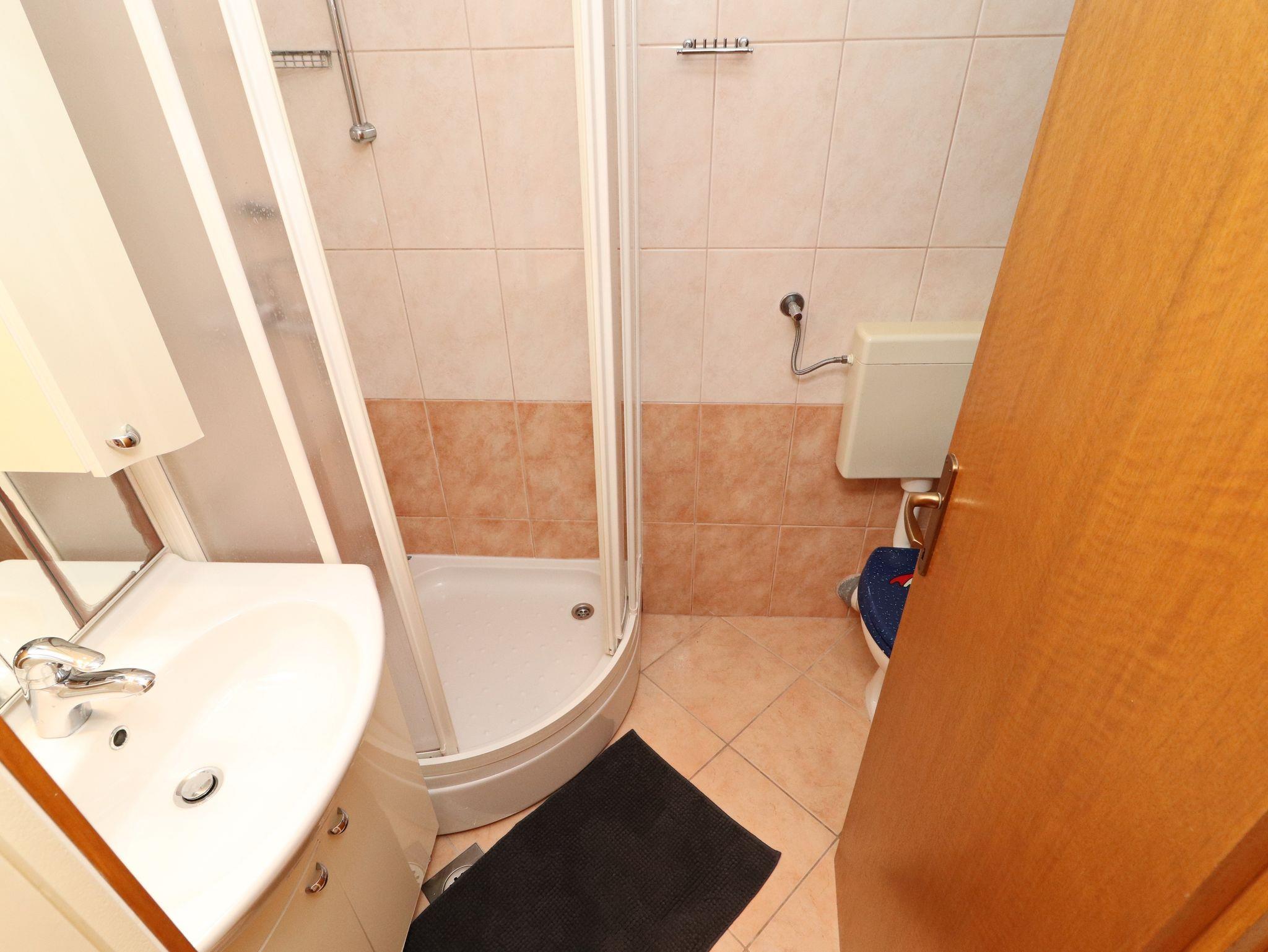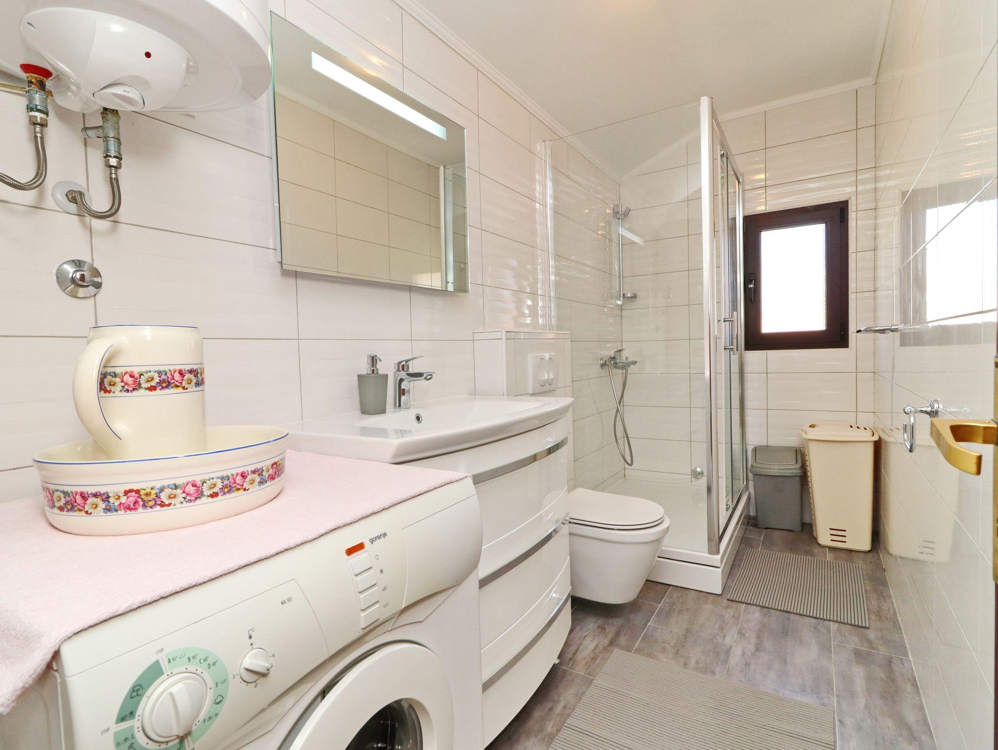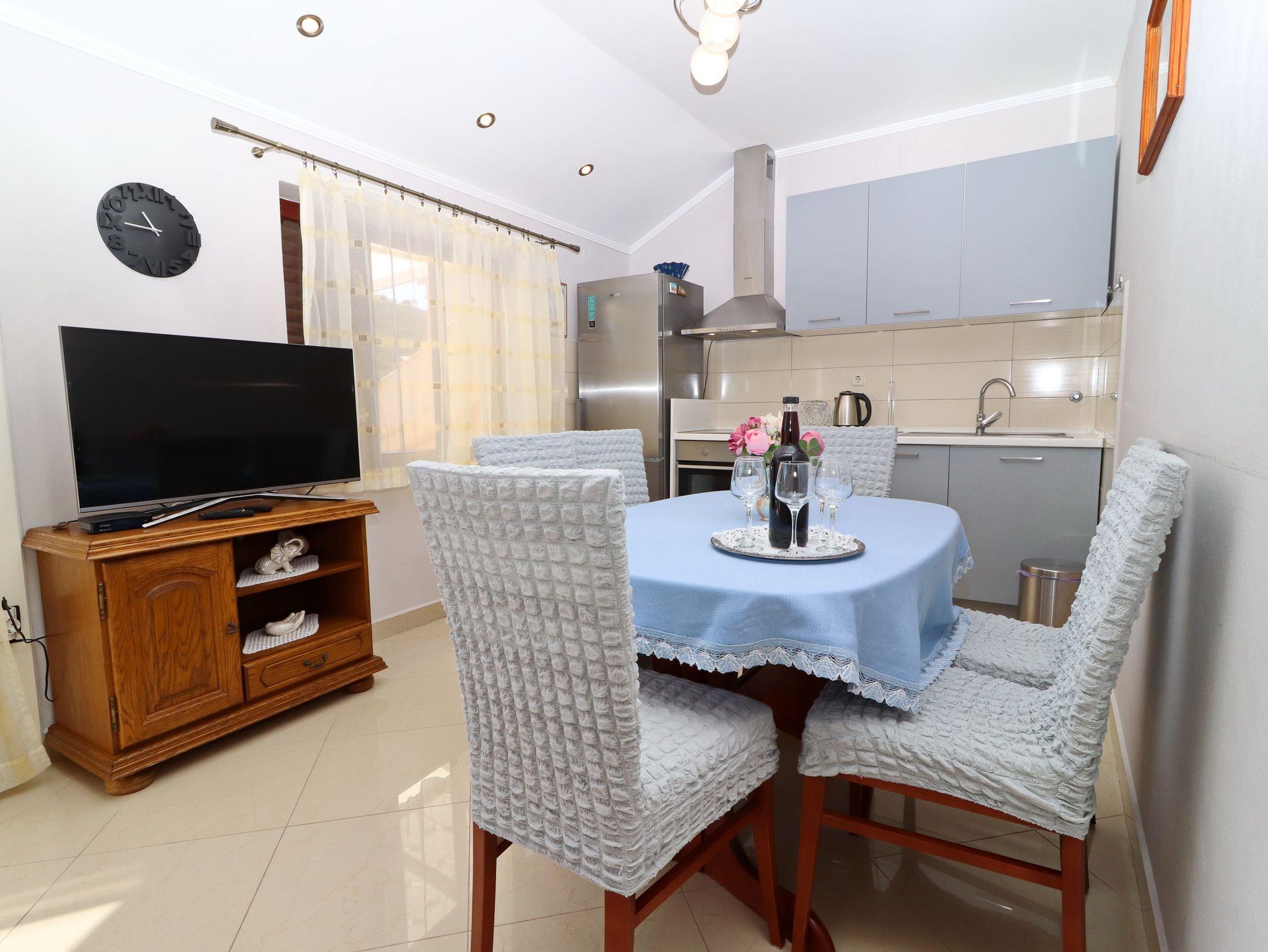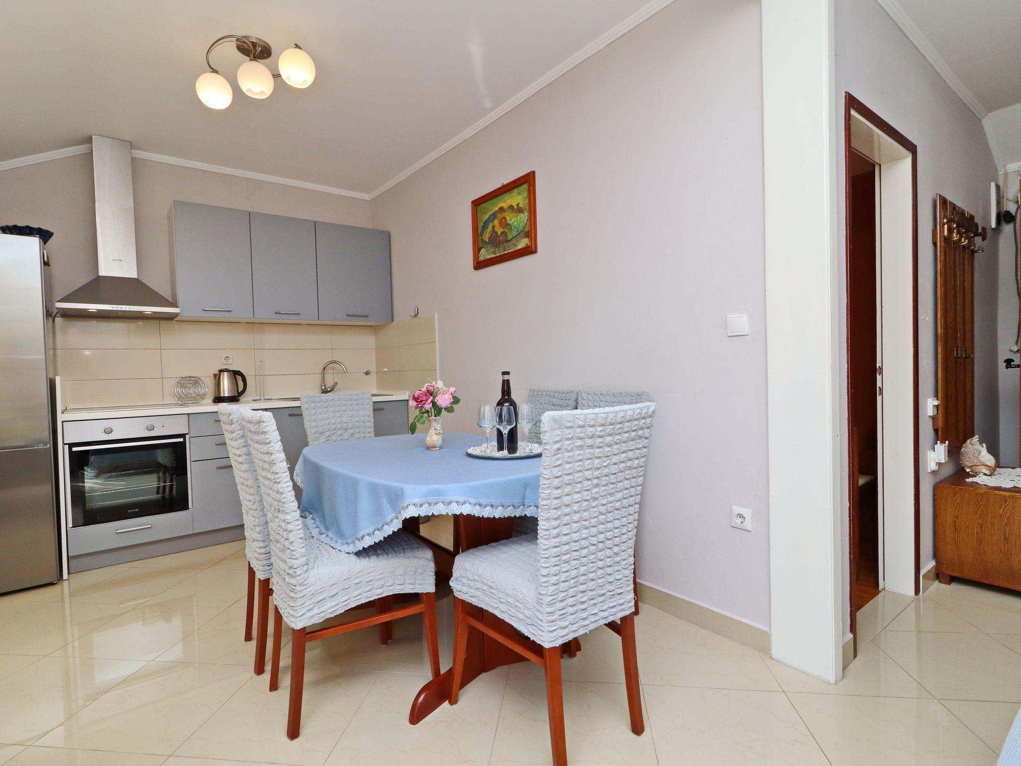 Ferienwohnung bietet Platz für 6 Gäste. Die Betten sind in Schlafzimmern, die es 3 gibt, innerhalb einer Gesamtfläche von 64m2, angeordnet. Die Gäste haben eine eigene Terrasse zur Verfügung, auf der sie in warmen Sommernächten genießen können. Das Apartment bietet Meerblick. Es ist erlaubt, Speisen auf dem Gemeinschafts-Grill vorzubereiten. IM PREIS INBEGRIFFEN: Kurtaxe, Endreinigung, Klimatisierung, Parkplatz, Internet, Bootsanlegeplatz, Bügeleisen, Bügelbrett. VERBINDLICHE ZUSÄTZLICHE KOSTEN: Aufzahlung für Kurzaufenthalte (prozentualer Zuschlag pro Nächtigungsanzahl: 30% - 1, 20% - 2, 10% - 3). Die Verfügbarkeit zusätzlicher Dienstleistungen in Ihrem reservierten Termin und die Preise derselben (falls nicht aufgeführt) müssen im Voraus überprüft werden. Zusätzliche Dienstleistungen die in der Zahlungsaufforderung nicht aufgeführt sind werden direkt beim Vermieter bezahlt, angenommen der Gast nutzt auch diese.