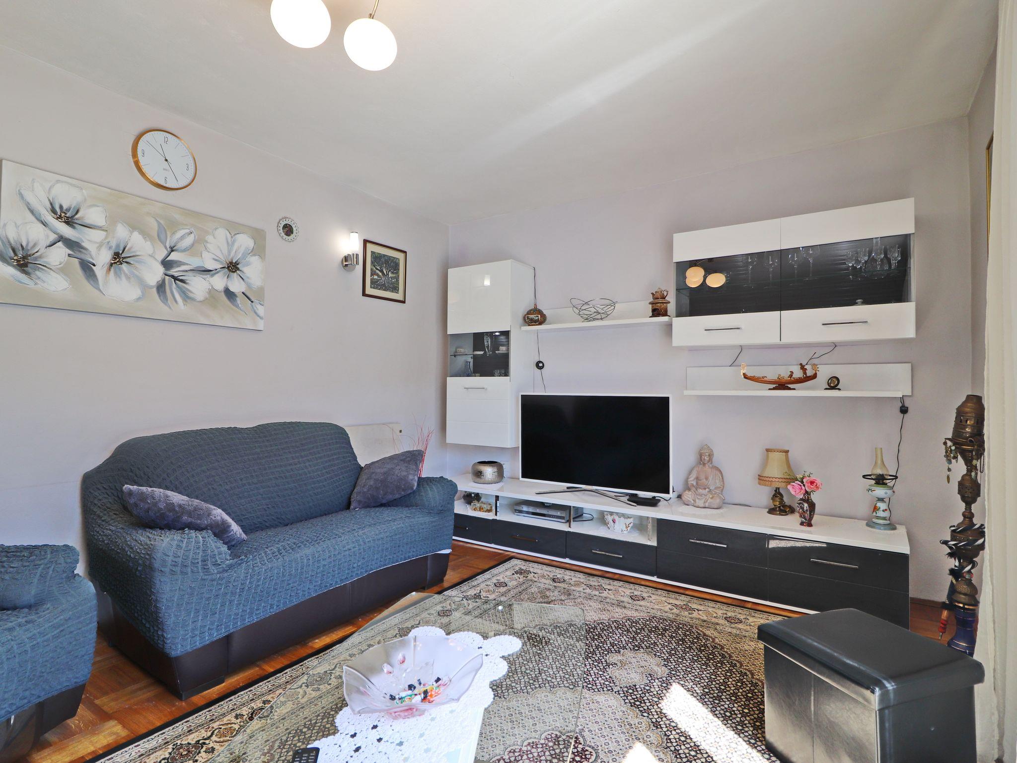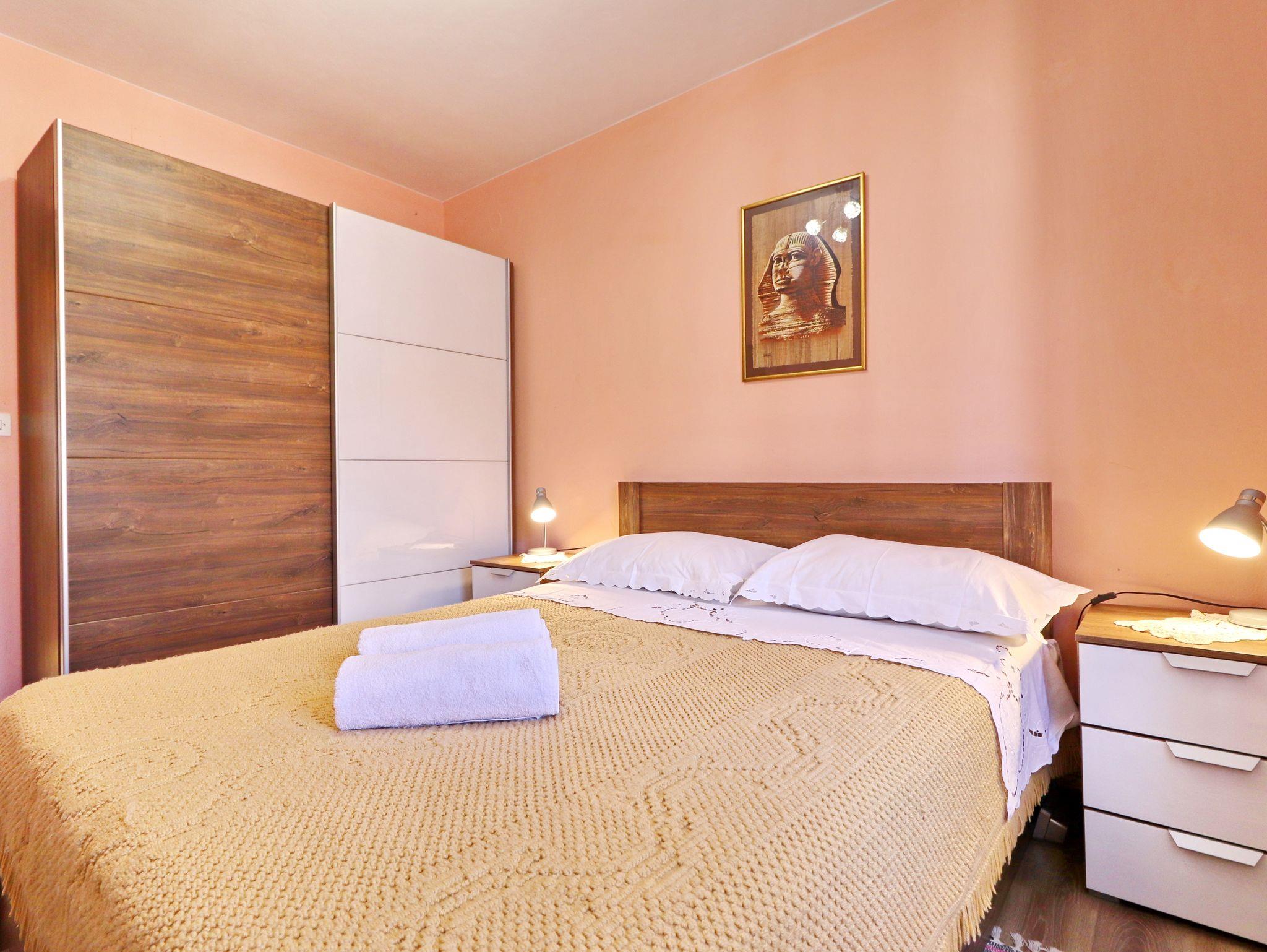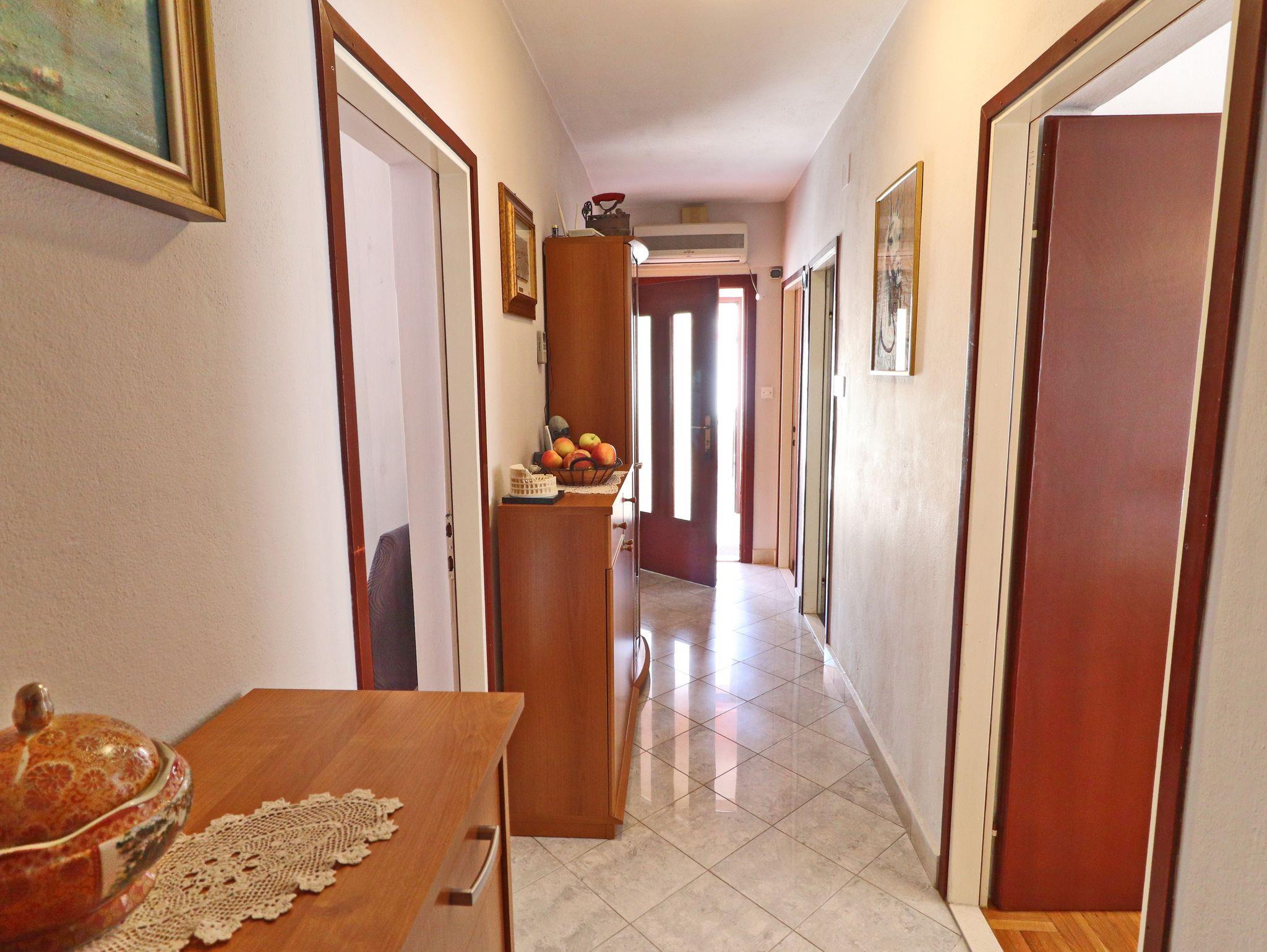Ferienwohnung bietet Platz für 7 Gäste. Die Betten sind in Schlafzimmern, die es 3 gibt, und in Wohnzimmer, innerhalb einer Gesamtfläche von 85m2, angeordnet. Die Gäste haben eine eigene Terrasse zur Verfügung, auf der sie in warmen Sommernächten genießen können. Das Apartment bietet Meerblick. Es ist erlaubt, Speisen auf dem Gemeinschafts-Grill vorzubereiten. IM PREIS INBEGRIFFEN: Kurtaxe, Endreinigung, Klimatisierung, Parkplatz, Internet, Bootsanlegeplatz, Bügeleisen, Bügelbrett. VERBINDLICHE ZUSÄTZLICHE KOSTEN: Aufzahlung für Kurzaufenthalte (prozentualer Zuschlag pro Nächtigungsanzahl: 30% - 1, 20% - 2, 10% - 3). Die Verfügbarkeit zusätzlicher Dienstleistungen in Ihrem reservierten Termin und die Preise derselben (falls nicht aufgeführt) müssen im Voraus überprüft werden. Zusätzliche Dienstleistungen die in der Zahlungsaufforderung nicht aufgeführt sind werden direkt beim Vermieter bezahlt, angenommen der Gast nutzt auch diese.