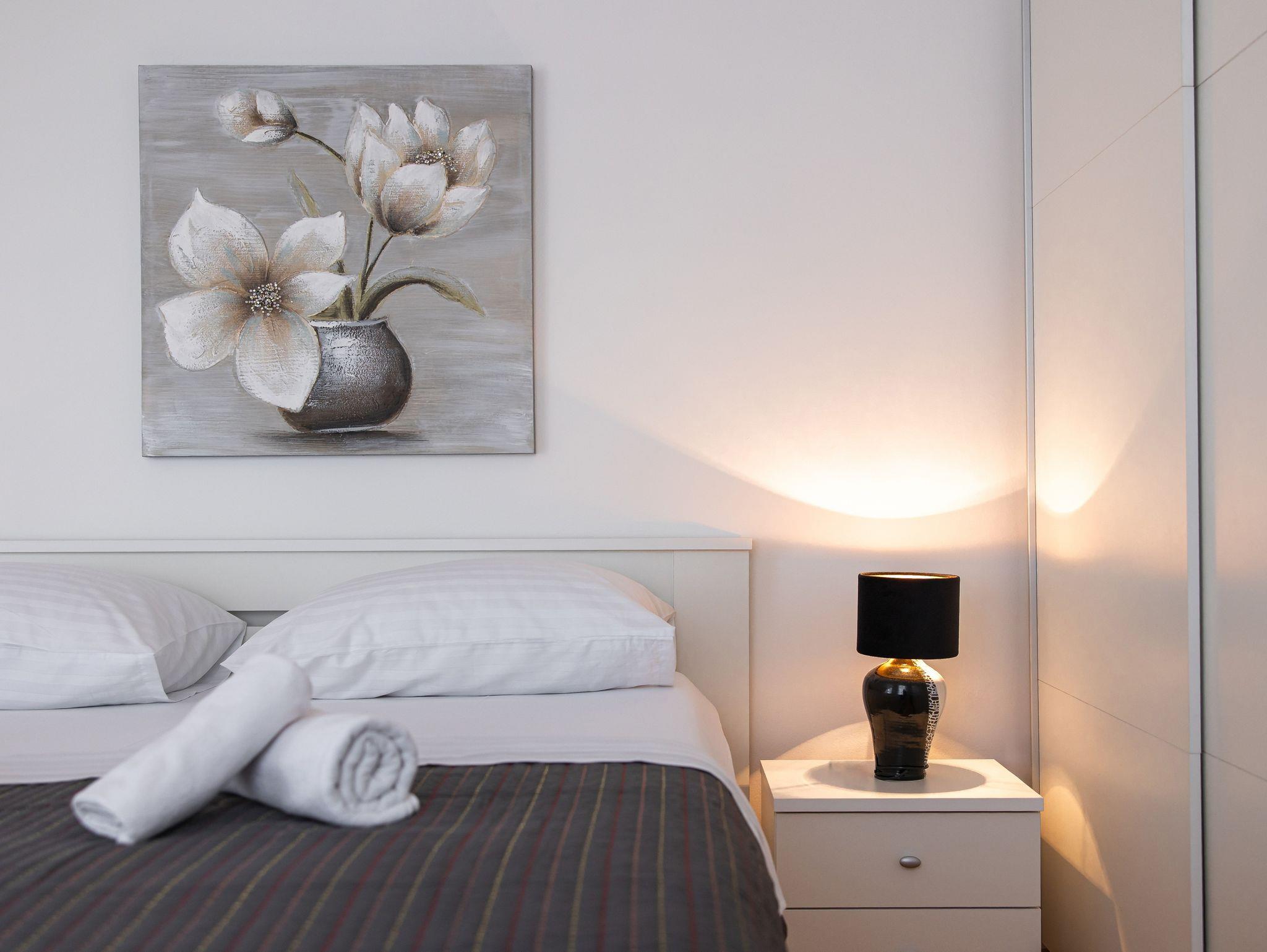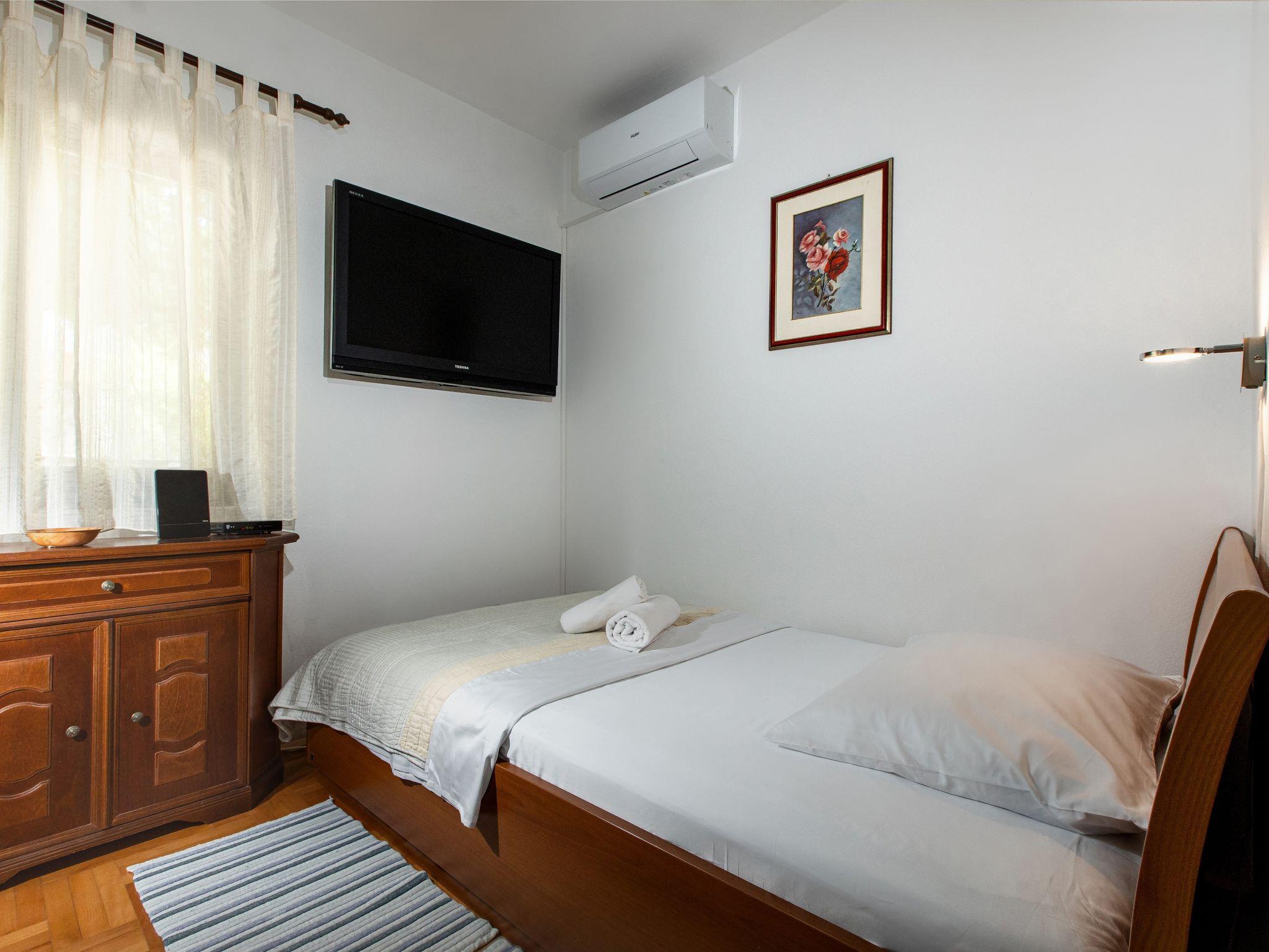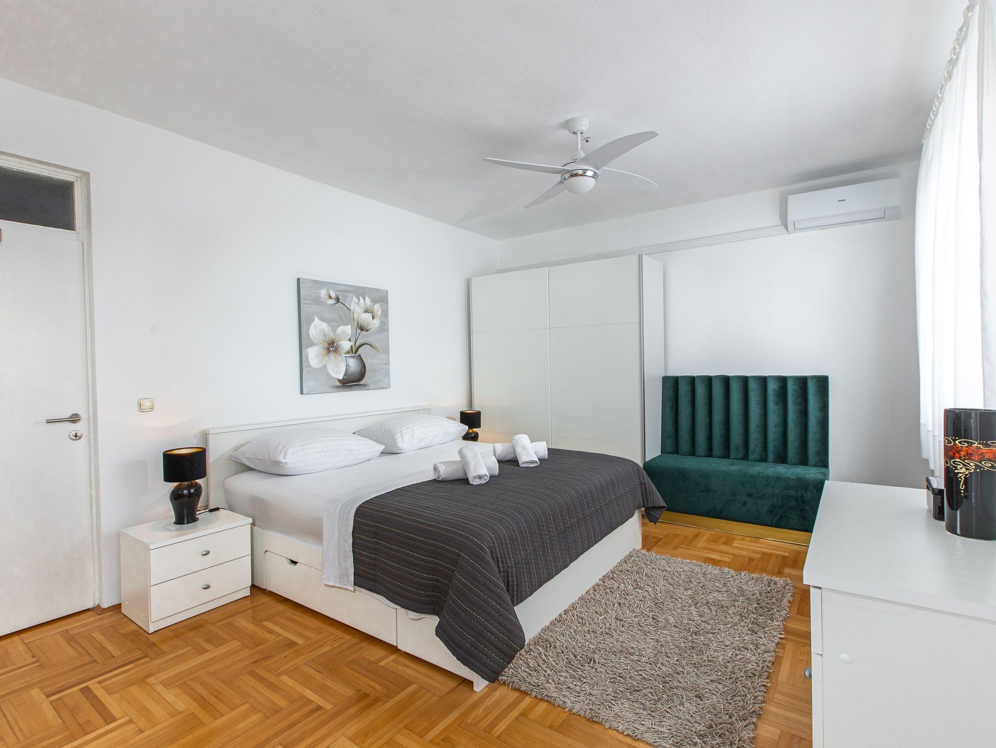 Haus bietet Platz für 8 Gäste. Die Betten sind in Schlafzimmern, die es 4 gibt, und in Wohnzimmer, innerhalb einer Gesamtfläche von 126m2, angeordnet. Die Gäste haben einen eigenen Balkon zur Verfügung, auf der sie in warmen Sommernächten genießen können. Für vollen Genuss und Entspannung gibt es einen privaten Grill für Gäste dieser Unterkunft. Während ihres Aufenthalts können Gäste das gemeinsam zur Nutzung stehende Schwimmbad benutzen. Räume der gebuchten Unterkunftseinheit werden nicht in eine Ganze verbunden. IM PREIS INBEGRIFFEN: Kurtaxe, Endreinigung, Klimatisierung, Pool, Parkplatz, Garage, Internet, Bügeleisen, Bügelbrett, Föhn. Die Verfügbarkeit zusätzlicher Dienstleistungen in Ihrem reservierten Termin und die Preise derselben (falls nicht aufgeführt) müssen im Voraus überprüft werden. Zusätzliche Dienstleistungen die in der Zahlungsaufforderung nicht aufgeführt sind werden direkt beim Vermieter bezahlt, angenommen der Gast nutzt auch diese.