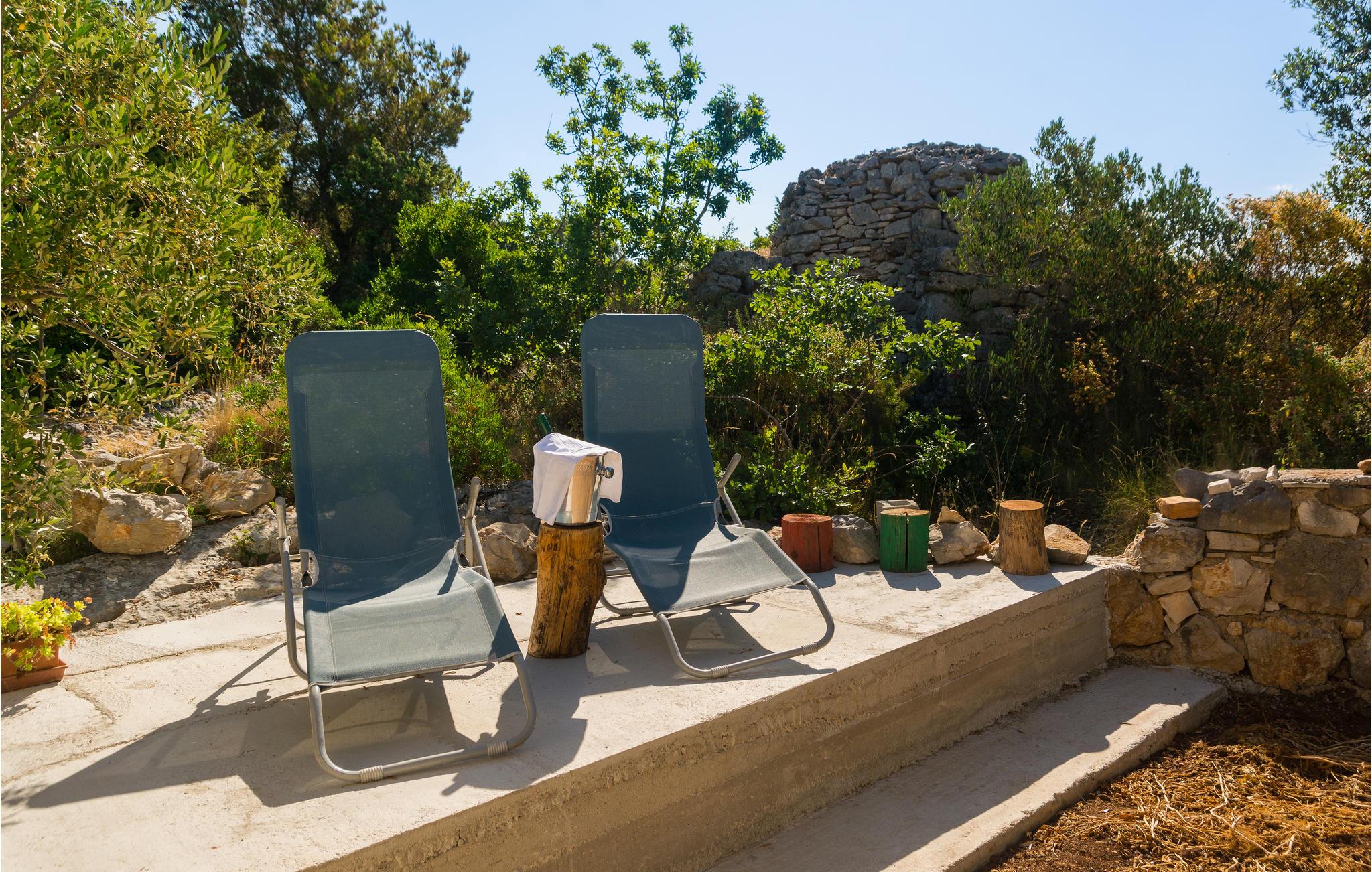Udenfor venter en rummelig terrasse med panoramaudsigt over havet og de omkringliggende øer. Nyd morgenmaden udenfor eller afslut dagen med et glas vin på dette skønne sted. Poolområdet med liggestole, omgivet af oliventræer og rustikke stenvægge, giver afkøling.