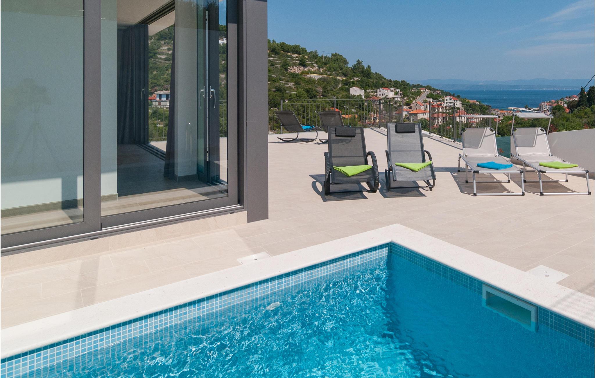 Fra den store terrasse er der en betagende udsigt til havet og omgivelserne. Den forfriskende pool og området med grill og havemøbler medvirker til jeres velbefindende, mens de mange legeredskaber i haven indbyder til timevis med sjov og underholdning for familiens yngste.