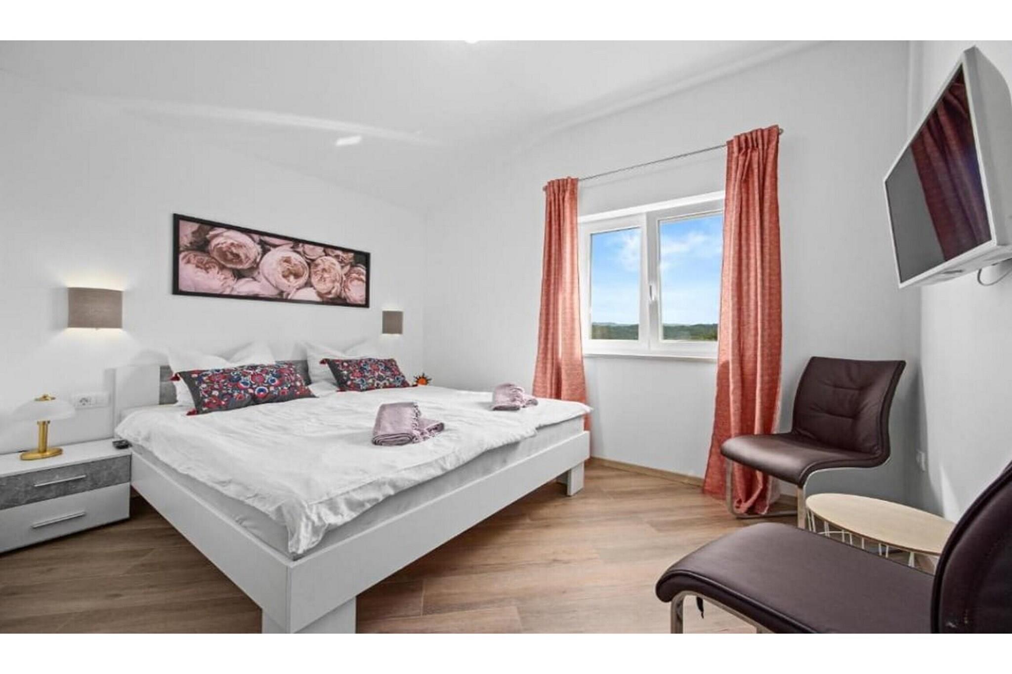 The villa i Sovinjak har 3 soveværelse(r) og kapacitet til 6 person(er). Bolig på 150 m² nice og er moderne, med udsigt til have og swimming pool. Er beliggende 0 m fra busstationen, 2 km from the restaurant "Konoba Santa Terra, Sovinjak", 7 km fra byen "Buzet", 7 km fra supermarkedet "Buzet", 30 km fra vandland "Istralandia", 35 km fra stenstranden "Beach Karpinjan, Novigrad", 36 km fra naturparken "Ucka Nature Park", 38 km fra floden "Mirna River", 40 km fra togstationen "Pazin Train Station", 45 km fra vandland "Aquacolors", 50 km fra forlystelsesparken "Dino Park Funtana", 85 km fra lufthavnen "Airport Pula", 86 km fra lufthavnen "Airport Trieste", 98 km fra lufthavnen "Aiprort Rijeka- Island of Krk" og er beliggende i en ideel for familier område og i flotte omgivelser. Tilbyder have, terrassemøbler, indhegnet grund, 15 m² terrasse, vaskemaskine, grill, strygejern, internet (wifi), hårtørrer, altan, varmepumpe, aircondition, swimming pool privat, conditionned swimming pool privat, utildækket parkering til den samme bygning, TV, satellit (Sprog: Engelsk, Tysk). The amerikanske køkken, på keramiske kogeplader, med service og køleskab, mikroovn, ovn, fryser, opvaskemaskine, tallerkener/bestik, køkkenredskaber, kaffemaskine, brødrister og kedel.