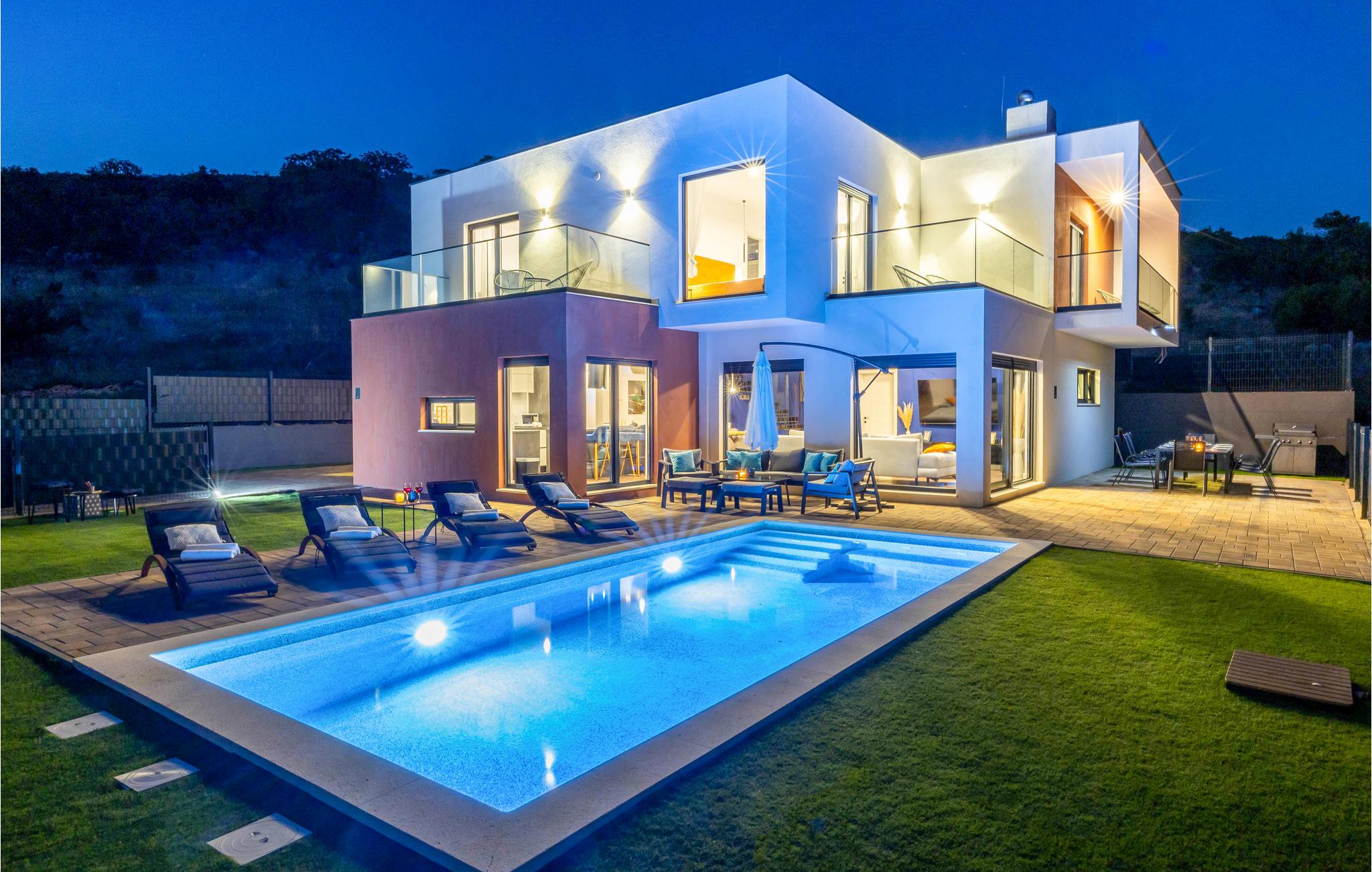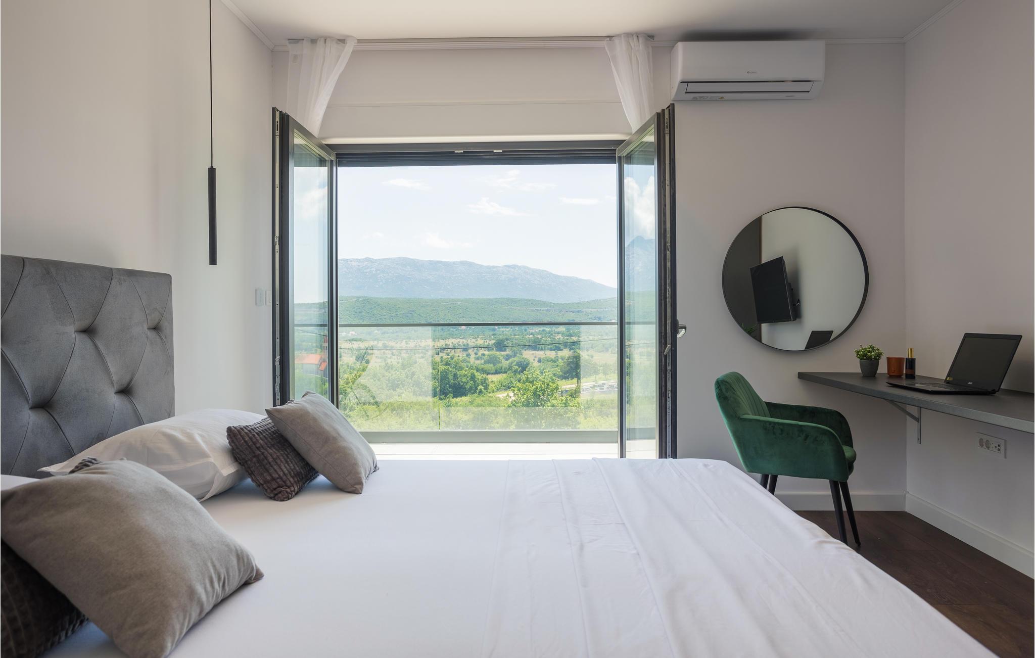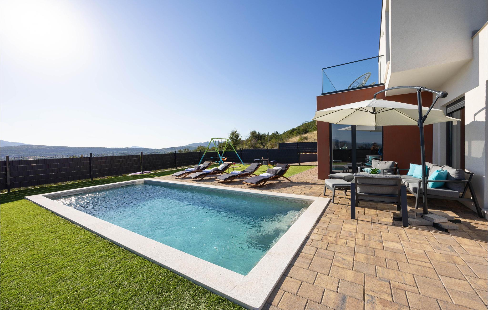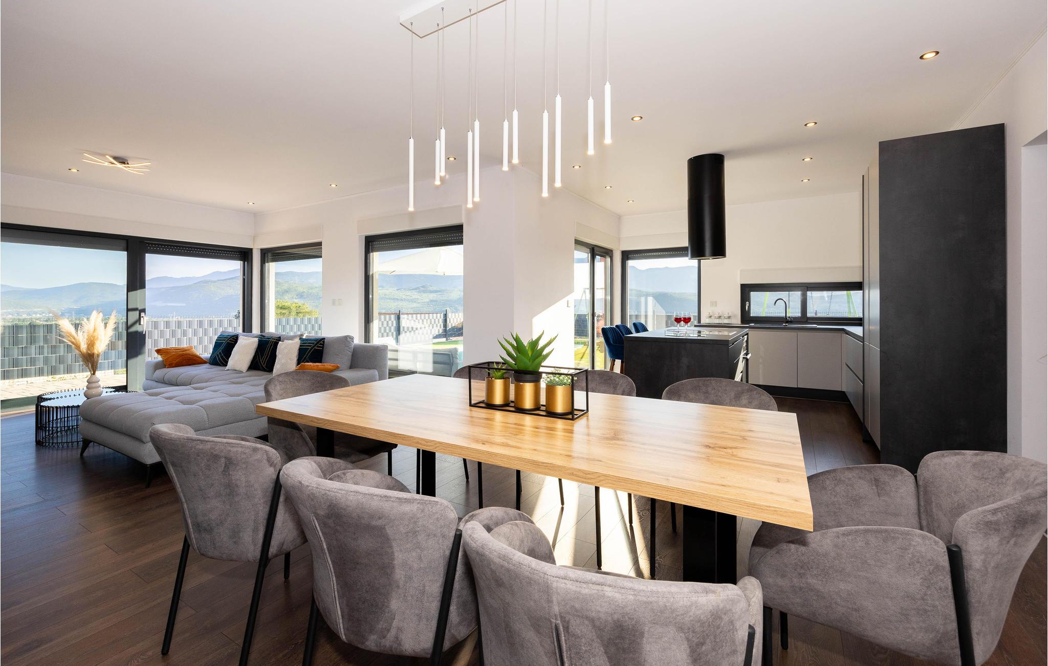 Det idylliske og rolige hus har en fantastisk panoramisk beliggenhed. Her kan I virkelig slappe af og nyde freden og roen og den smukke udsigt over landskabet. Gulv til loft panoramavinduer giver jer mulighed for fuldt ud at nyde udsigten i huset, poolbord og fitnessudstyr sørger for, at I bliver godt underholdt på ferien.