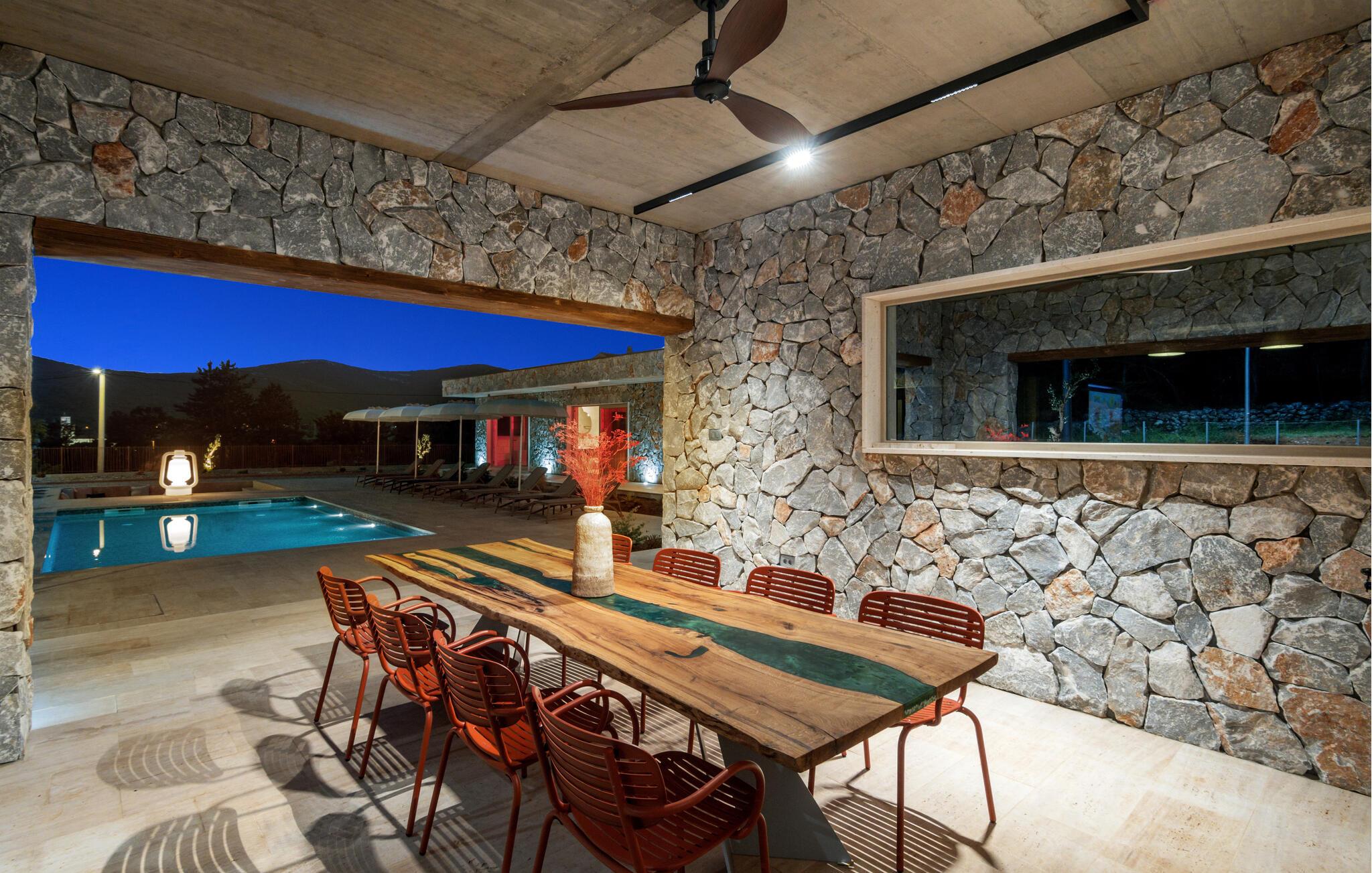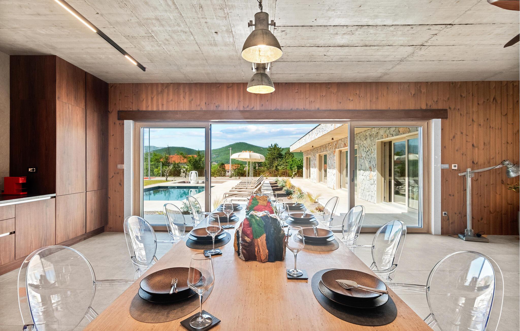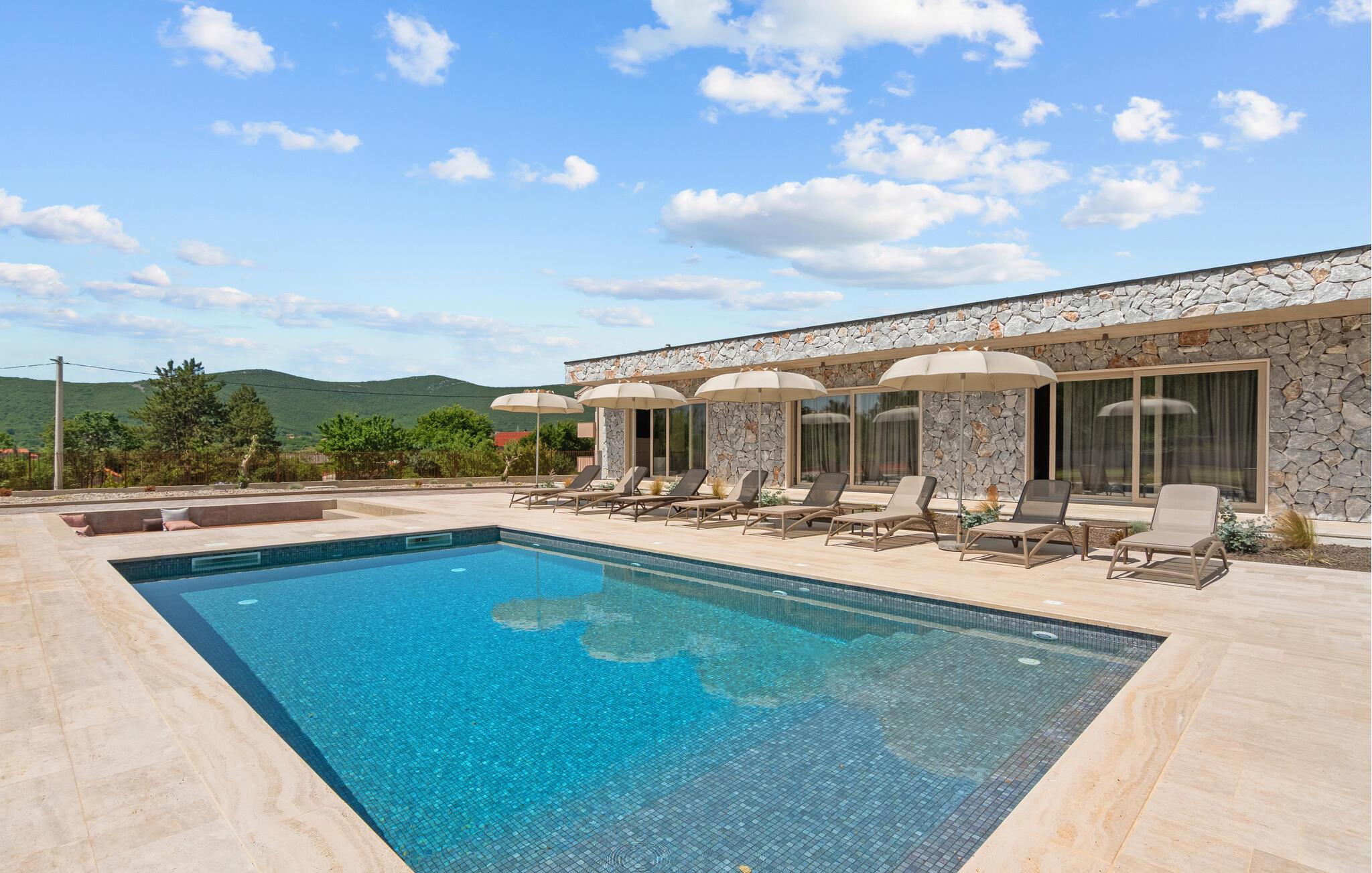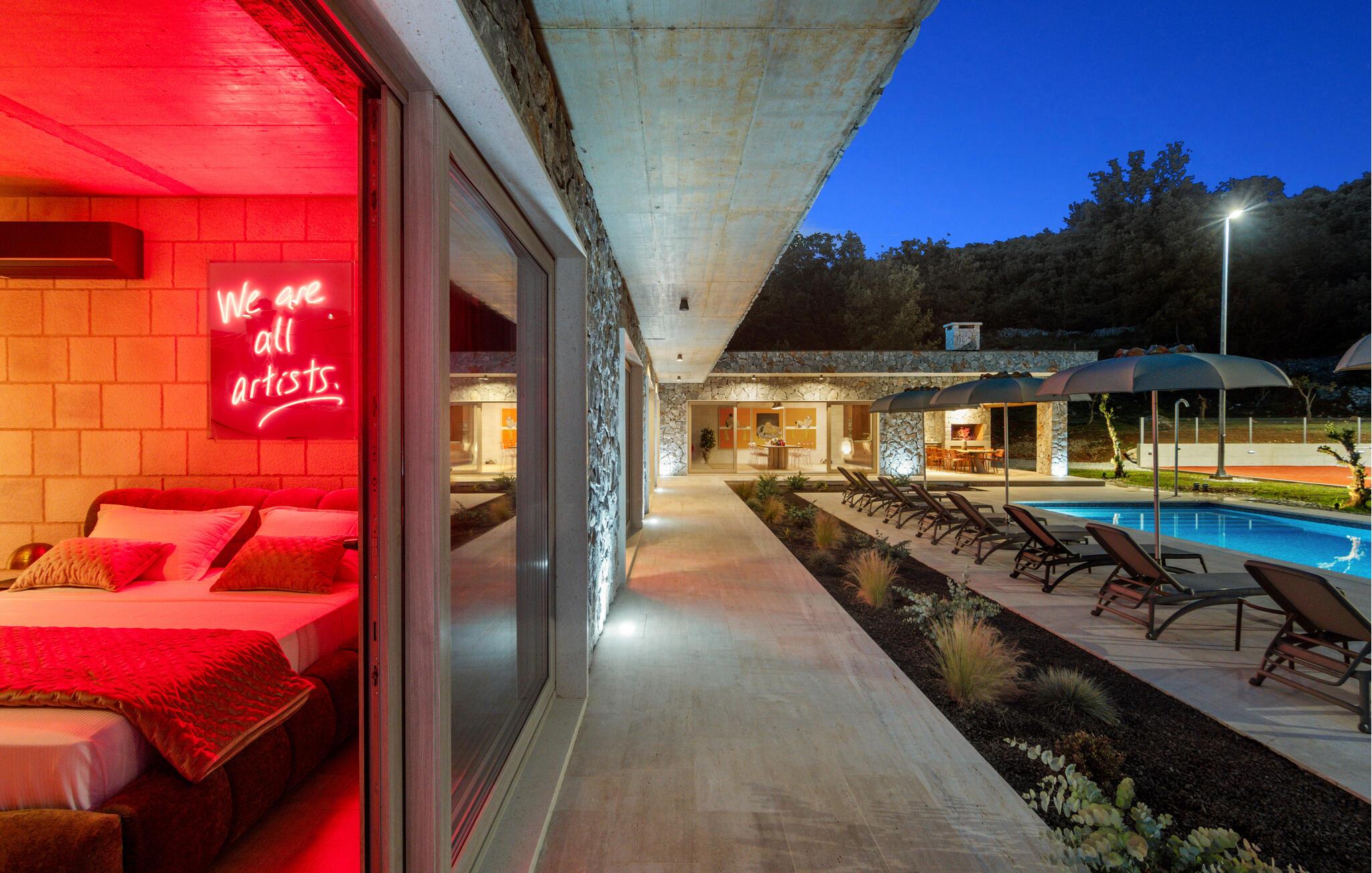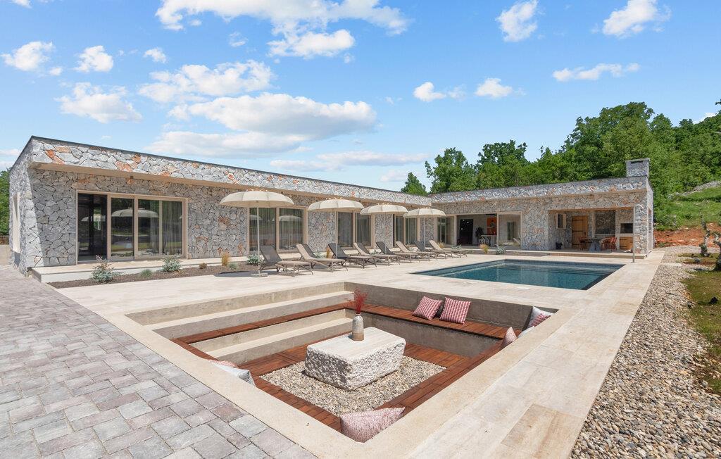 Denne moderne villa i ét plan forkæler jer med adskillige ekstrafaciliteter og et stilfuldt møbleret interiør. Ekstravagante detaljer og gennemtænkt belysning skaber en behagelig opholdsstemning. Fremtryll kulinariske højdepunkter i det åbne køkken og fejr måltiderne med udsigt over poolen. Et rummeligt sofaområde lægger op til hyggelige filmaftener og sociale spilleaftener.