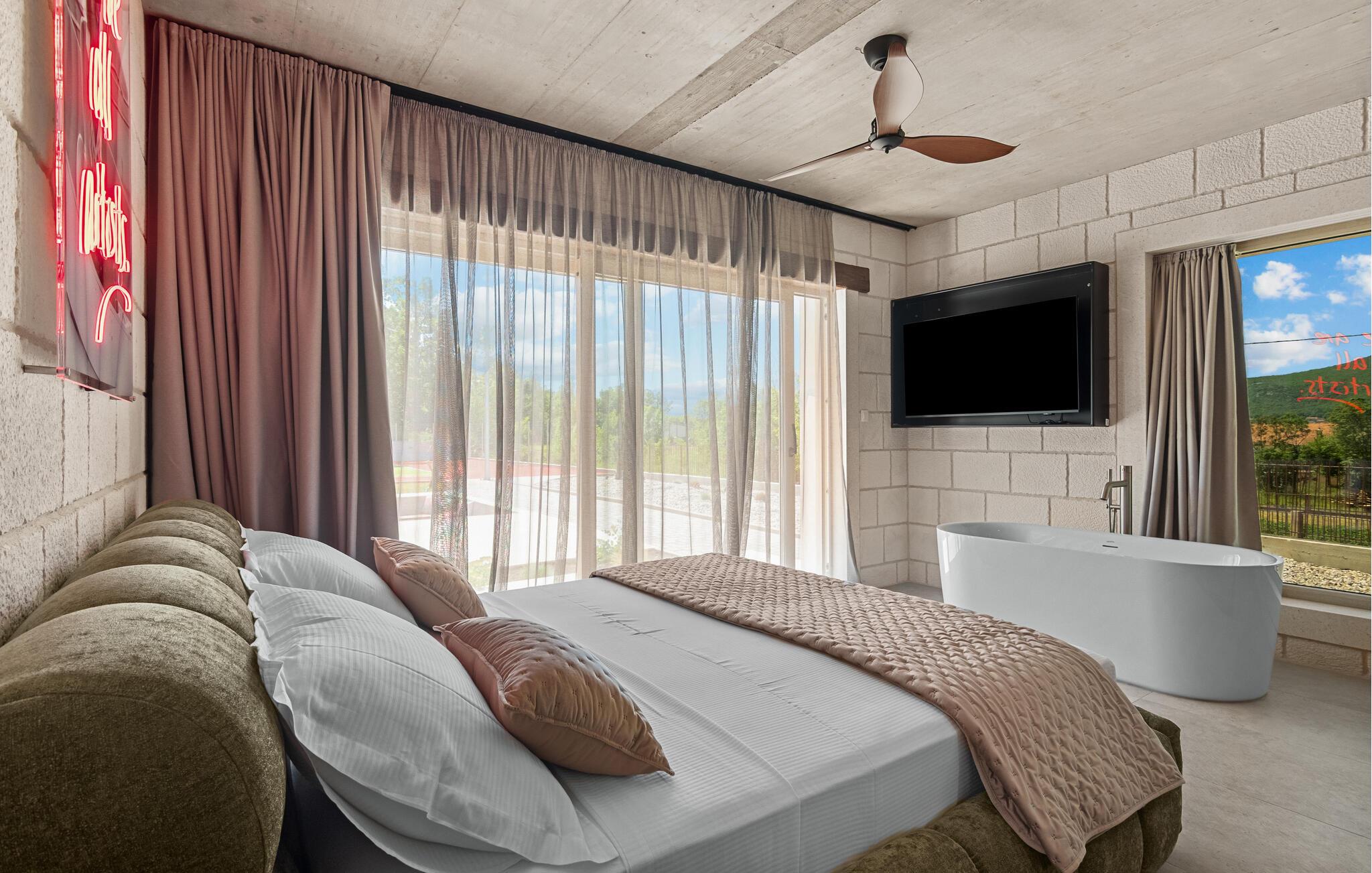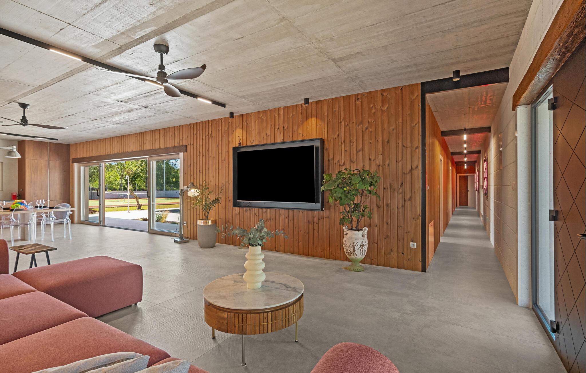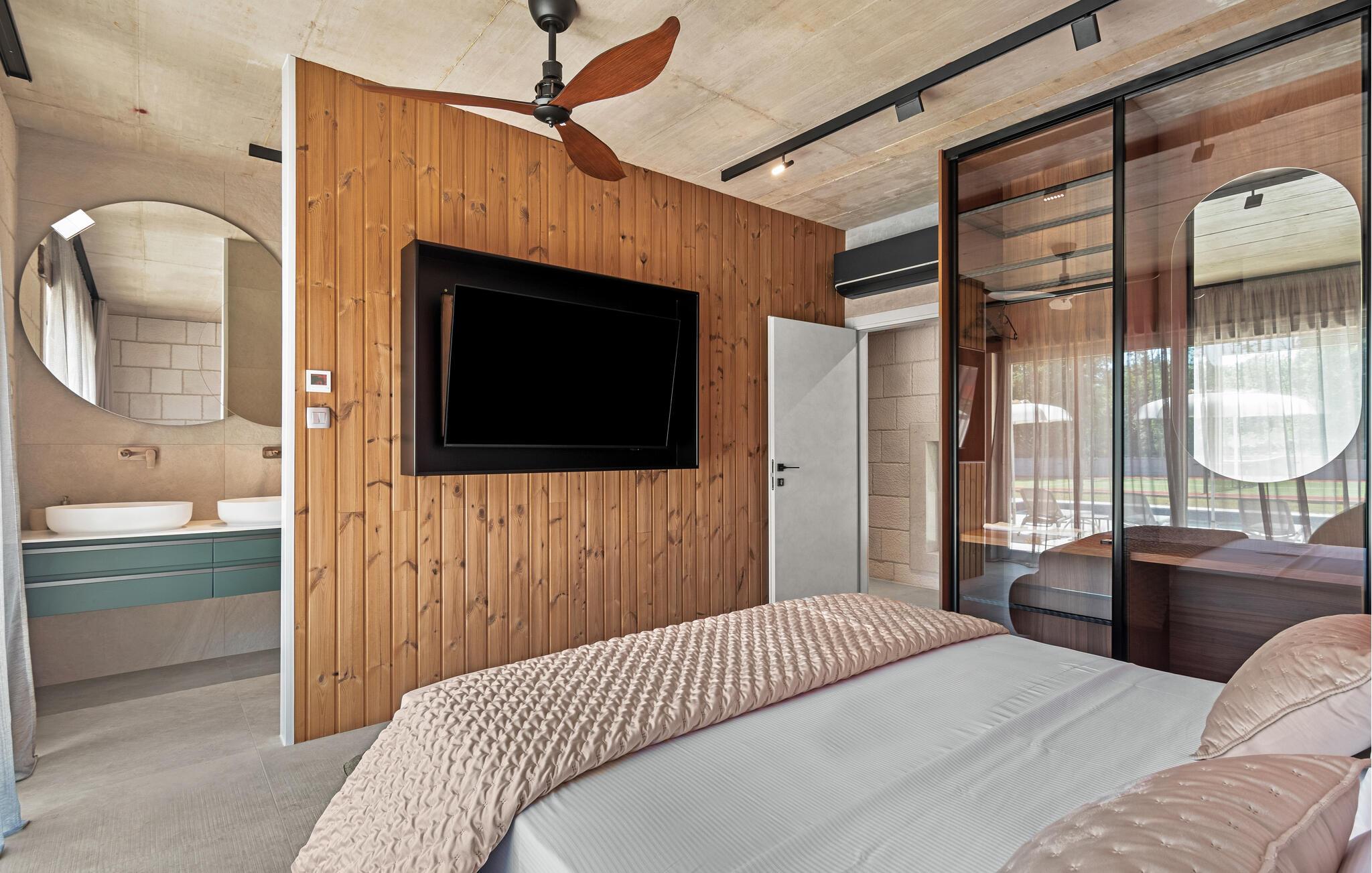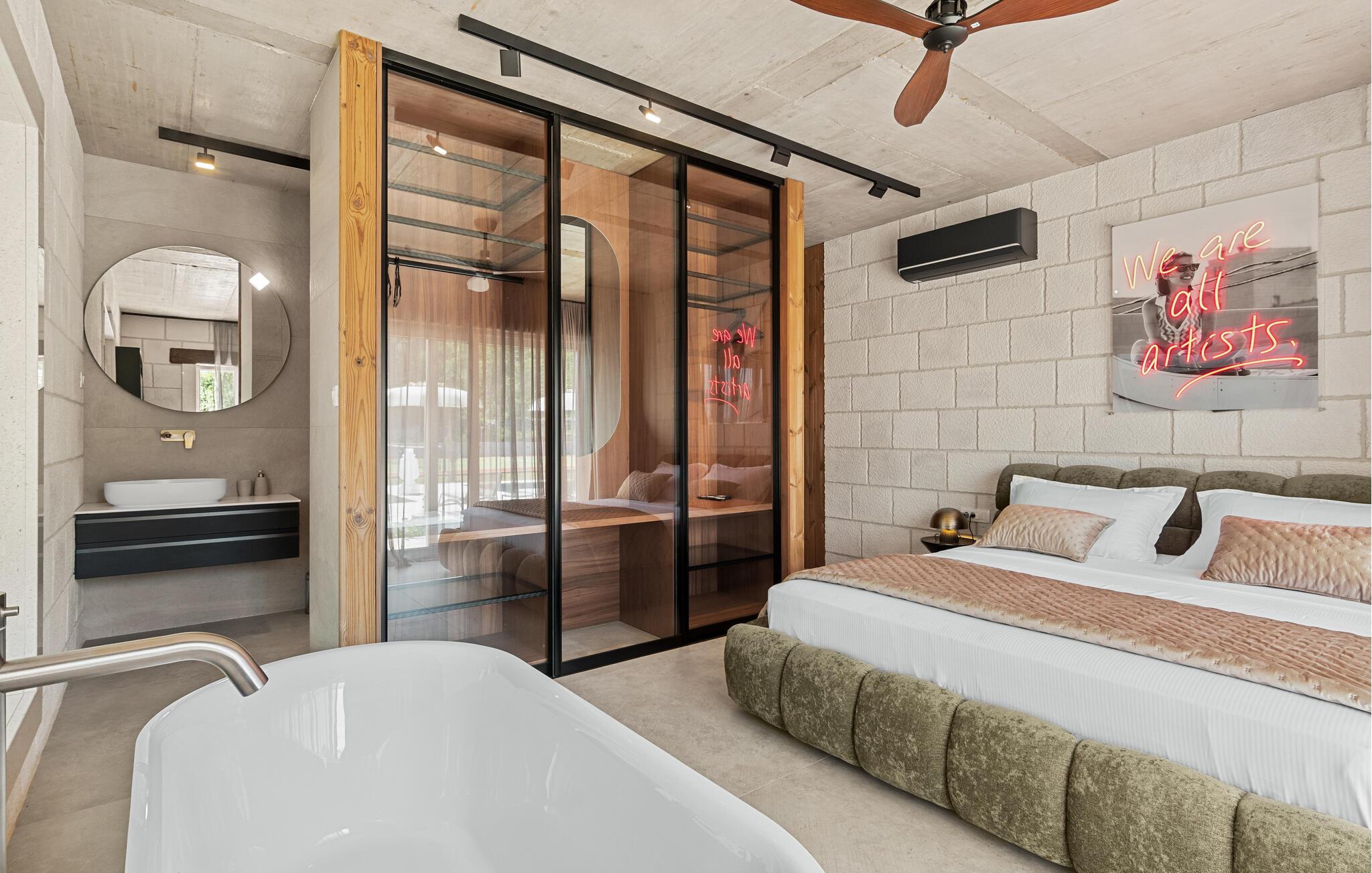 Denne moderne villa i ét plan forkæler jer med adskillige ekstrafaciliteter og et stilfuldt møbleret interiør. Ekstravagante detaljer og gennemtænkt belysning skaber en behagelig opholdsstemning. Fremtryll kulinariske højdepunkter i det åbne køkken og fejr måltiderne med udsigt over poolen. Et rummeligt sofaområde lægger op til hyggelige filmaftener og sociale spilleaftener.