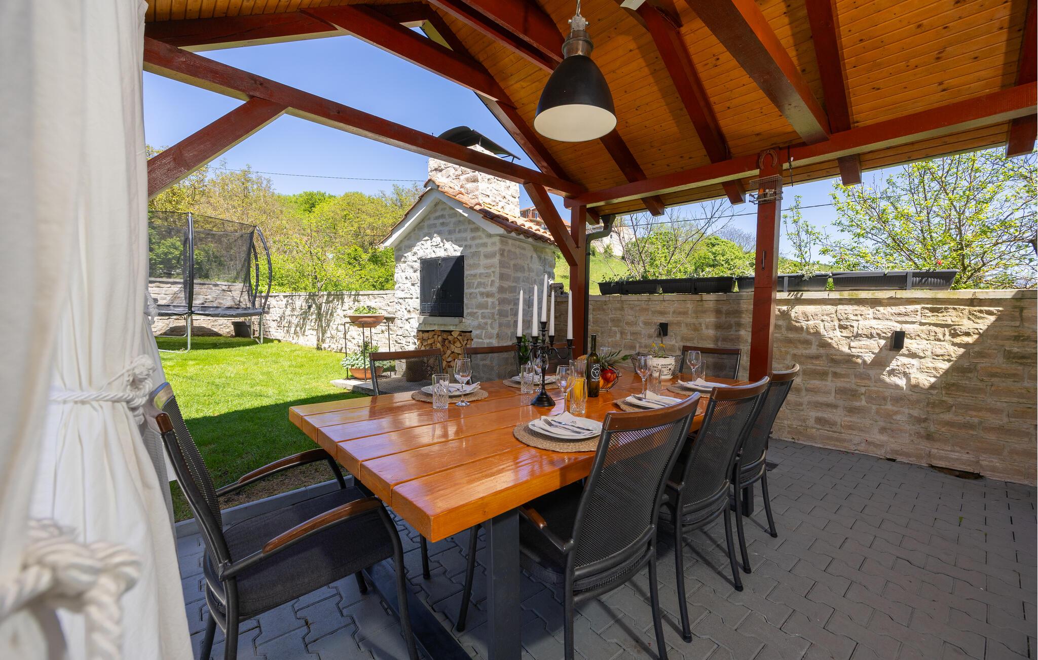 Udendørsområdet er alsidigt og designet til at nyde middelhavsklimaet fuldt ud. Start dagen med en forfriskende dukkert i poolen, nyd solen på liggestolene, og brug stengrillen til en hyggelig barbecue om aftenen, mens børnene leger fodbold eller badminton på den velplejede græsplæne.