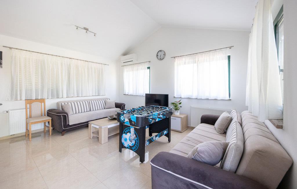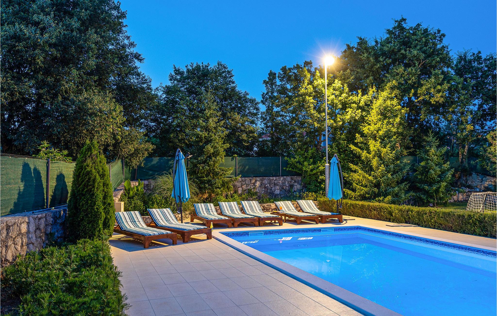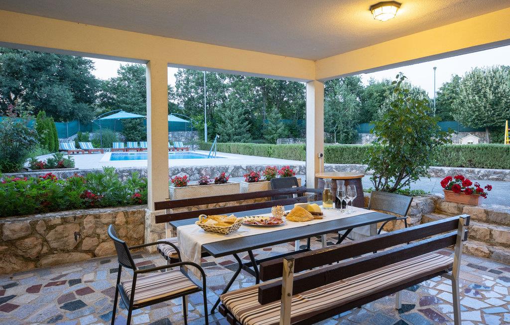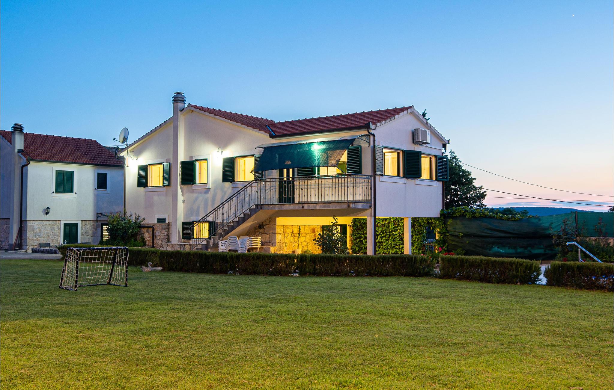 Dette skønne og rummelige feriehus ligger i udkanten af byen Split nær den lille by Trilj. Husets etager er forbundet med både inden- og udendørs trapper. I stueplan ligger det store køkken i åben forbindelse med stuen, hvorfra der er udgang til den overdækkede terrasse og til poolen med hydromassagedyser. På øverste etage ligger soveværelserne samt et aktivitetsrum med muligheder som bordfodbold. Der er store vinduesflader med skøn udsigt. I haven er der lys der kan tændes om aftenen, og her kan I sidde og nyde de lange lune nætter. Til rådighed er også et traditionelt indrettet grillhus og en grønsagshave. Trilj er kendt for sine mange restauranter. I kan også prøve at rafte på floden Cetina (også for børn). I nærheden kan I bestille terapeutiske ridetrimer.