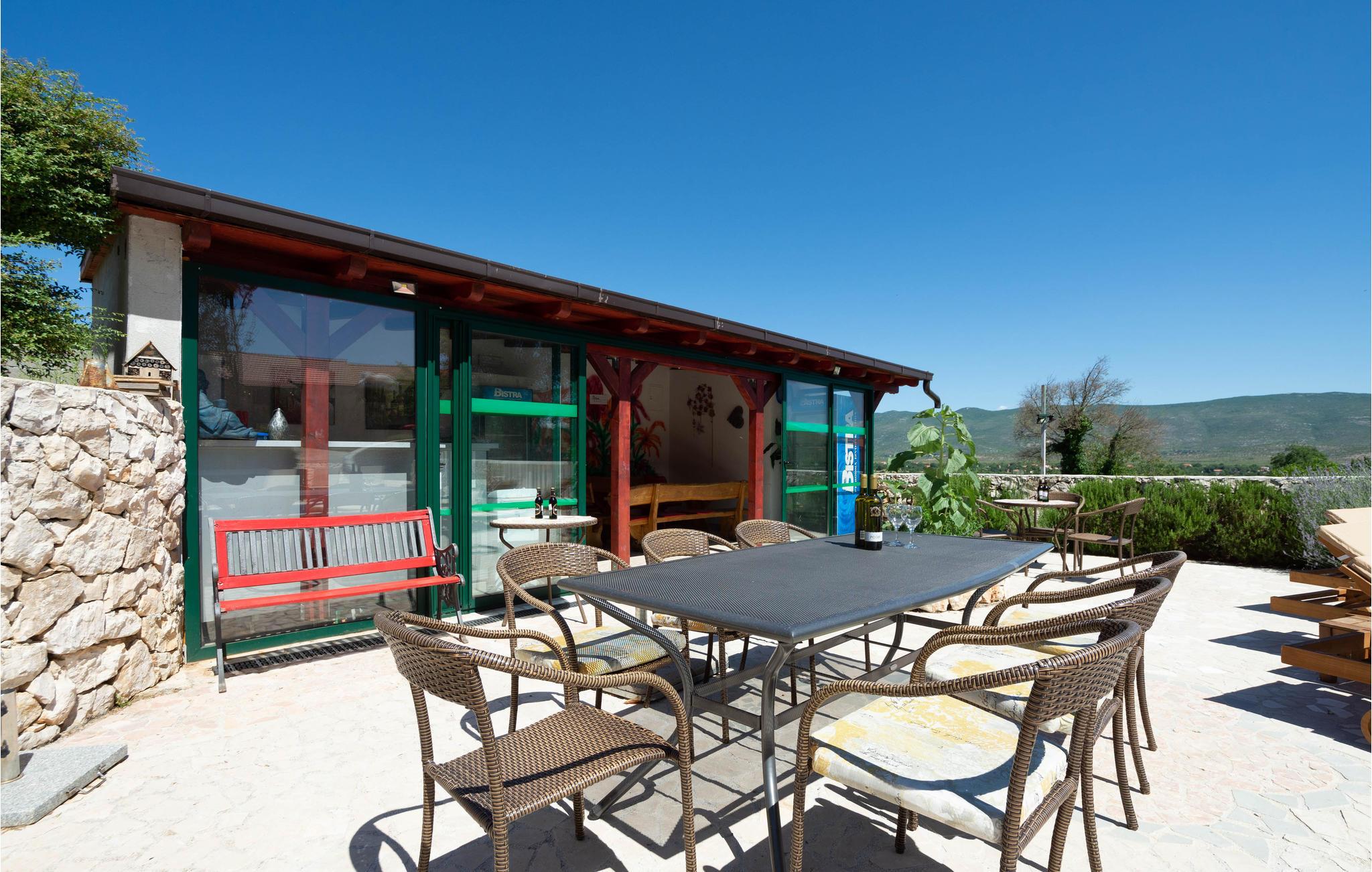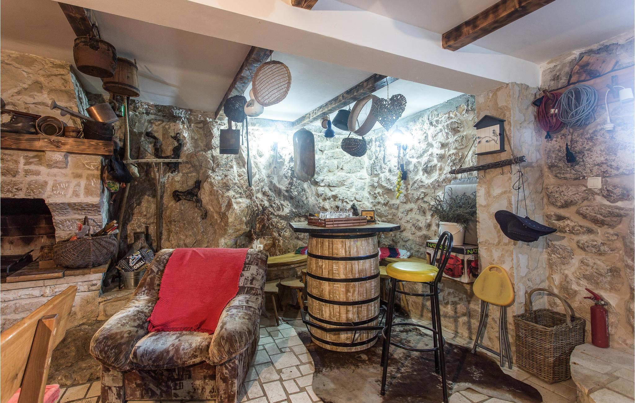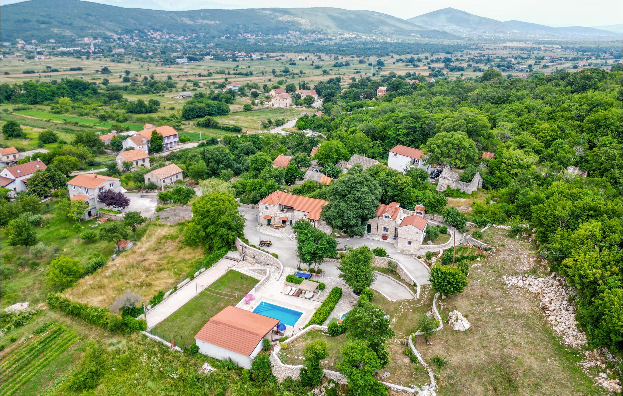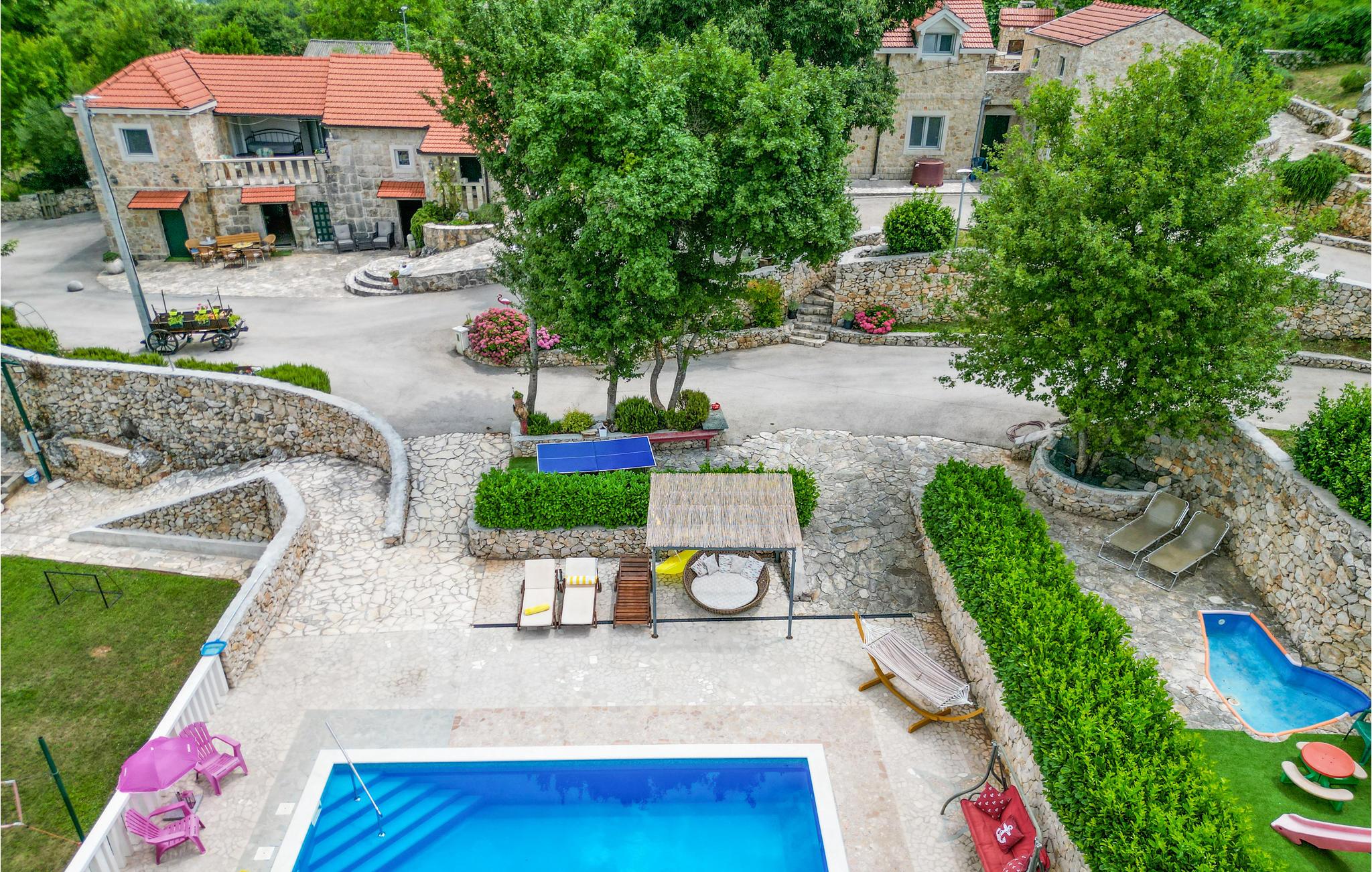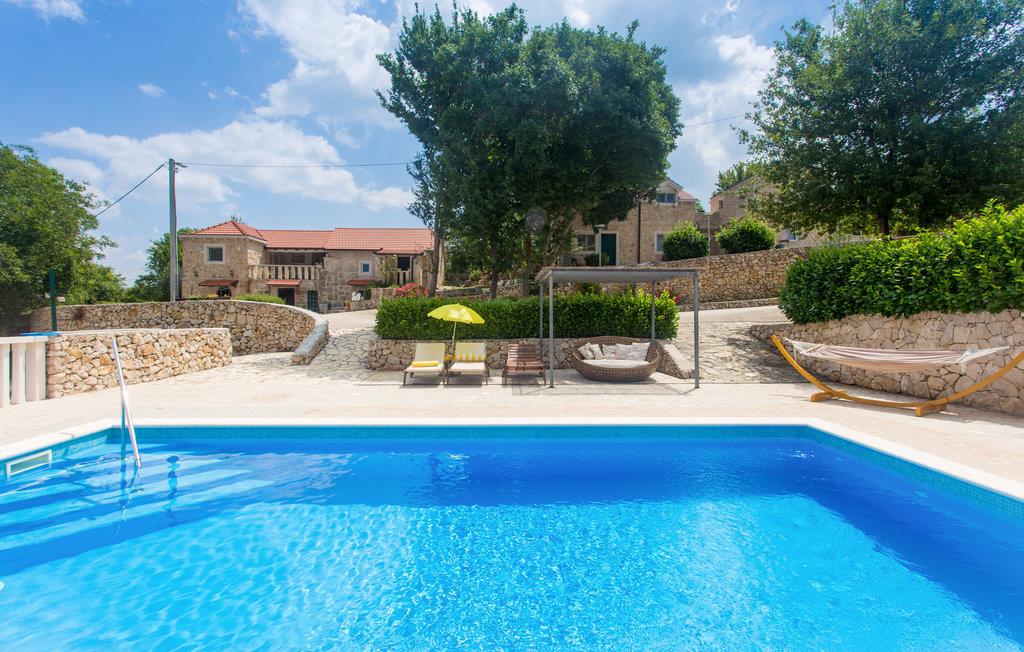 En gang en gammel stenejendom, er dette feriehus nu renoveret lyst og i autentisk dalmatisk stil og tilpasset alle moderne behov. Det består af tre indretninger i et. I stueetagen venter stuen med gammel dalmatisk taverne med pejs, ideelt til hyggeligt samvær, og i overetagen venter en stor stue og soveværelser. Kun få trin derfra er der yderligere to bygninger, en med to lejligheder, forbundet med ydertrapper, og den anden er udlagt som soveværelse med badeværelse. Der er også en stor pool, omgivet af grøn vegetation, med meget underholdning, skønt udformede solterrasser og herlig udsigt til det dalmatiske baglands landskab. Besøg byen Split og nyd en tur igennem Diokletians historiske palads.