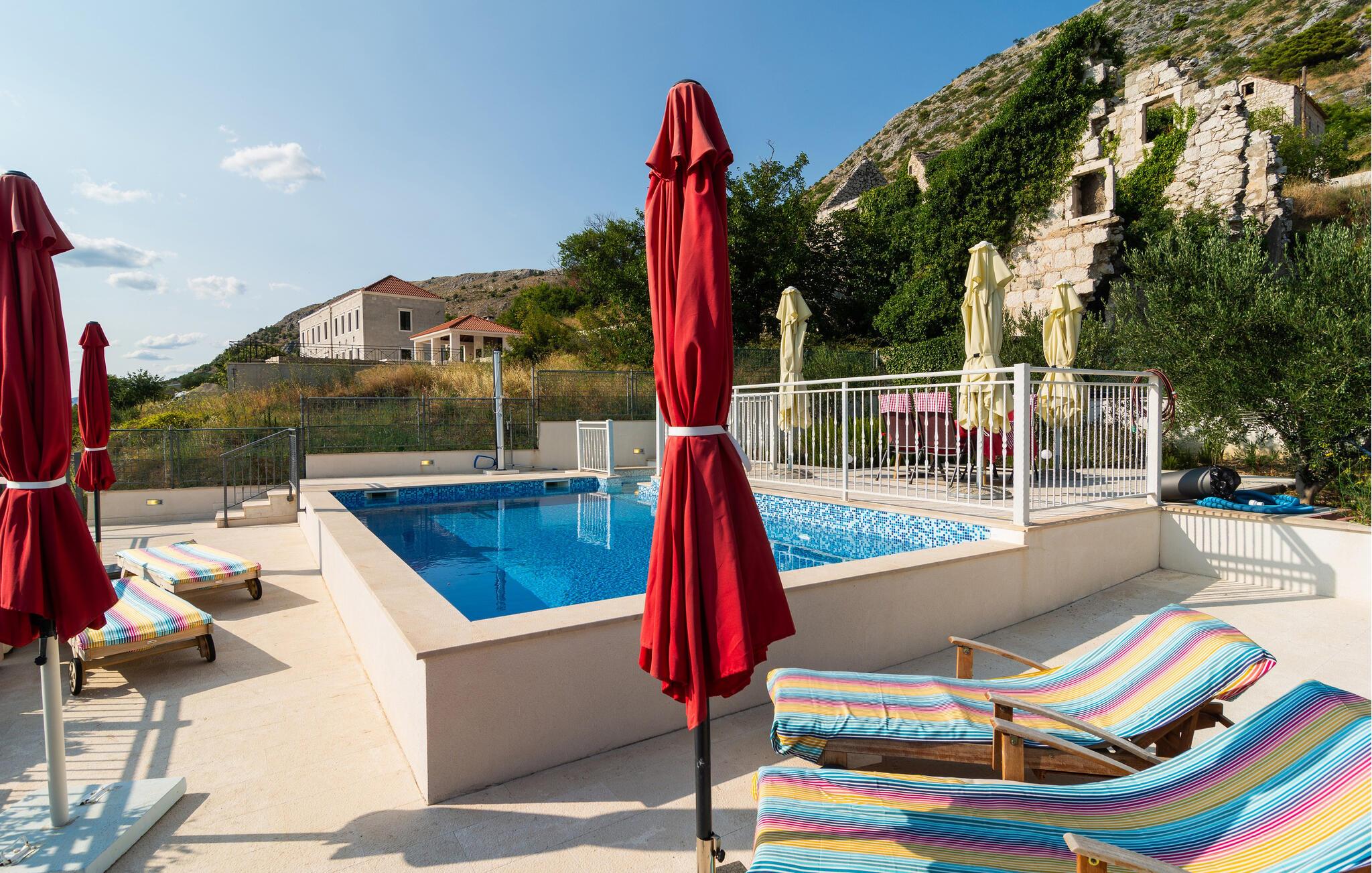Udendørs venter en smuk pool omgivet af komfortable liggestole, der indbyder til afslapning og solbadning. Herfra har I en fantastisk udsigt over det nærliggende hav på den ene side og det imponerende bjerglandskab på den anden. Om aftenen kan I tilberede en lækker barbecue på den overdækkede terrasse.