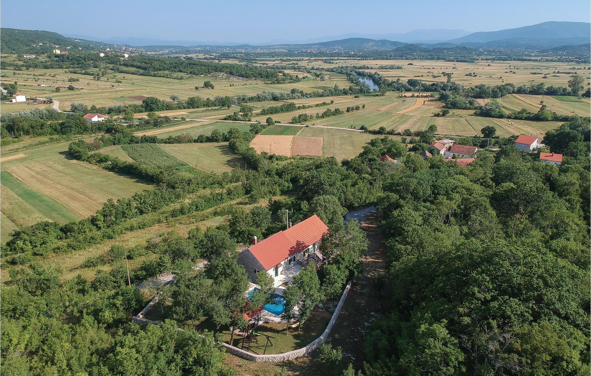 På en lille bakke med en utrolig udsigt over det blide landskab venter dette traditionelle feriehus af sten. Under renoveringen er der blevet taget hensyn til at bevare de traditionelle elementer, der sørger for en indbydende stemning. Feriehuset består af to særskilte lejligheder, der er forbundet over en terrasse, så huset er oplagt til en ferie med to familier. En taverneagtig stue i stueetagen samt udendørspoolen bag huset sørger for hyggelige timer under jeres ophold. I nærheden venter der rig afveksling som rafting ved floden Cetina, bad i Perucasøen med sandbredde, paragliding på bakken samt rideundervisning i rideklubben ved siden af. Der er kun omkring 40 km til havet, ligesom til den nærmeste kystby Split, der er udmærket af mange mindesmærker, der vidner om regionens rige historie.