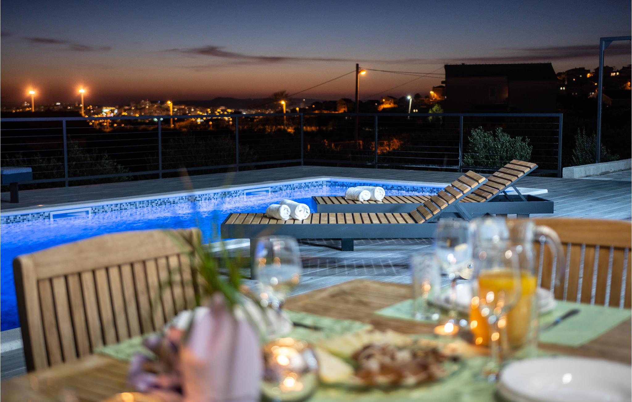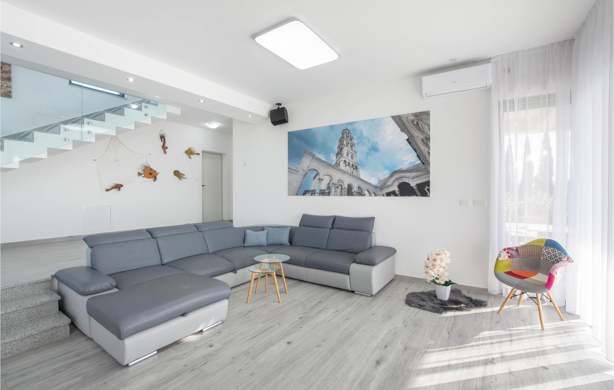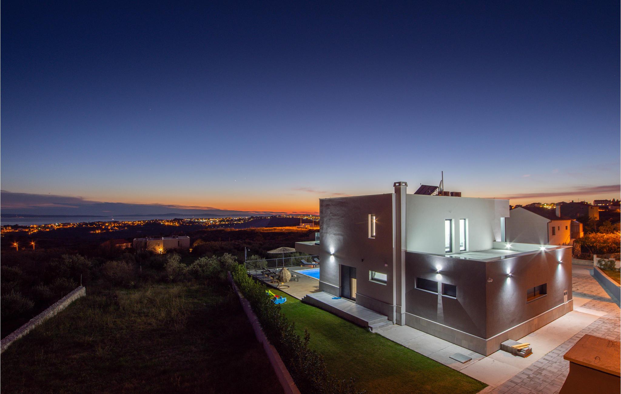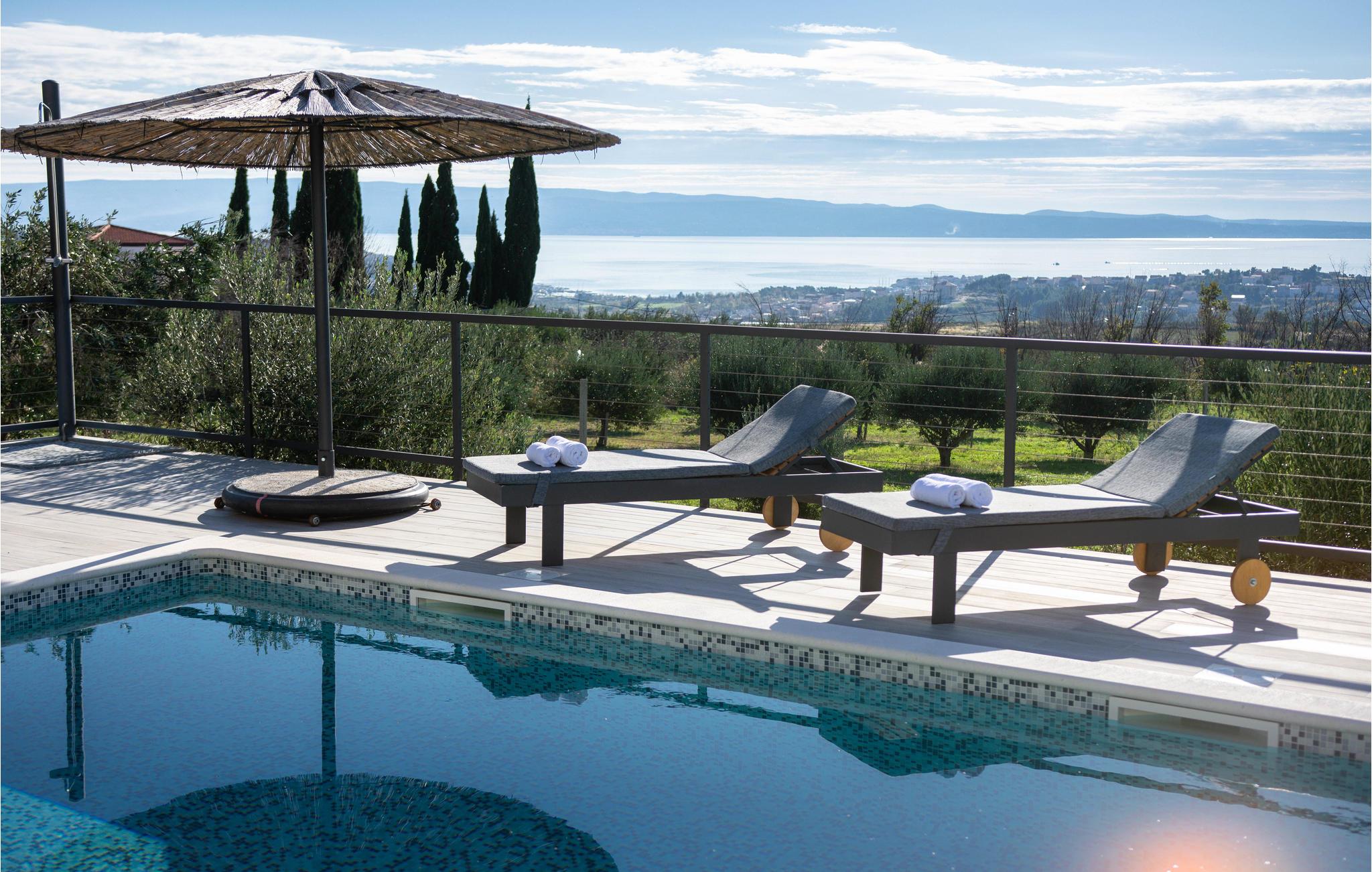 Dette moderne indrettede feriehus, ligger på en skrænt og herfra kan i nyde en panoramaudsigt over byen Split og Adriaterhavets mange små øer. Ud over de funktionelt indrettede værelser i huset kan I glæde jer over en stor have med en opvarmet pool med modstrømsanlæg. Huset rummer flere gode aktivitetsmuligheder som de fleste nok vil sætte pris på. Her er grill, bordtennis, bordfodbold, dart og legetøj for børn så som Playstation, gynge, legehus og trampolin. Ingen kommer til at kede sig her. På få minutter når I endda frem til verdenskendte historiske lokaliteter som Salona og Split, som begge rummer spændende bygningsværker og ruiner fra den romerske fortid.