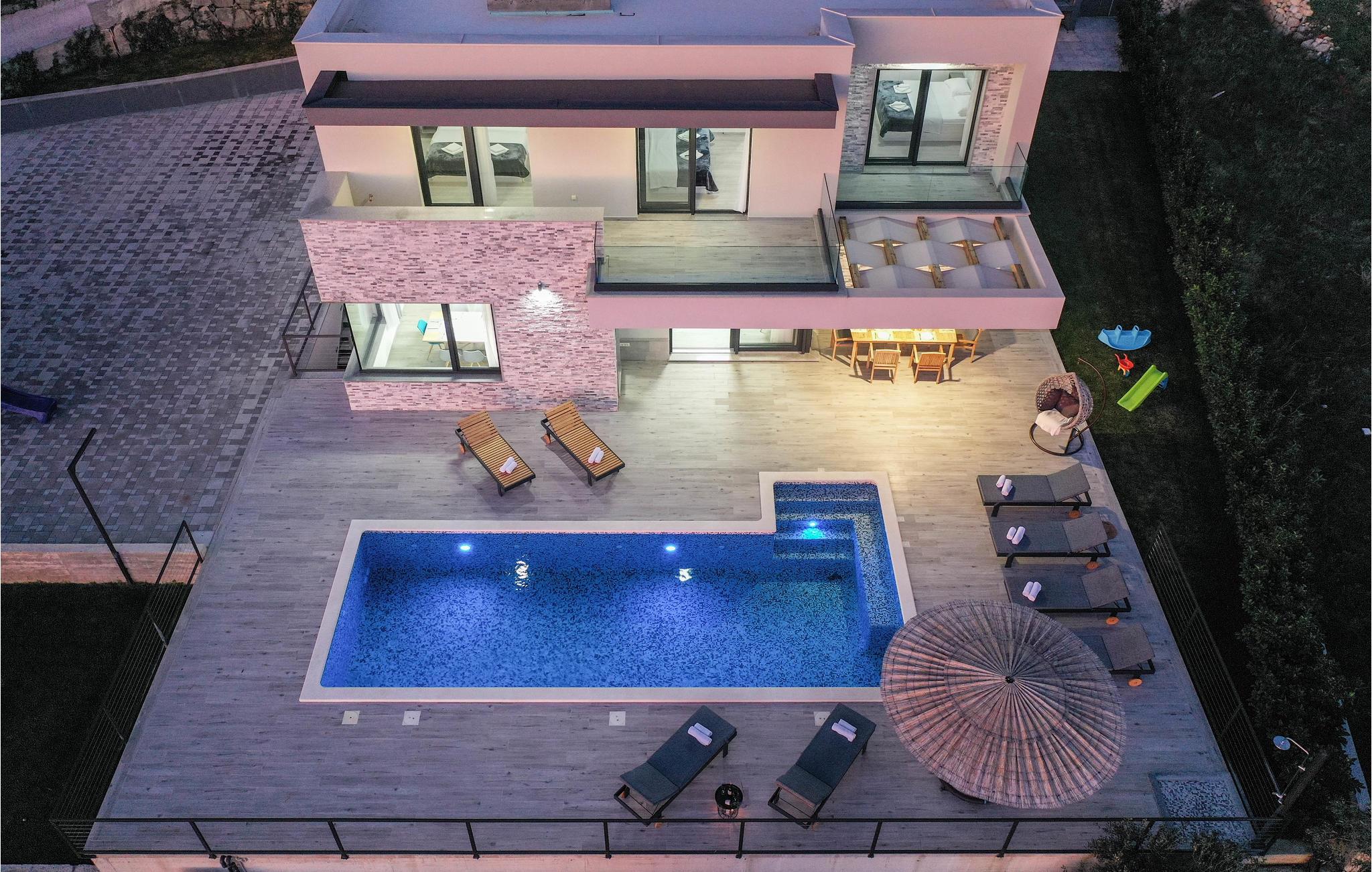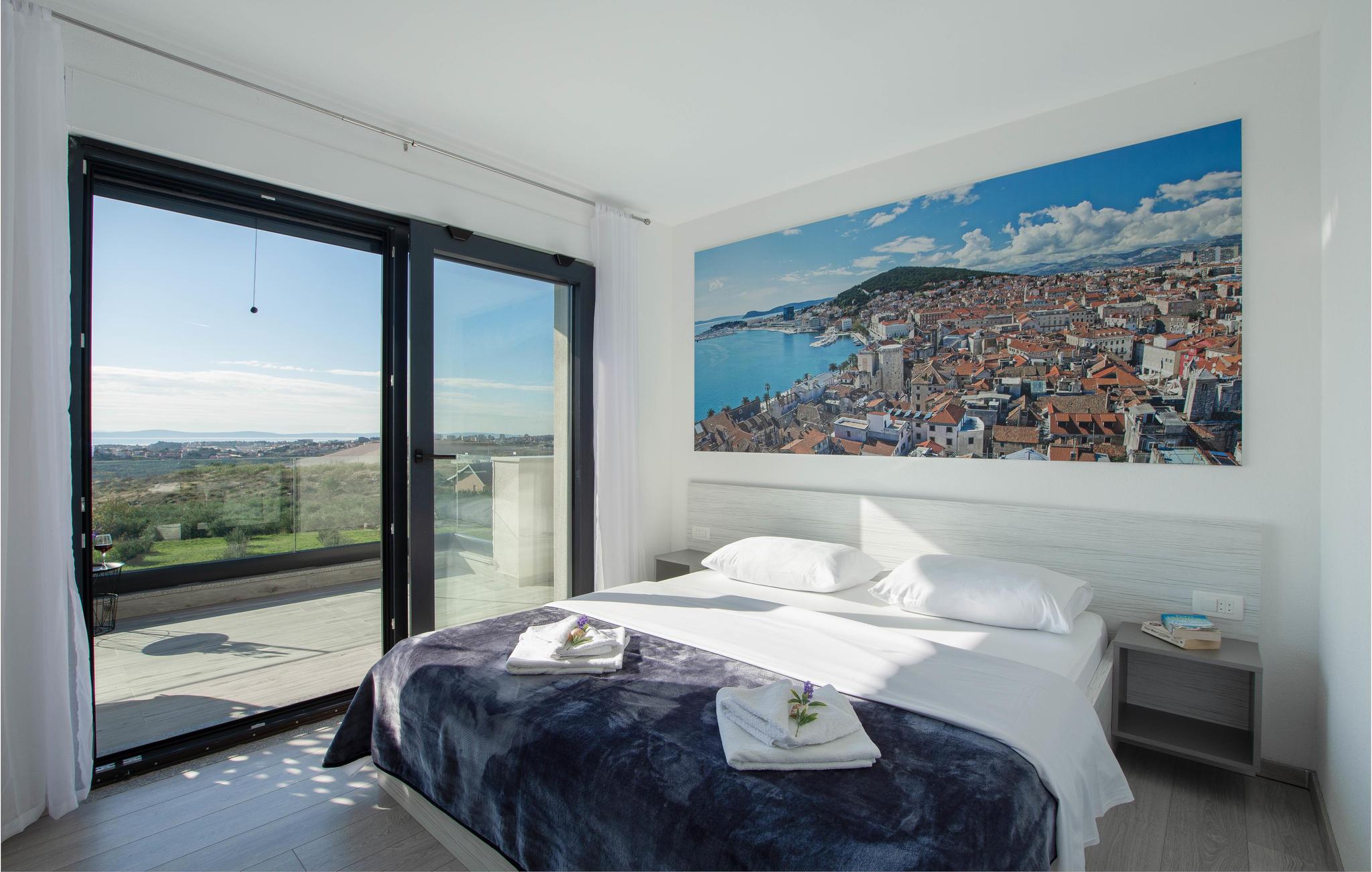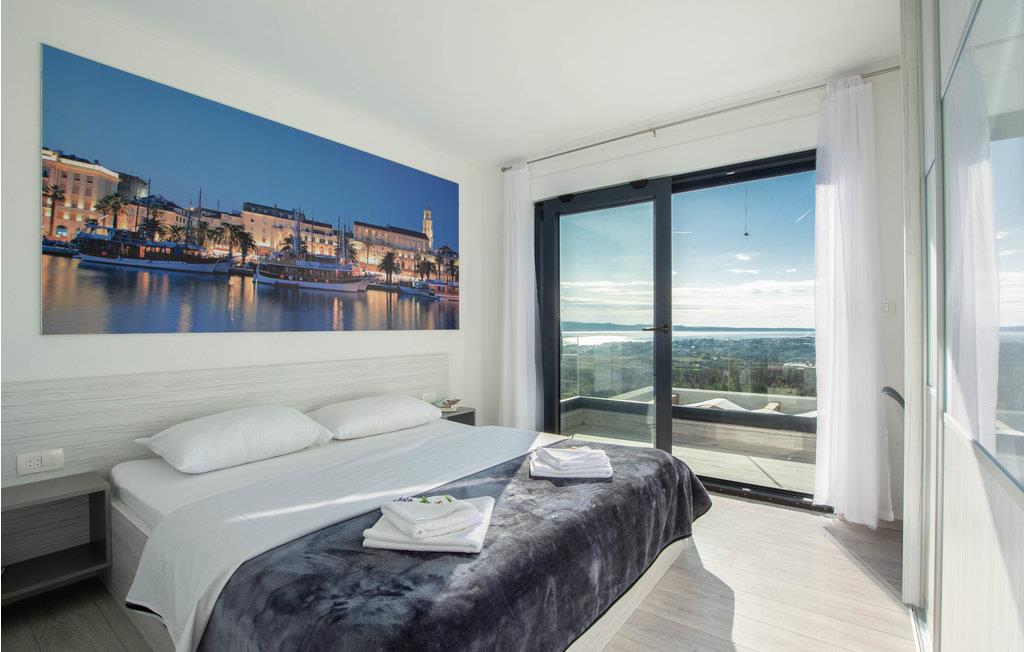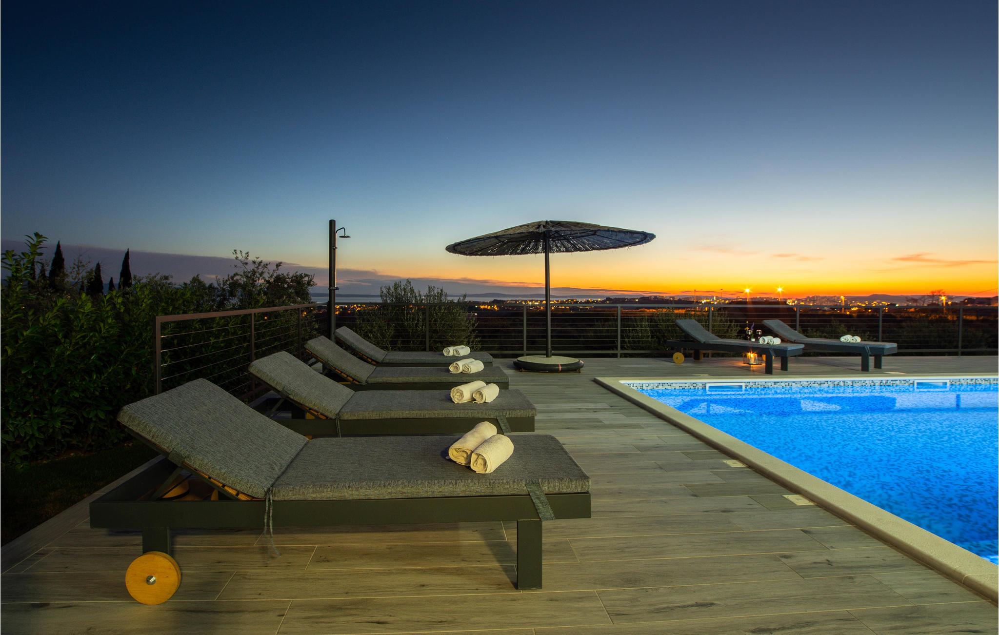 Dette moderne indrettede feriehus, ligger på en skrænt og herfra kan i nyde en panoramaudsigt over byen Split og Adriaterhavets mange små øer. Ud over de funktionelt indrettede værelser i huset kan I glæde jer over en stor have med en opvarmet pool med modstrømsanlæg. Huset rummer flere gode aktivitetsmuligheder som de fleste nok vil sætte pris på. Her er grill, bordtennis, bordfodbold, dart og legetøj for børn så som Playstation, gynge, legehus og trampolin. Ingen kommer til at kede sig her. På få minutter når I endda frem til verdenskendte historiske lokaliteter som Salona og Split, som begge rummer spændende bygningsværker og ruiner fra den romerske fortid.