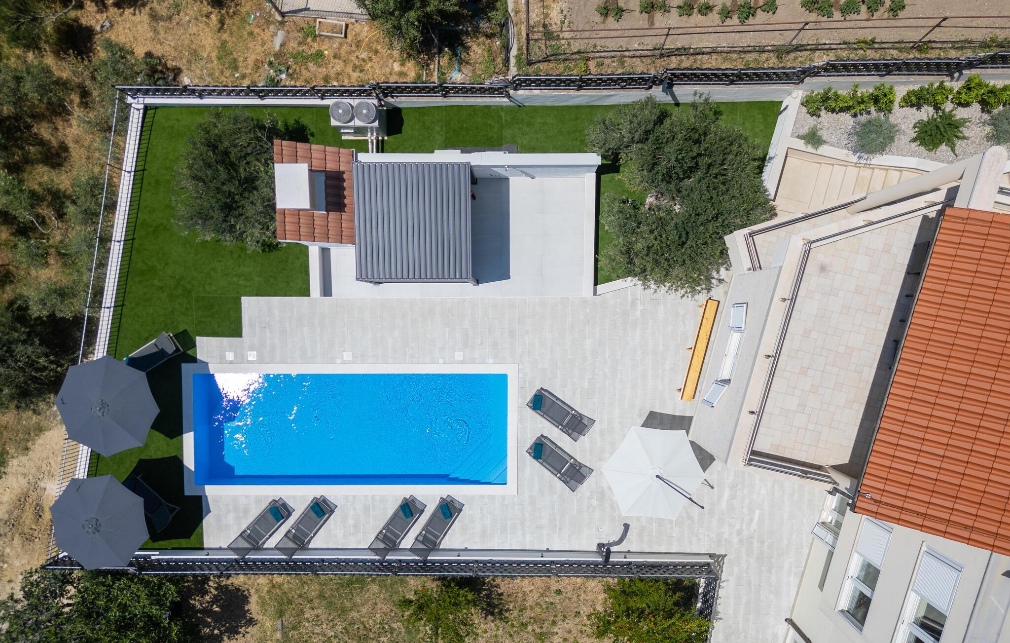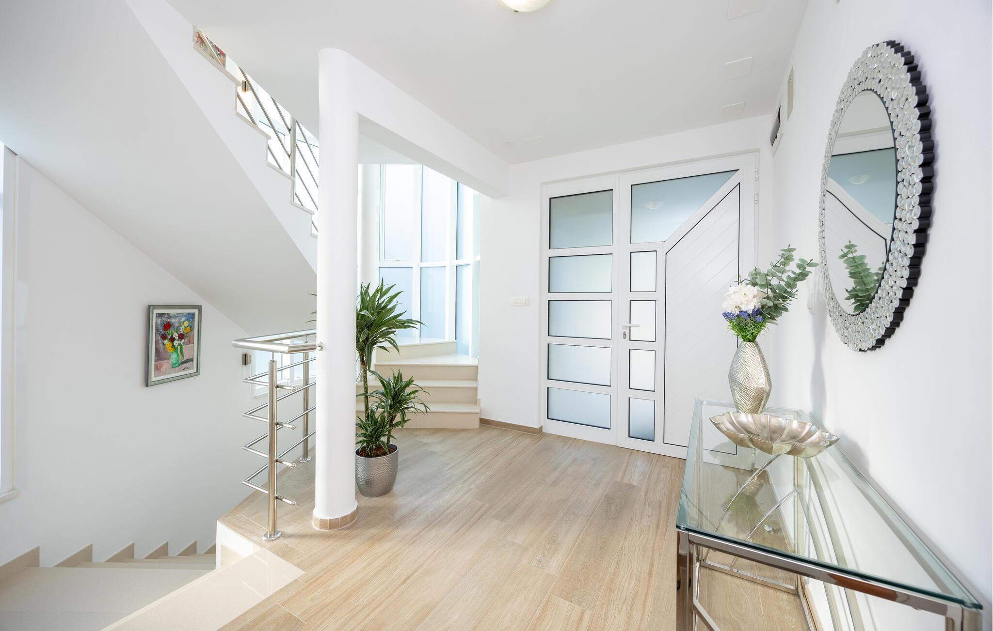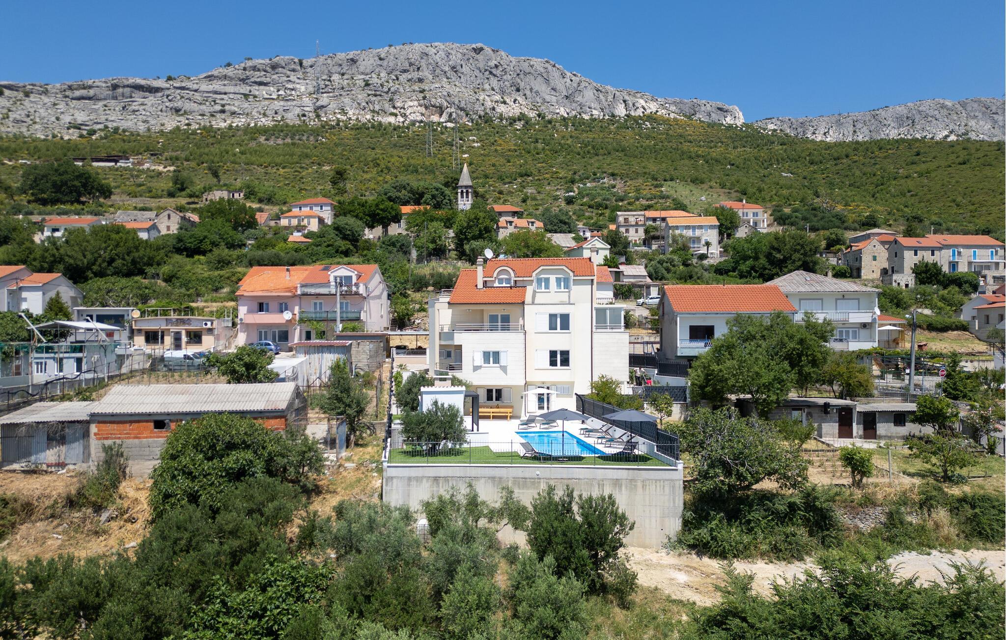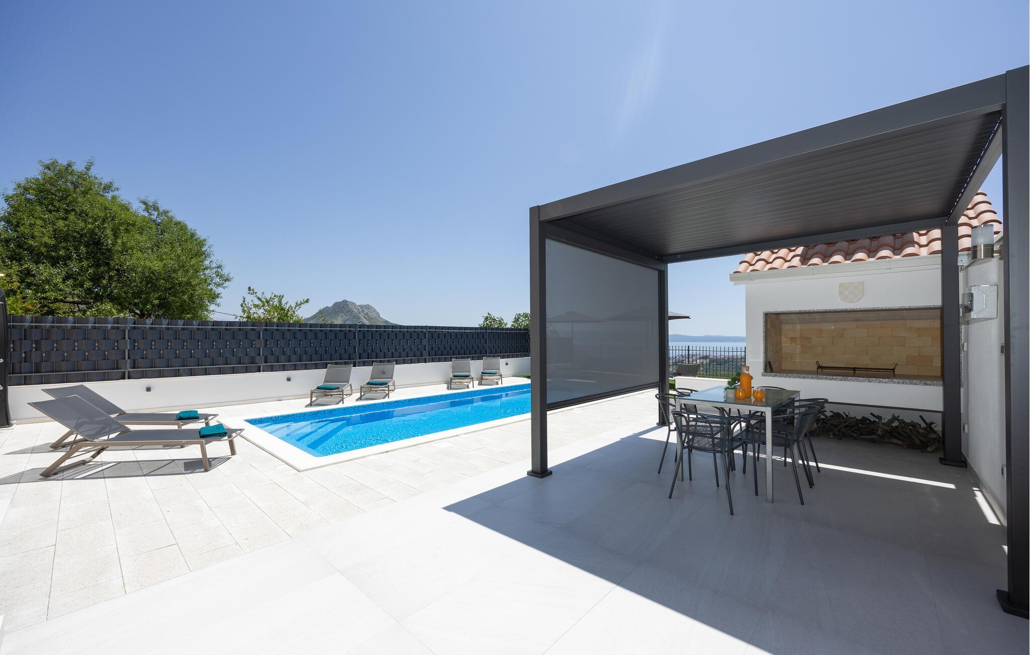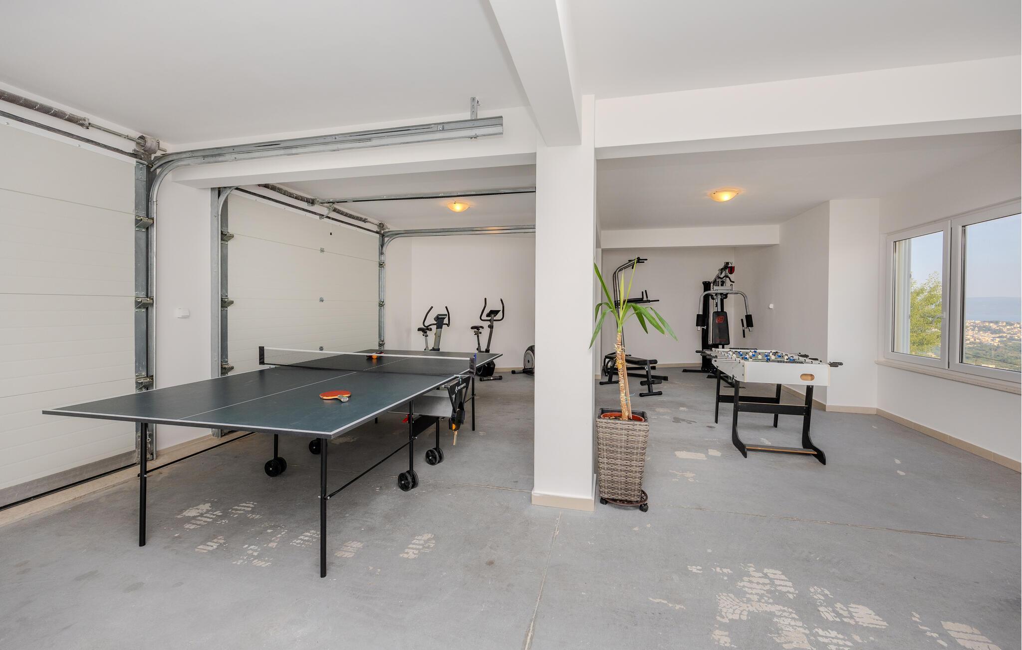 Tilbring jeres næste ferie i dette rummelige feriehus nær Split. jeres feriehus i Kucine tilbyder jer det højeste niveau af komfort med sin imponerende arkitektur og stilfulde indretning. Den lyse opholdsstue med store panoramavinduer giver jer en fantastisk udsigt over det dalmatiske landskab og havet i horisonten. Slap af på den komfortable sofa eller nyd jeres måltider i den elegante spiseplads, som byder på plads til hele familien. Tag jer også tid til at slappe af på den rummelige terrasse, som er udstyret med komfortable siddepladser og tilbyder en vidunderlig udsigt over det omkringliggende område. Her kan I trække den friske ferieluft ind og afslutte dagen med et glas vin. Der tilbydes underholdning i det veludstyrede aktivitetsrum, hvor I kan spille bordtennis eller træne i fitnessområdet. Besøg Split, hvis historiske gamle bydel er på UNESCOs verdensarvsliste. Udforsk Diocletians palads og de maleriske gader fulde af caféer og butikker. Gå ikke glip af Bacvice-stranden, ideel til familier med sit fine sand og klare vand. Benyt lejligheden til at udforske Dalmatiens smukke kystlandskab på vandre- eller cykelture, eller kør til den charmerende landsby Trogir for at opleve dens velbevarede middelalderbymidte.