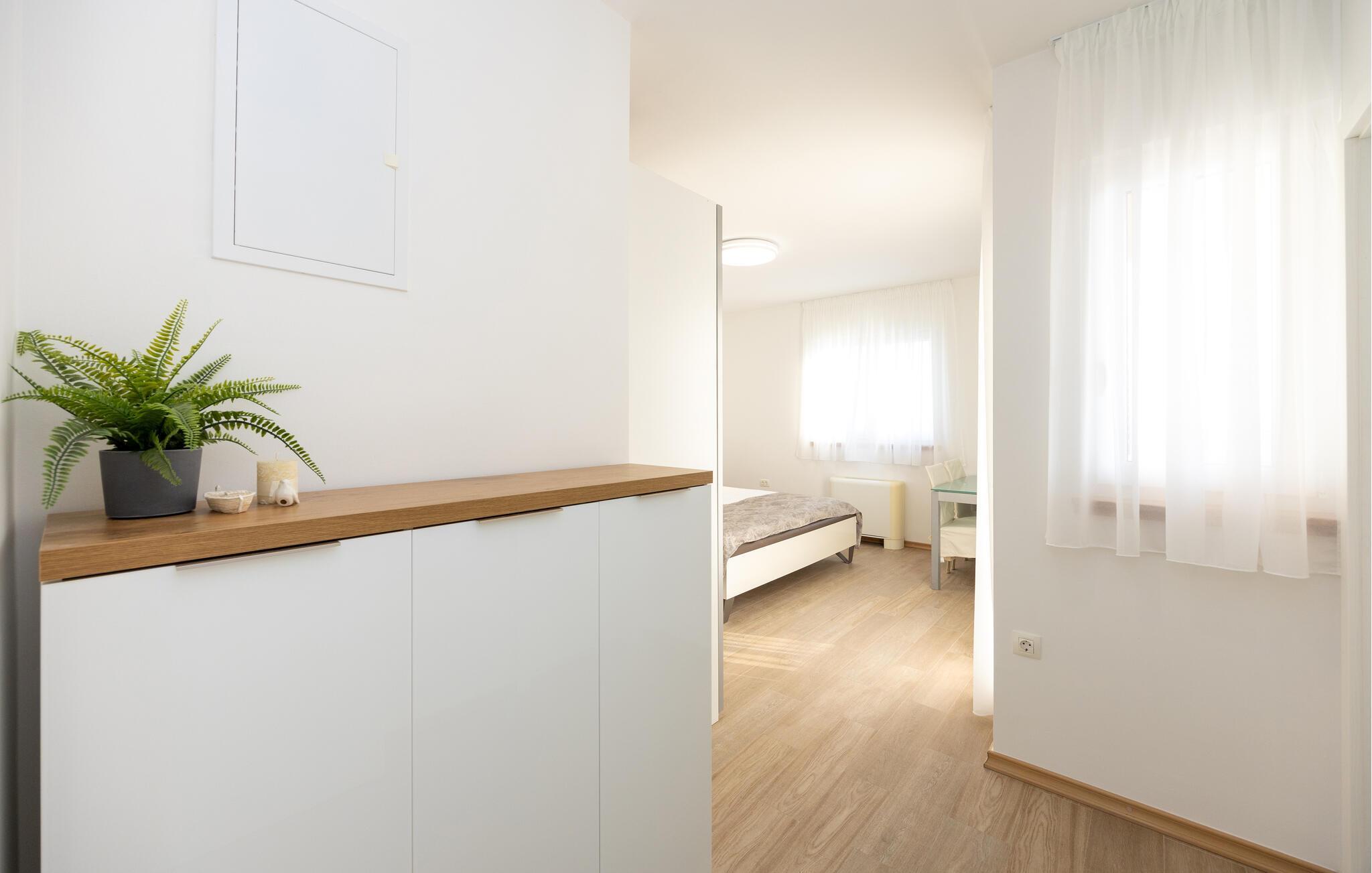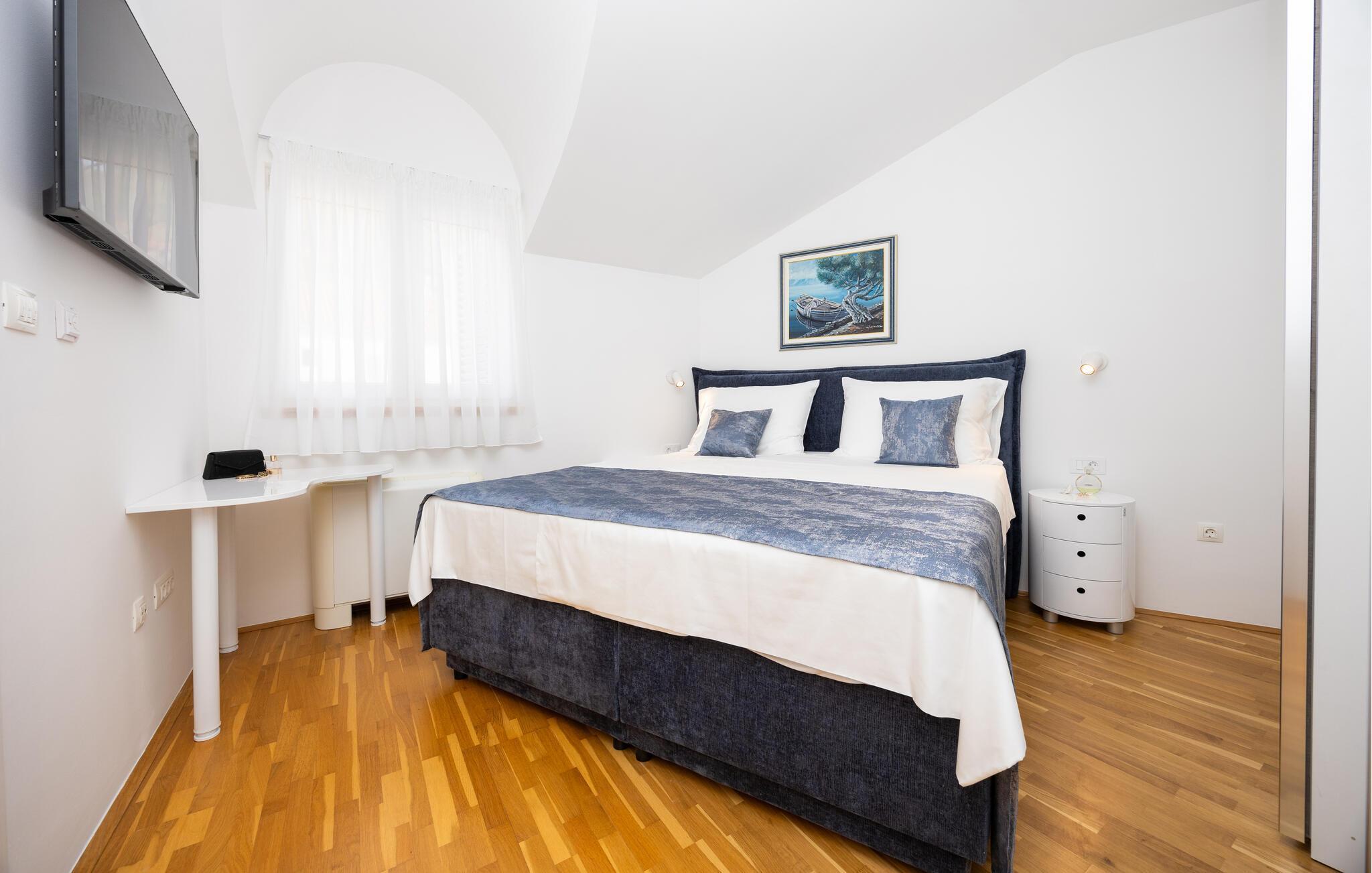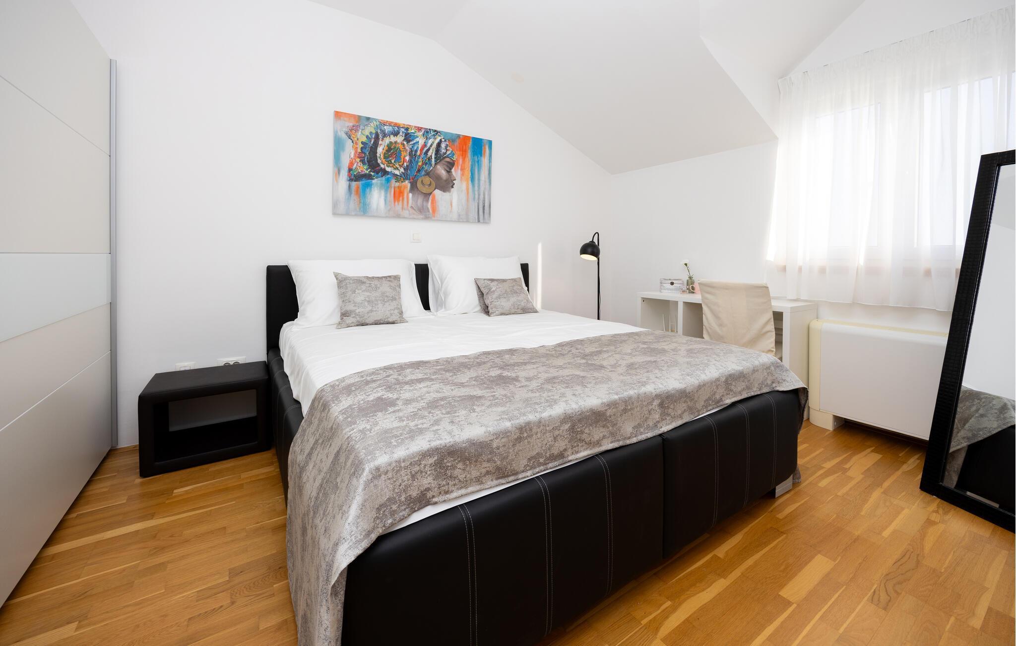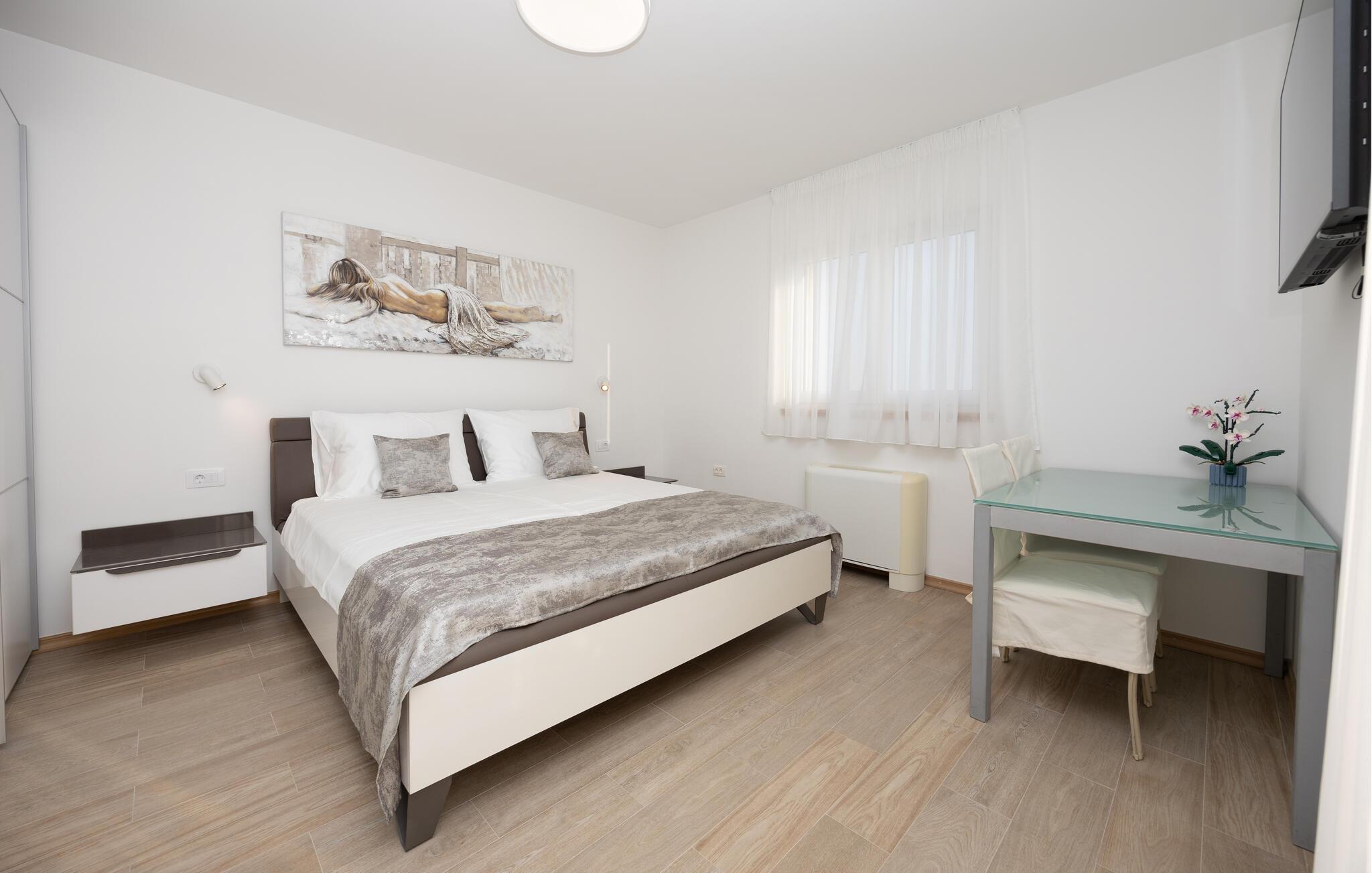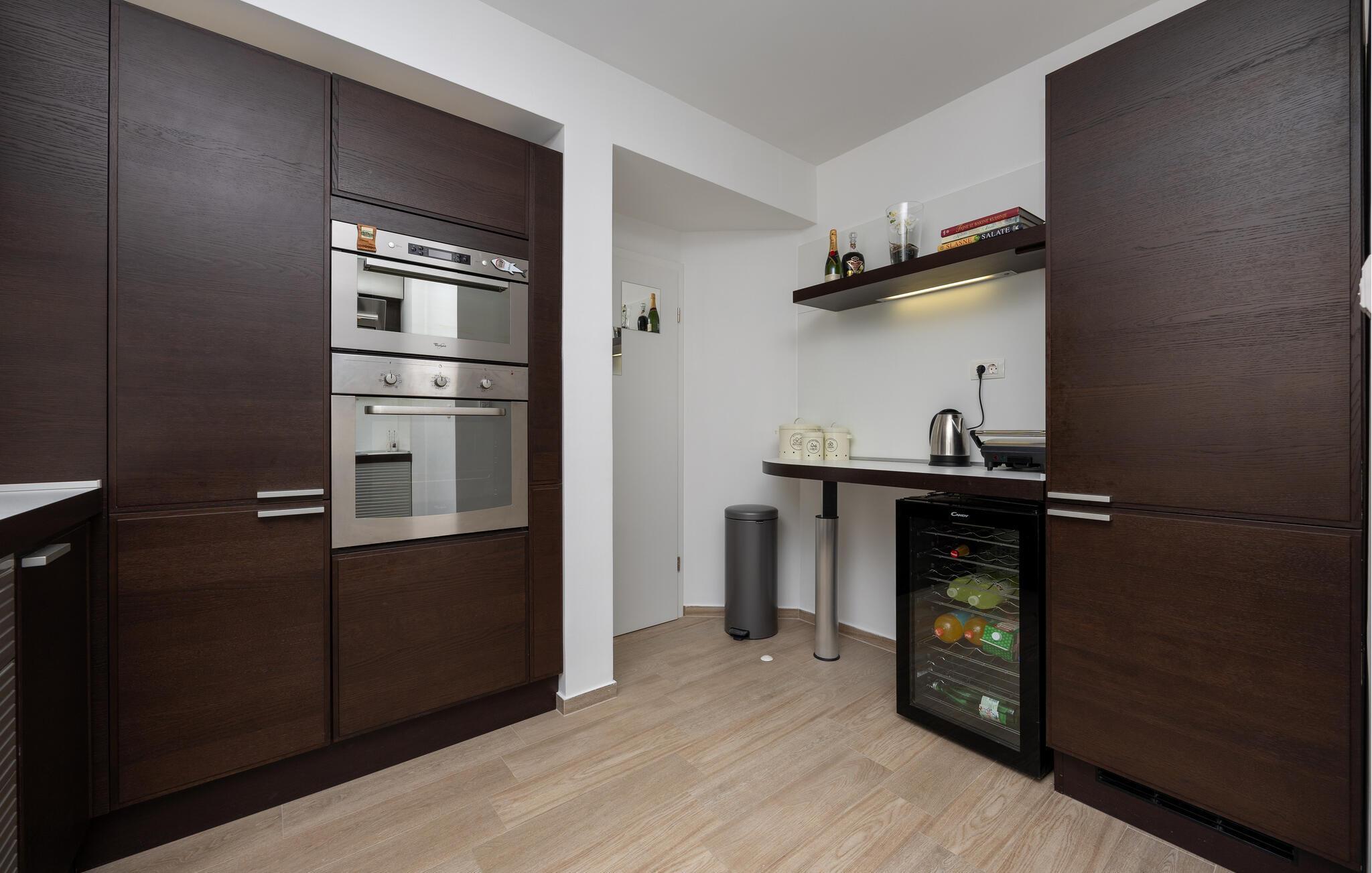 Tilbring jeres næste ferie i dette rummelige feriehus nær Split. jeres feriehus i Kucine tilbyder jer det højeste niveau af komfort med sin imponerende arkitektur og stilfulde indretning. Den lyse opholdsstue med store panoramavinduer giver jer en fantastisk udsigt over det dalmatiske landskab og havet i horisonten. Slap af på den komfortable sofa eller nyd jeres måltider i den elegante spiseplads, som byder på plads til hele familien. Tag jer også tid til at slappe af på den rummelige terrasse, som er udstyret med komfortable siddepladser og tilbyder en vidunderlig udsigt over det omkringliggende område. Her kan I trække den friske ferieluft ind og afslutte dagen med et glas vin. Der tilbydes underholdning i det veludstyrede aktivitetsrum, hvor I kan spille bordtennis eller træne i fitnessområdet. Besøg Split, hvis historiske gamle bydel er på UNESCOs verdensarvsliste. Udforsk Diocletians palads og de maleriske gader fulde af caféer og butikker. Gå ikke glip af Bacvice-stranden, ideel til familier med sit fine sand og klare vand. Benyt lejligheden til at udforske Dalmatiens smukke kystlandskab på vandre- eller cykelture, eller kør til den charmerende landsby Trogir for at opleve dens velbevarede middelalderbymidte.