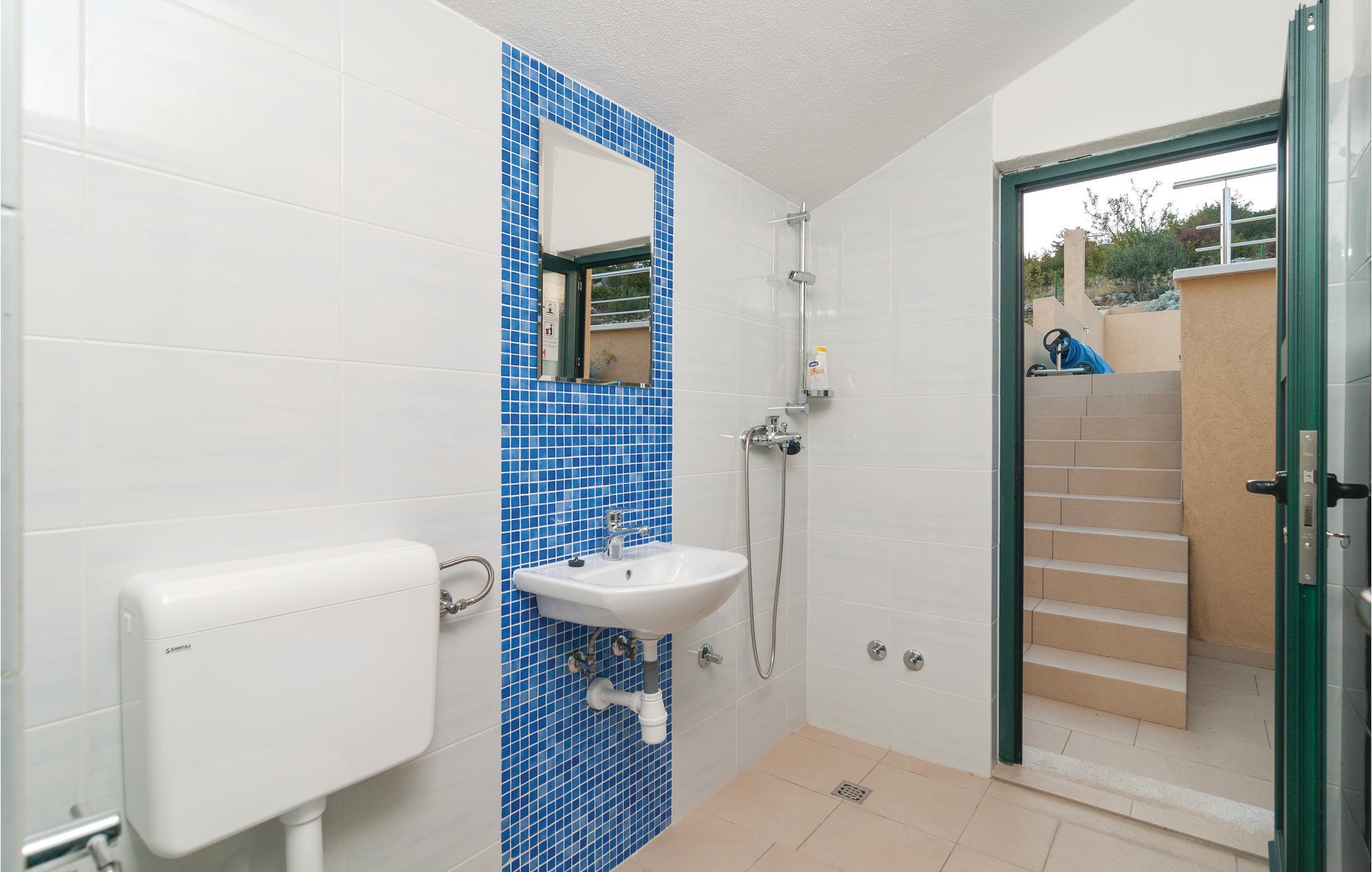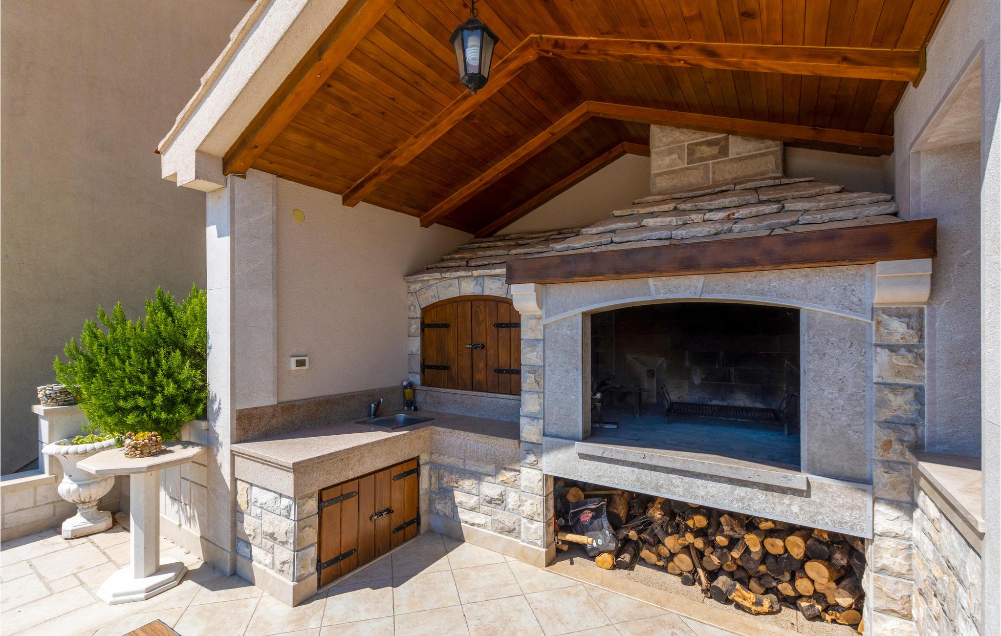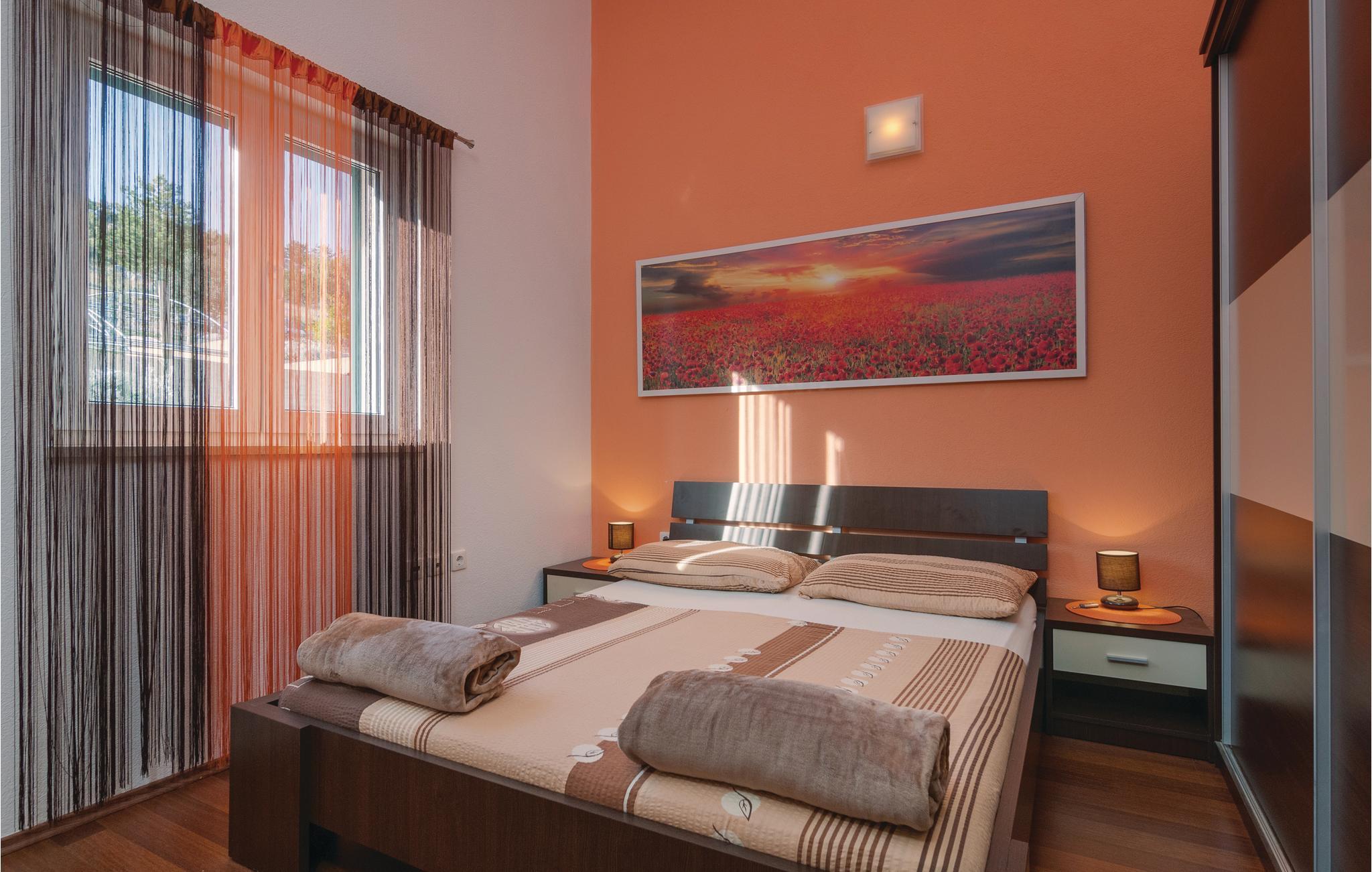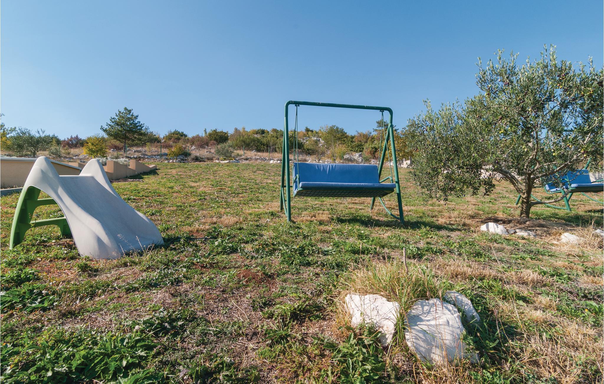 Smukt feriehus i Dalmatiens bagland, omgivet af den fredelige og frodige natur. Da huset ligger på en bakket grund, ligger indgangsdøren i høj parterre. Her er to soveværelser, et moderne køkken og en stue, et badeværelse, mens hemsen og et yderligere badeværelse ligger på øverste etage. Etagerne er forbundet med indendørs trapper, hele huset er som en enhed. Laveste loftshøjde er 0.94 m. Husets swimmingpool har en lav afdeling til jeres børn. Nyd udsigten ud over solnedgangen og naturen fra de bekvemme havemøbler. Der er et tredje badeværelse ligger ved siden af poolen, bag huset.