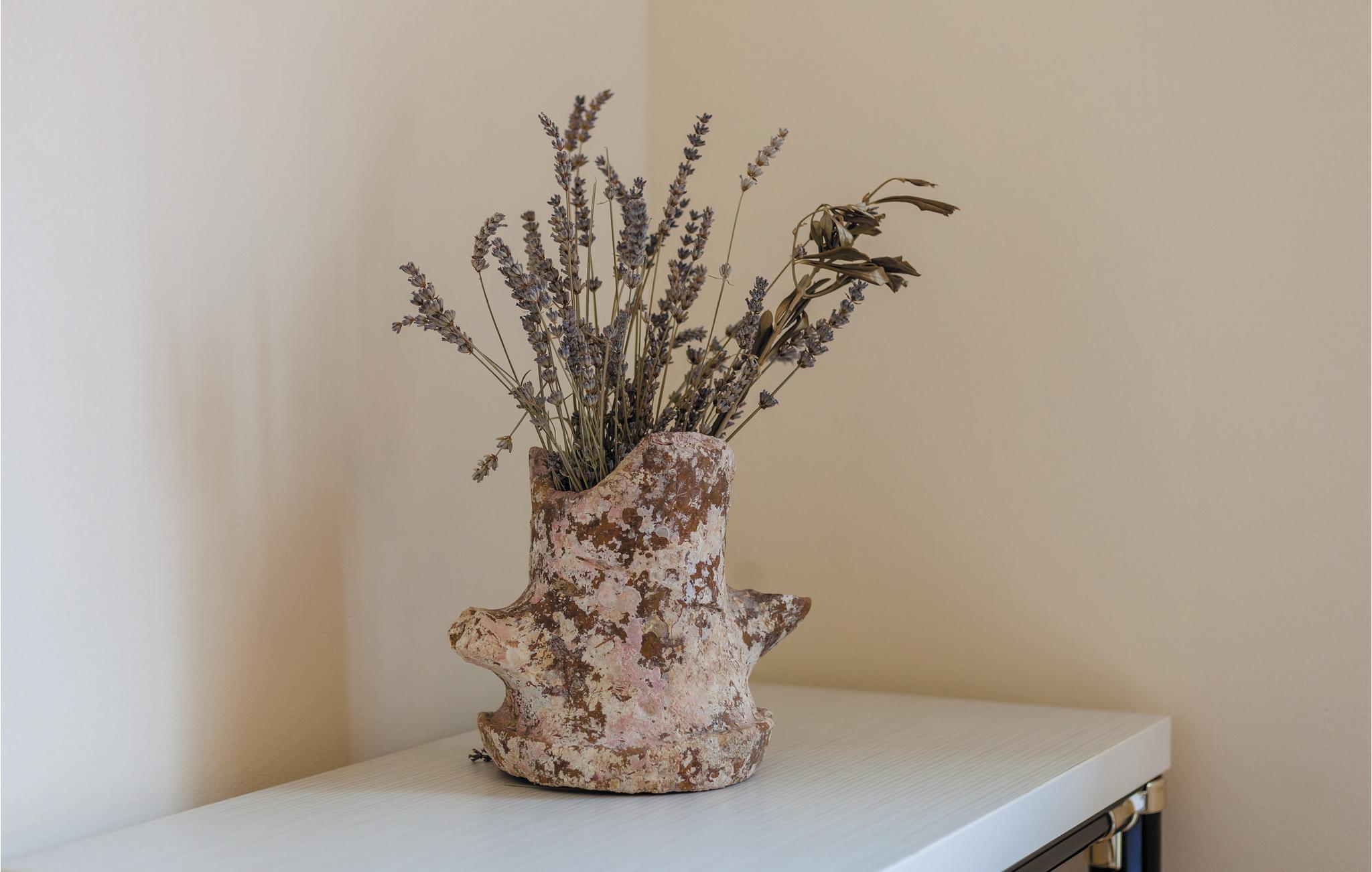 Interiøret er dekoreret i bløde pasteltoner, der er en Wes Anderson film værdig. Nyd den overdækkede terrasse med en vidunderlig udsigt over havet og øerne. Her i den friske luft har I det perfekte sted til morgenkaffen og romantiske sommeraftener.
