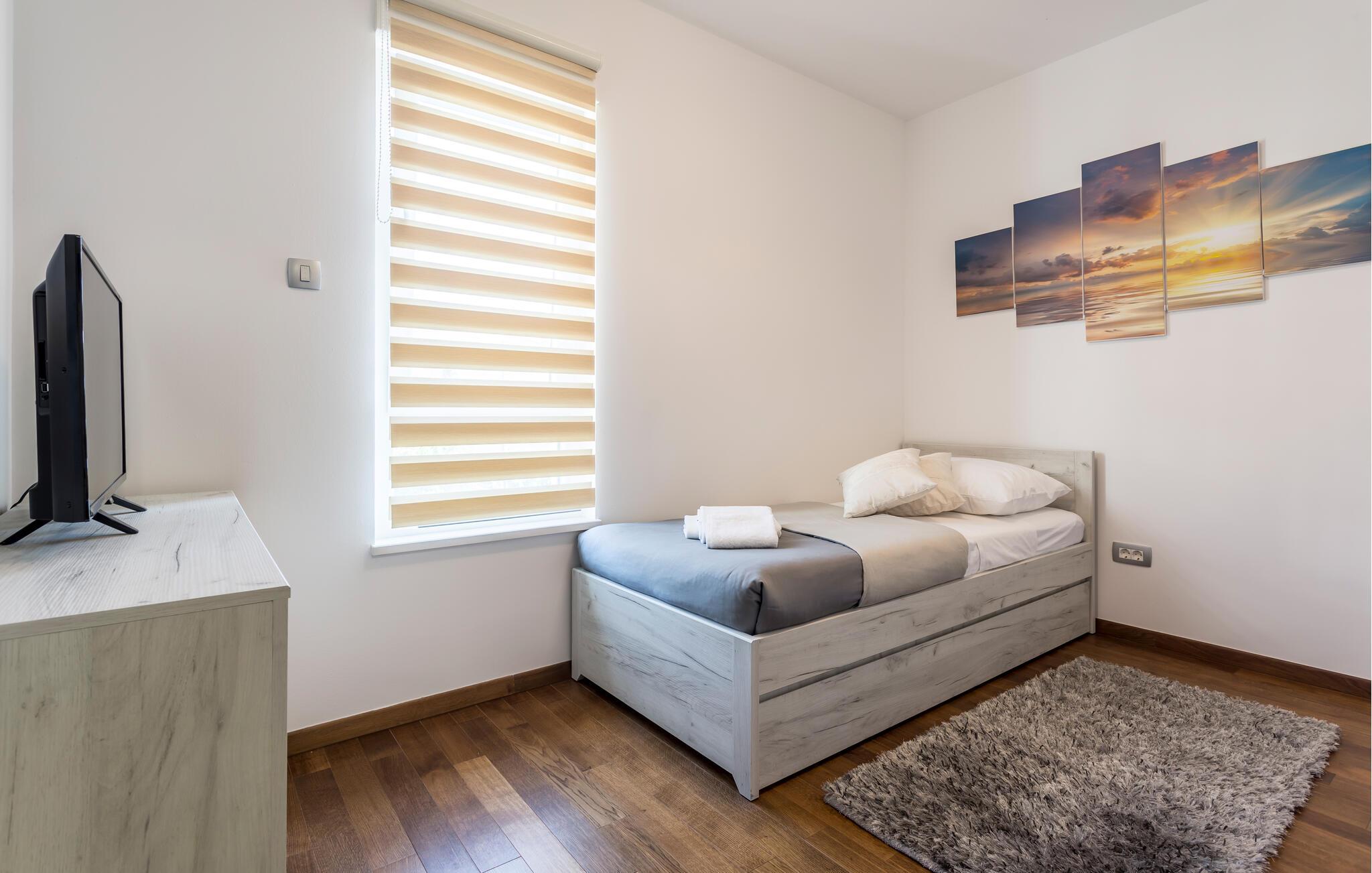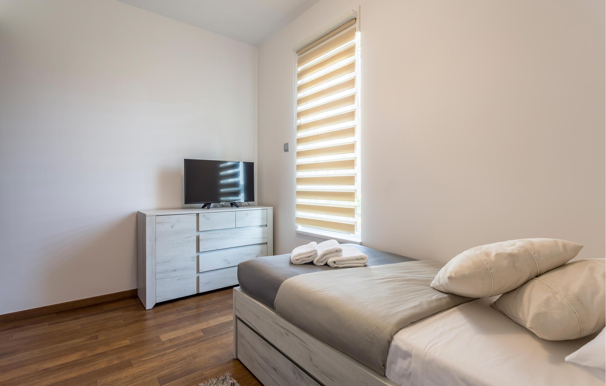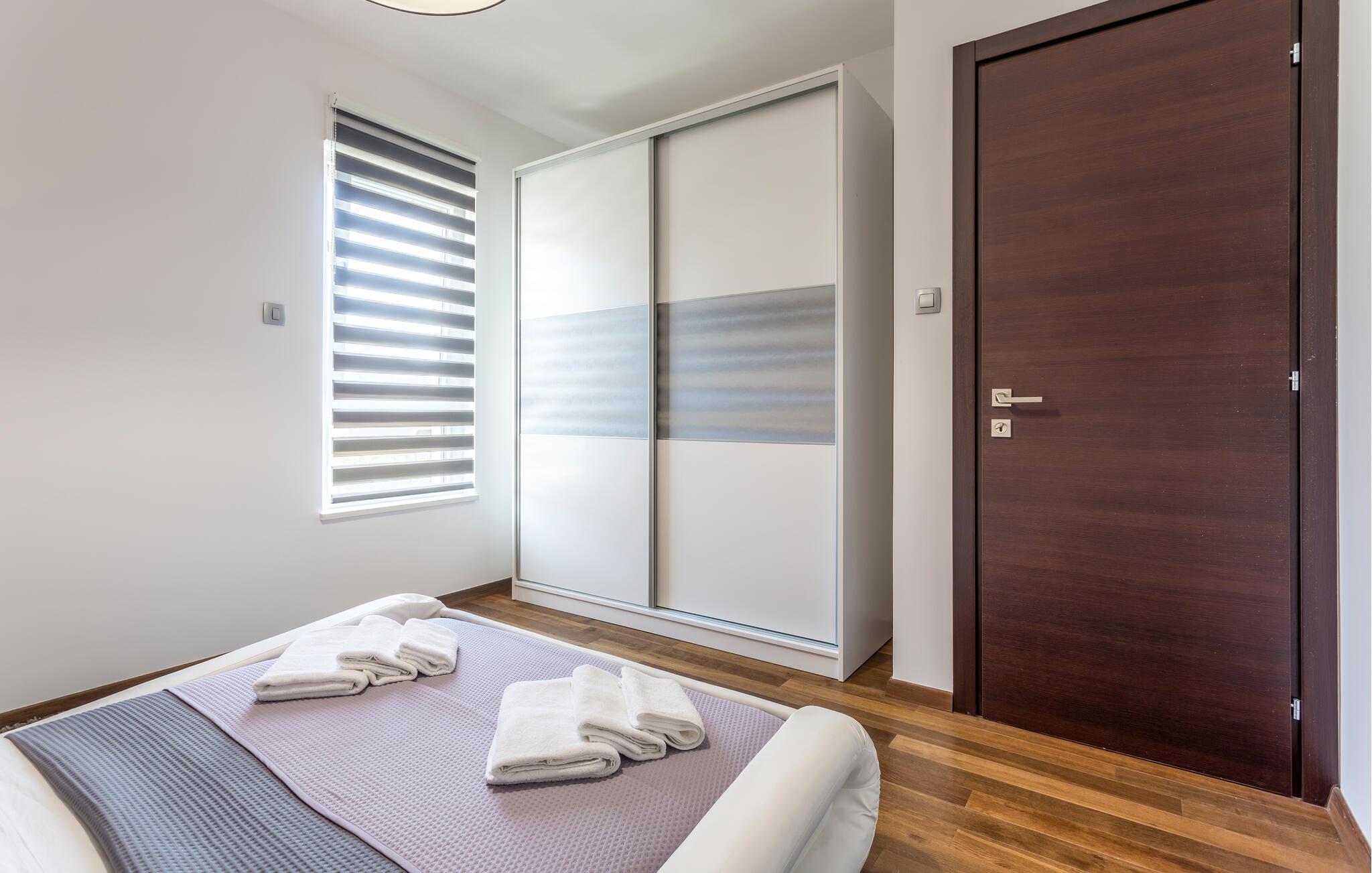 Forestil jer at vågne op i en luksuriøs lejlighed udstyret med alt hvad hjertet kan begære. Flere elegante soveværelser, et privat fitnesscenter og et afslappende spabad - alt sammen kun en kort gåtur fra den maleriske Strozanac-strand. Her kombineres stilfuld indretning og moderne design for at skabe et harmonisk ferieområde. Den rummelige terrasse giver jer de perfekte rammer til fuldt ud at nyde Middelhavets sol og grillaftener.