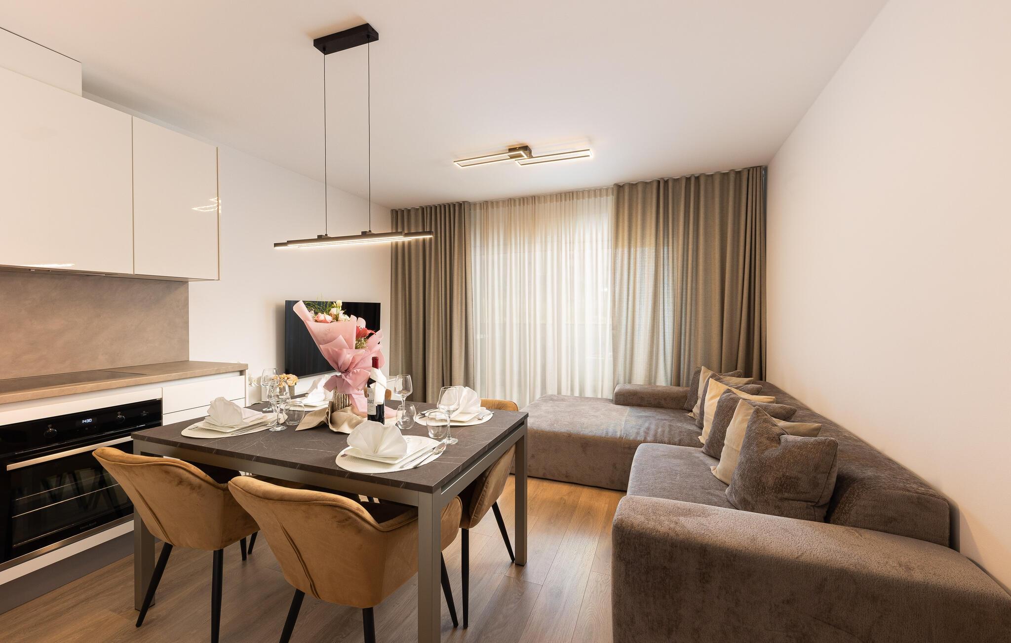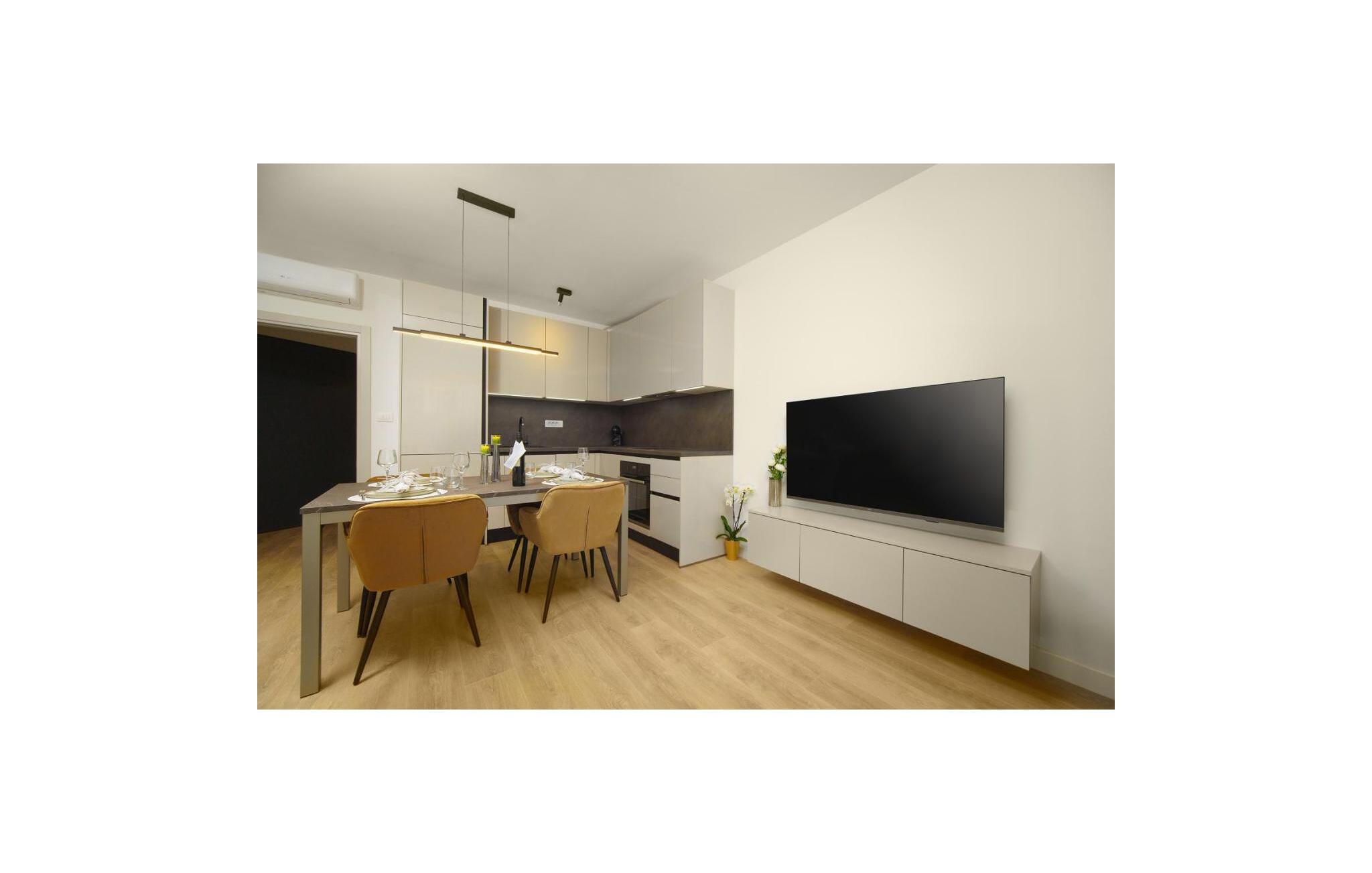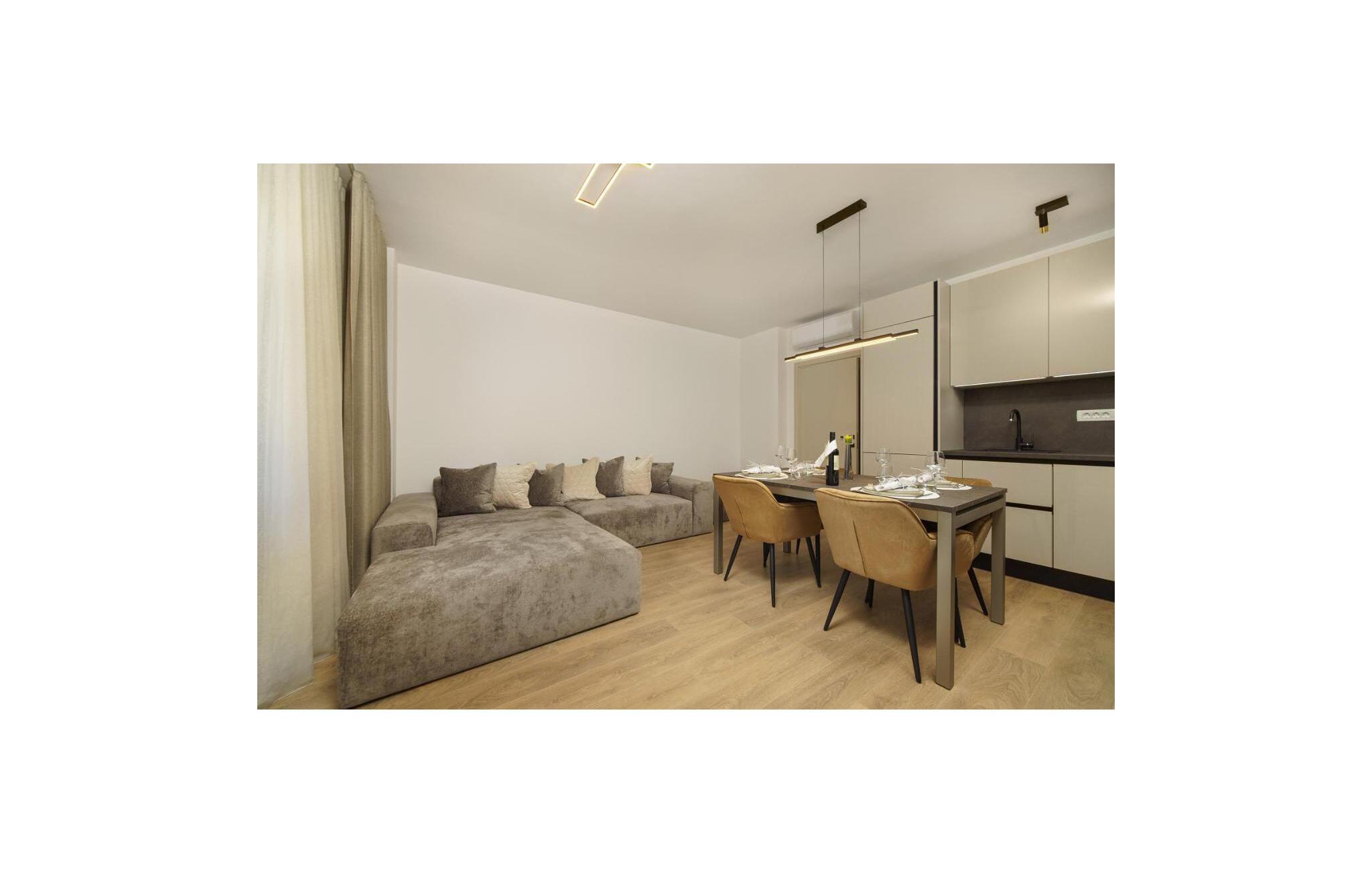 Ikke langt fra stranden og fremragende restauranter inviterer denne komfortable ferielejlighed jer til en afslappende pause ved Middelhavet. Her skaber høj kvalitet og stilfuld indretning en ægte atmosfære. Tilbered lækre retter i det åbne køkken og tag plads ved det elegante spisebord. Efter en begivenhedsrig dag kan I synke ned i det hyggelige sofaområde, streame en spændende film eller dedikere jer til en god bog.
