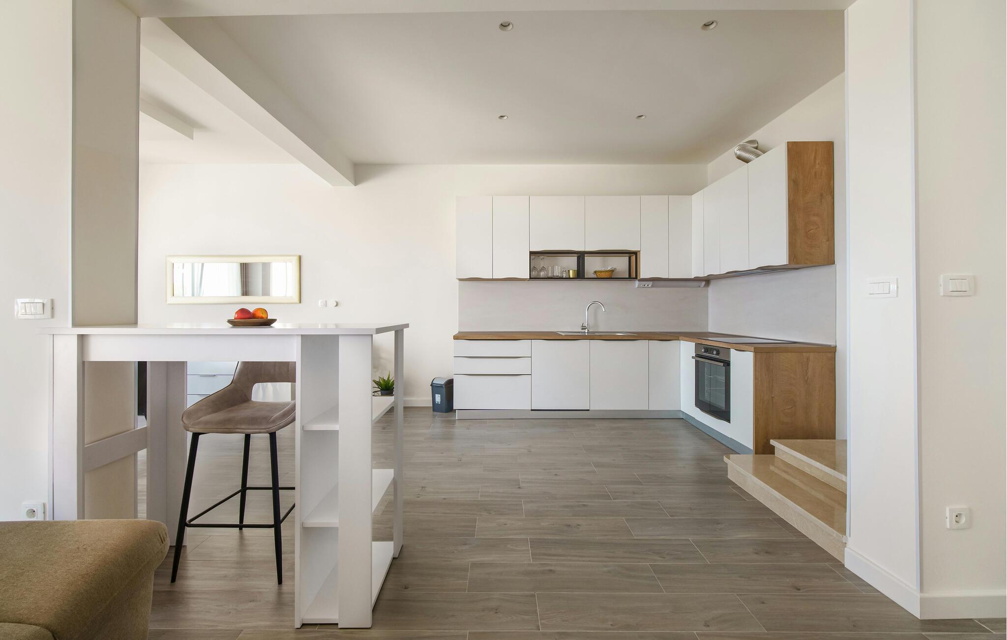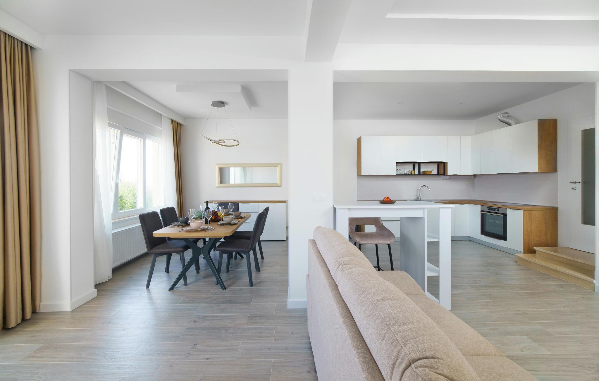 Træd ind i det lyse og stilfulde interiør i denne ferielejlighed, og føl jer hjemme. Find jer til rette i den åbne stue og spisestue med en behagelig sofa, et moderne spisebord og store vinduer, der lukker masser af naturligt lys ind. Tilbered jeres måltider i det veludstyrede køkken og tilbring rolige aftener i en behagelig atmosfære.