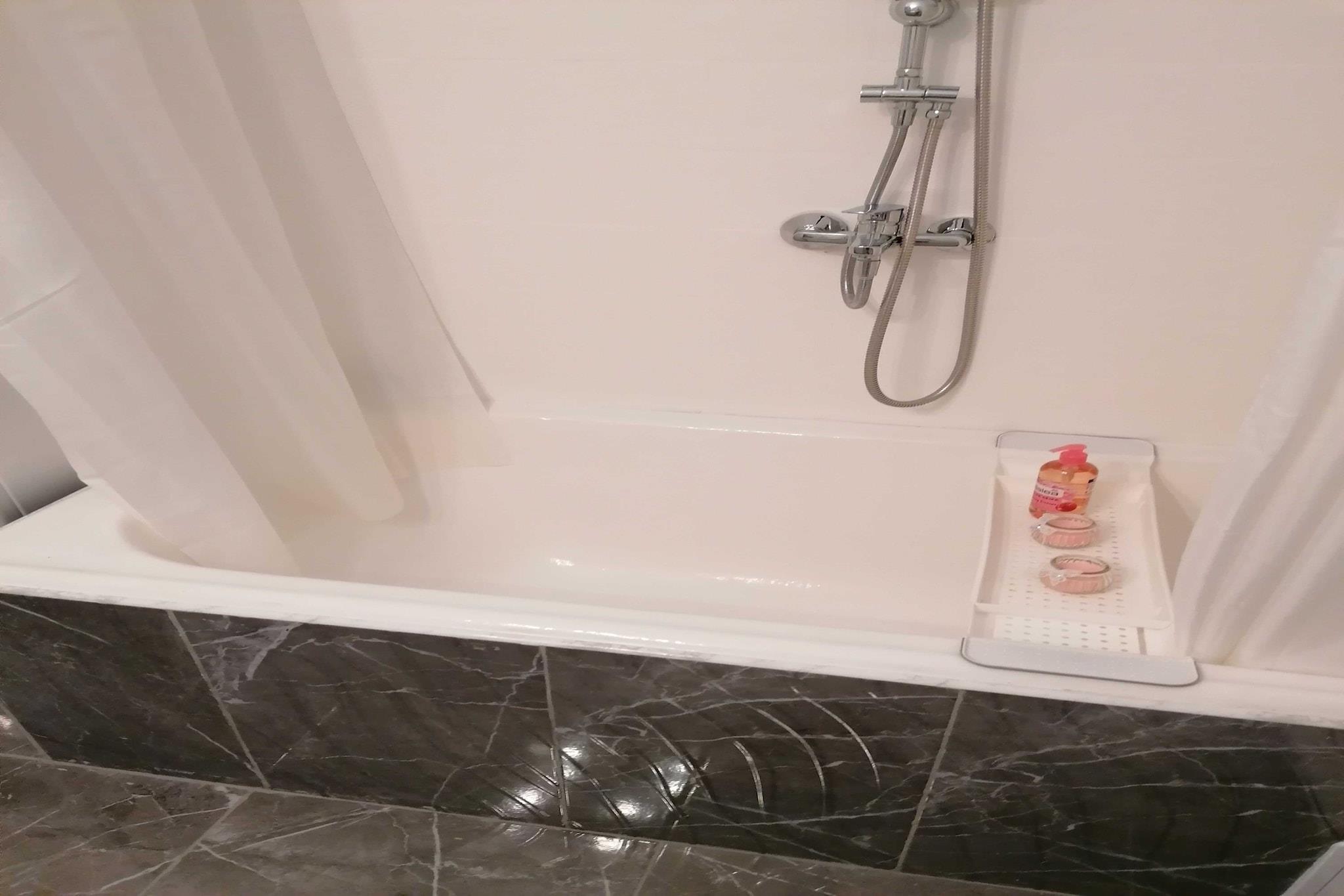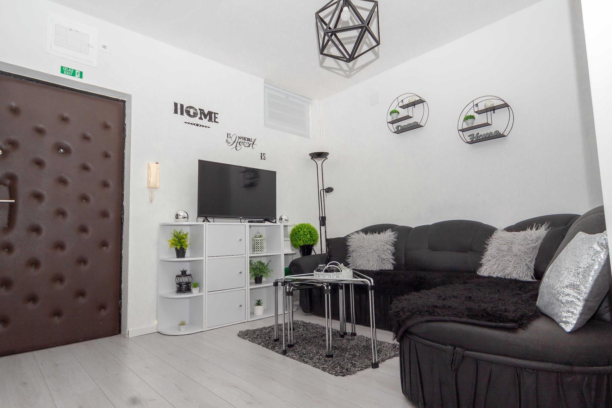 På 4. etage: (Stue, Stue/soveværelse(dobbeltsovesofa), soveværelse(2x enkeltseng), soveværelse(king size-seng)) På 5. etage: (Køkken, badeværelse) spisestue, toilet, Fjernsyn, spisebord, kakkelovn, elkedel, brødrister, kaffemaskine, ovn, køleskab, badekar, vaskemaskine, balkon, klimaanlæg, parking lot(public), strygejern, føntørrer