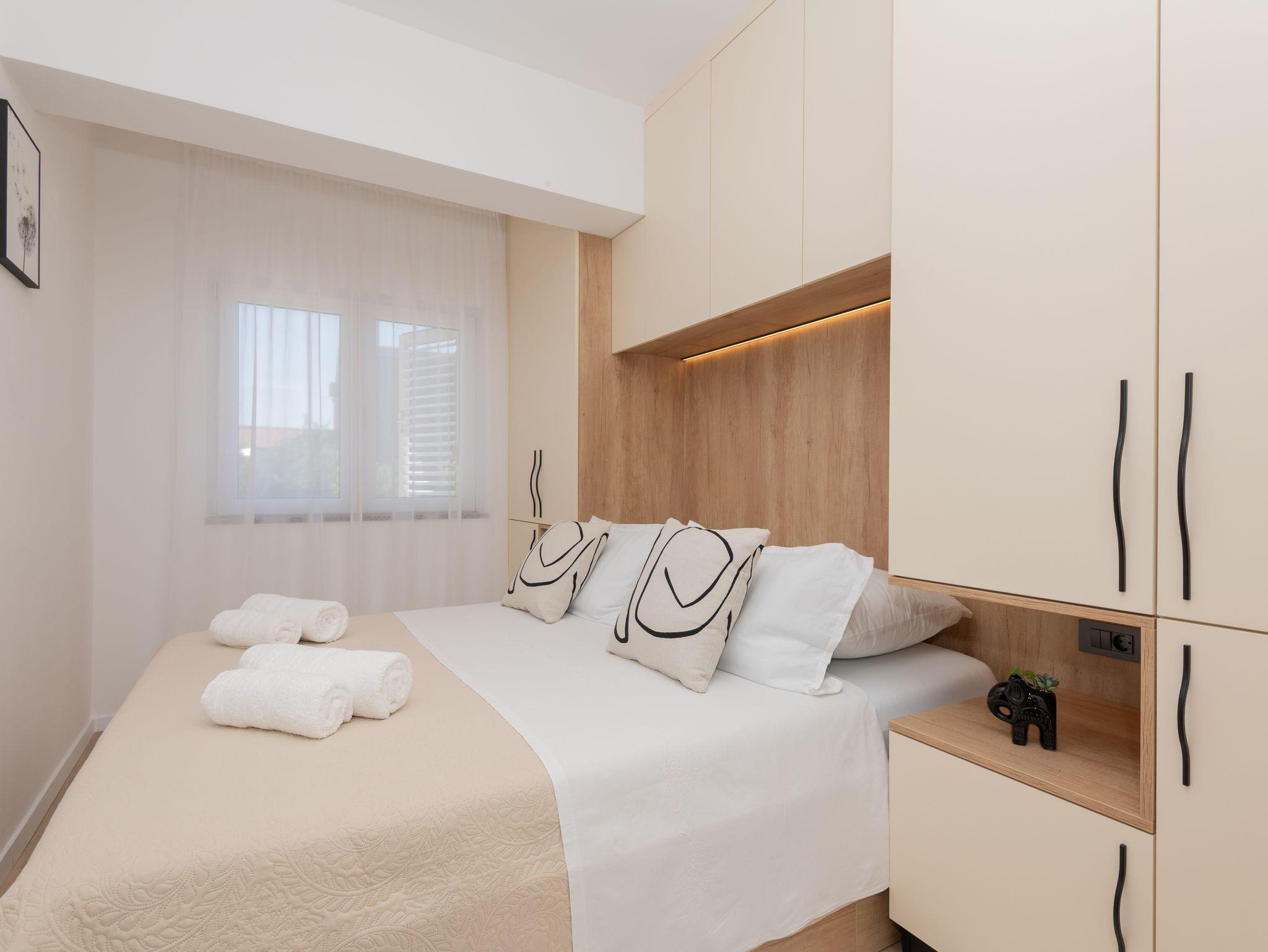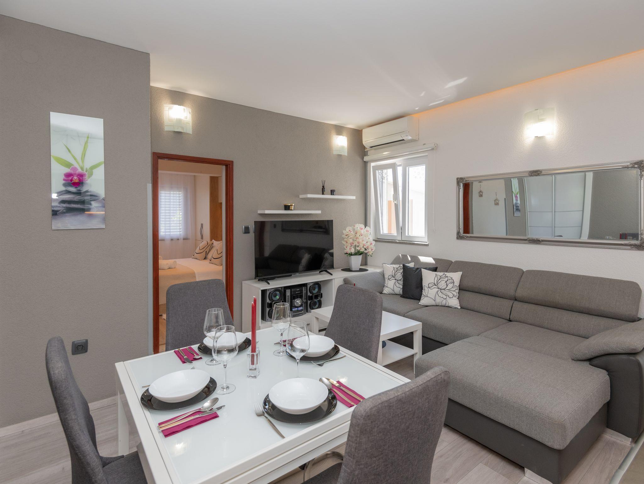 Ferienwohnung bietet Platz für 4 Gäste. Die Betten sind in Schlafzimmern, die es 1 gibt, und in Wohnzimmer, innerhalb einer Gesamtfläche von 37m2, angeordnet. Für vollen Genuss und Entspannung gibt es einen privaten Grill für Gäste dieser Unterkunft. Die reservierte Unterkunftseinheit hat keinen Balkon und keine Terrasse. IM PREIS INBEGRIFFEN: Kurtaxe, Endreinigung, Klimatisierung, Parkplatz, Internet, Kinderbett, Bügeleisen, Bügelbrett, Föhn. VERBINDLICHE ZUSÄTZLICHE KOSTEN: Aufzahlung für Kurzaufenthalte (prozentualer Zuschlag pro Nächtigungsanzahl: 30% - 1, 20% - 2, 10% - 3). Die Verfügbarkeit zusätzlicher Dienstleistungen in Ihrem reservierten Termin und die Preise derselben (falls nicht aufgeführt) müssen im Voraus überprüft werden. Zusätzliche Dienstleistungen die in der Zahlungsaufforderung nicht aufgeführt sind werden direkt beim Vermieter bezahlt, angenommen der Gast nutzt auch diese.