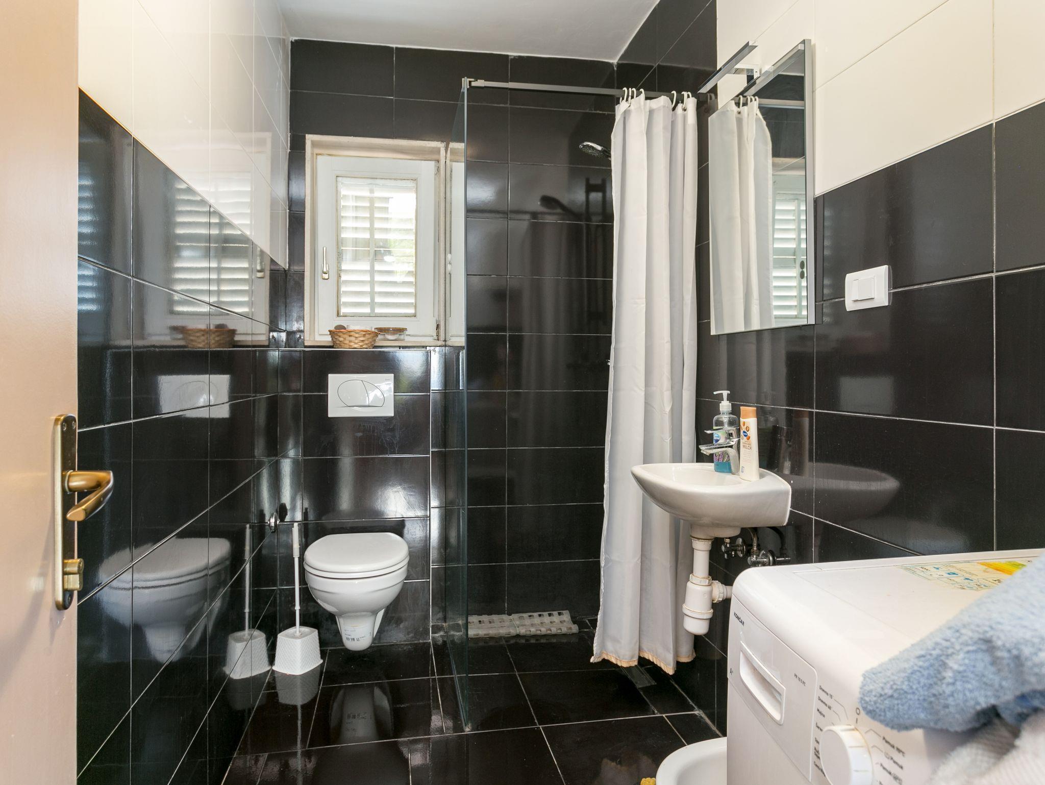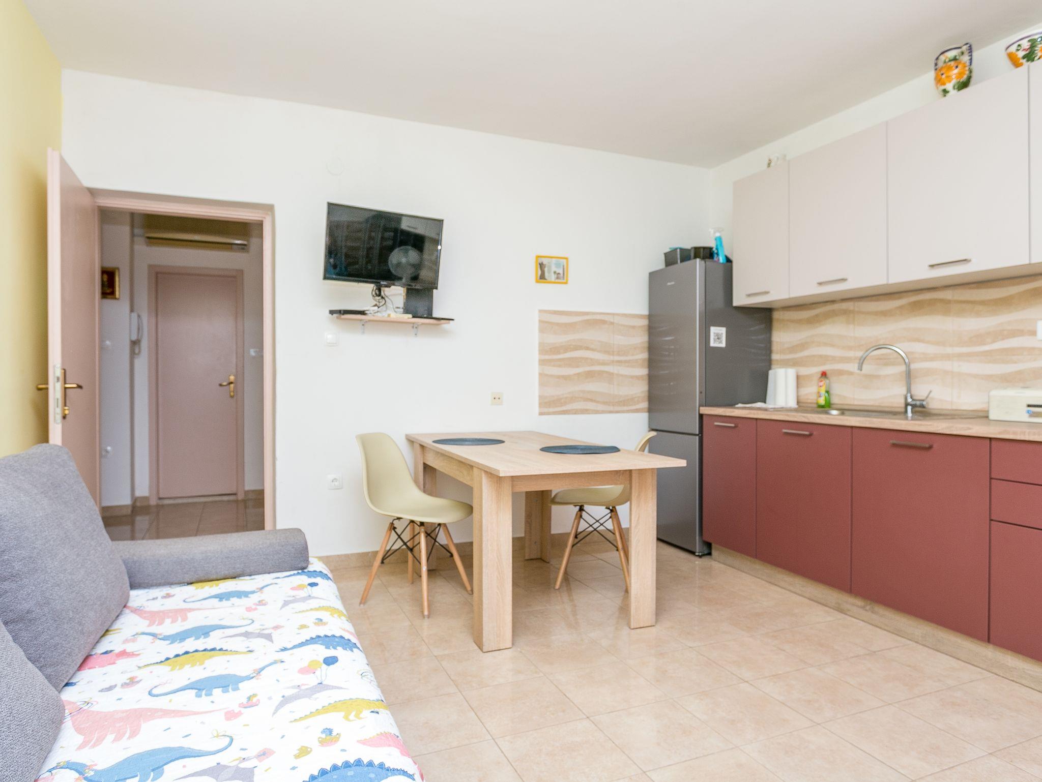 Ferienwohnung bietet Platz für 4 Gäste. Die Betten sind in Schlafzimmern, die es 1 gibt, und in Wohnzimmer, innerhalb einer Gesamtfläche von 42m2, angeordnet. Die Gäste haben einen eigenen Balkon zur Verfügung, auf der sie in warmen Sommernächten genießen können. Das Apartment bietet Meerblick. Durch den Flur der gebuchten Unterkunftseinheit gehen auch andere Gäste oder Vermieter. IM PREIS INBEGRIFFEN: Kurtaxe, Endreinigung, Klimatisierung, Parkplatz, Internet, Zusatzbett, Bügeleisen. VERBINDLICHE ZUSÄTZLICHE KOSTEN: Aufzahlung für Kurzaufenthalte (prozentualer Zuschlag pro Nächtigungsanzahl: 30% - 1, 20% - 2, 10% - 3). Die Verfügbarkeit zusätzlicher Dienstleistungen in Ihrem reservierten Termin und die Preise derselben (falls nicht aufgeführt) müssen im Voraus überprüft werden. Zusätzliche Dienstleistungen die in der Zahlungsaufforderung nicht aufgeführt sind werden direkt beim Vermieter bezahlt, angenommen der Gast nutzt auch diese.