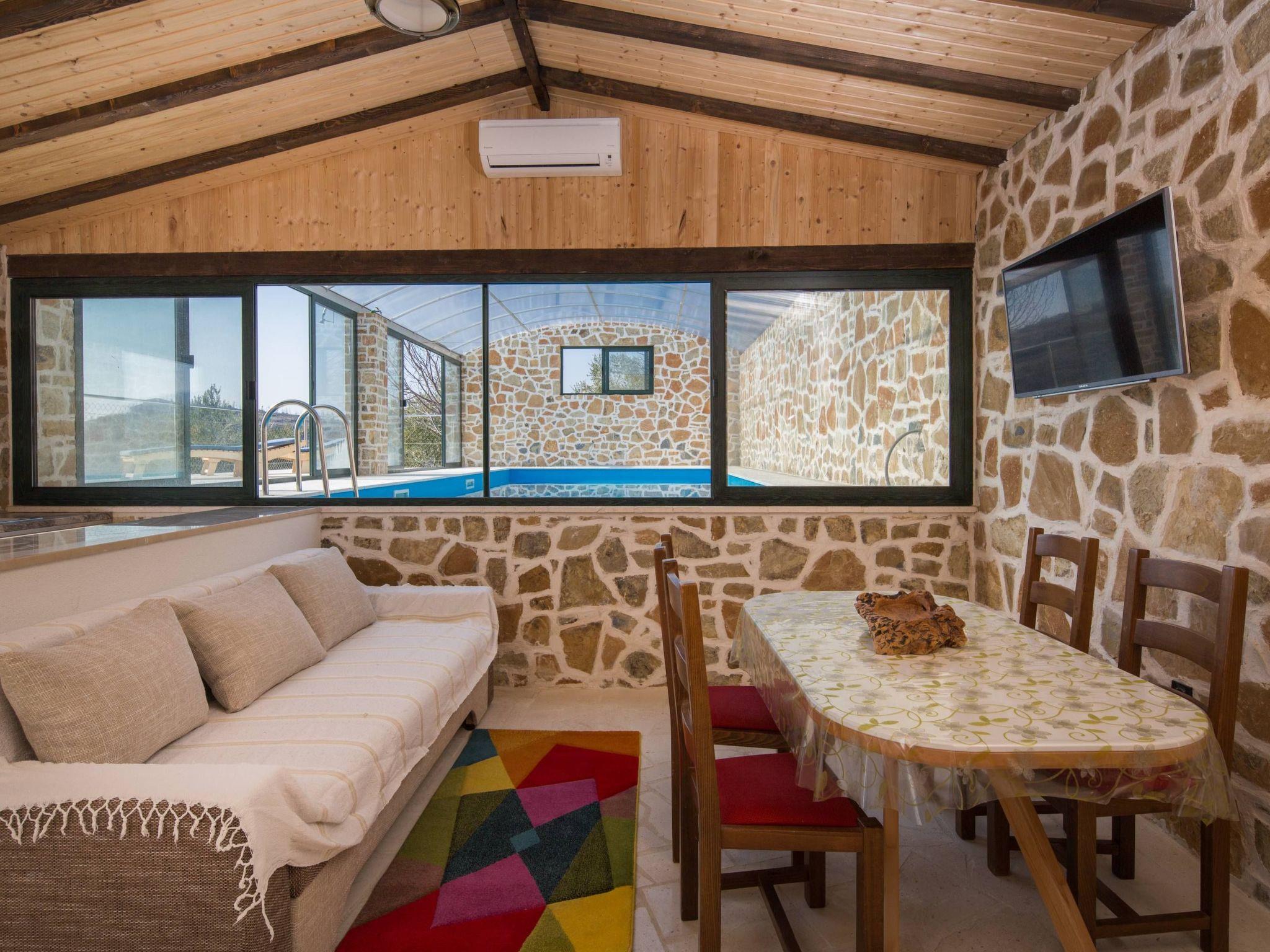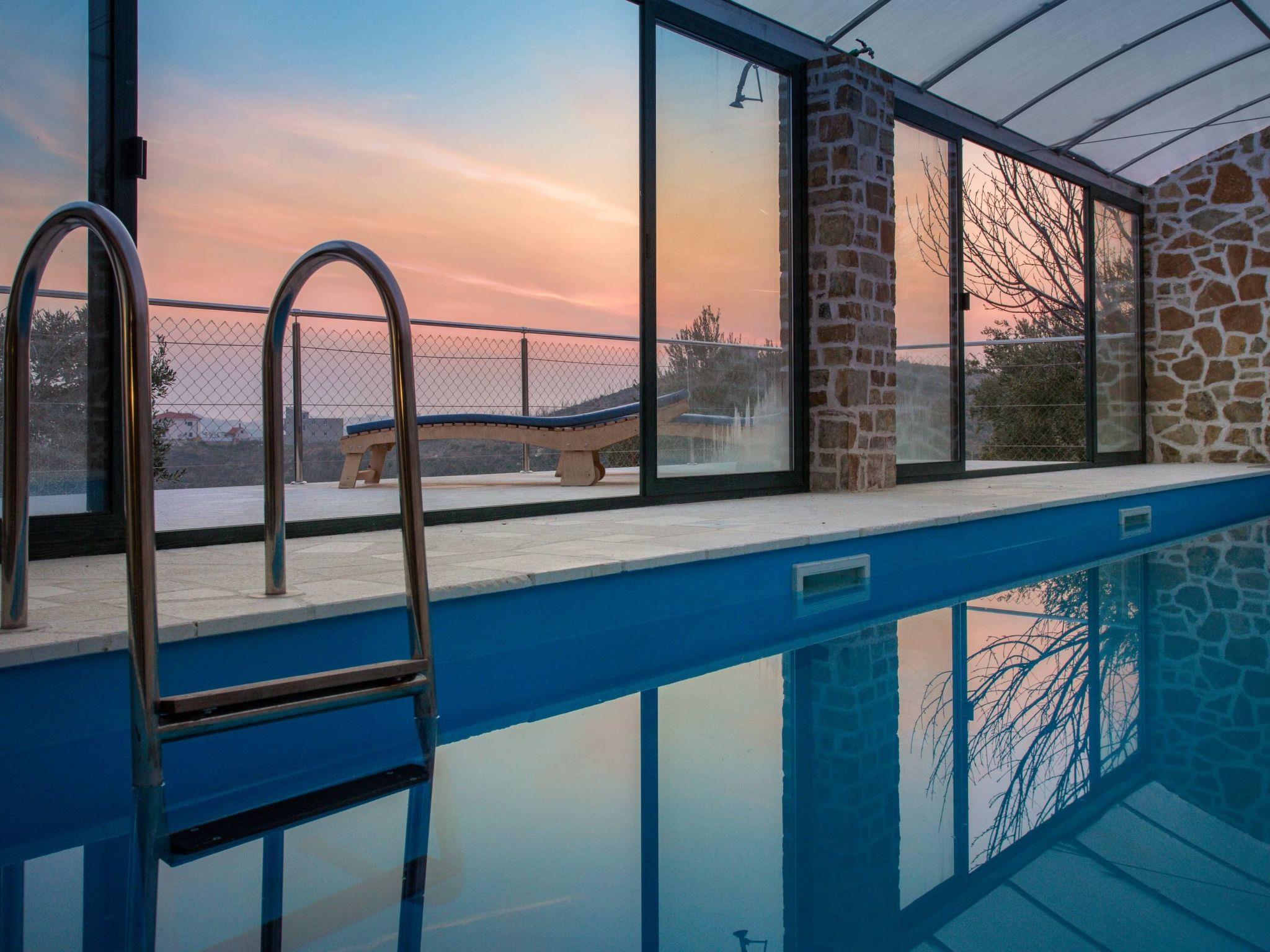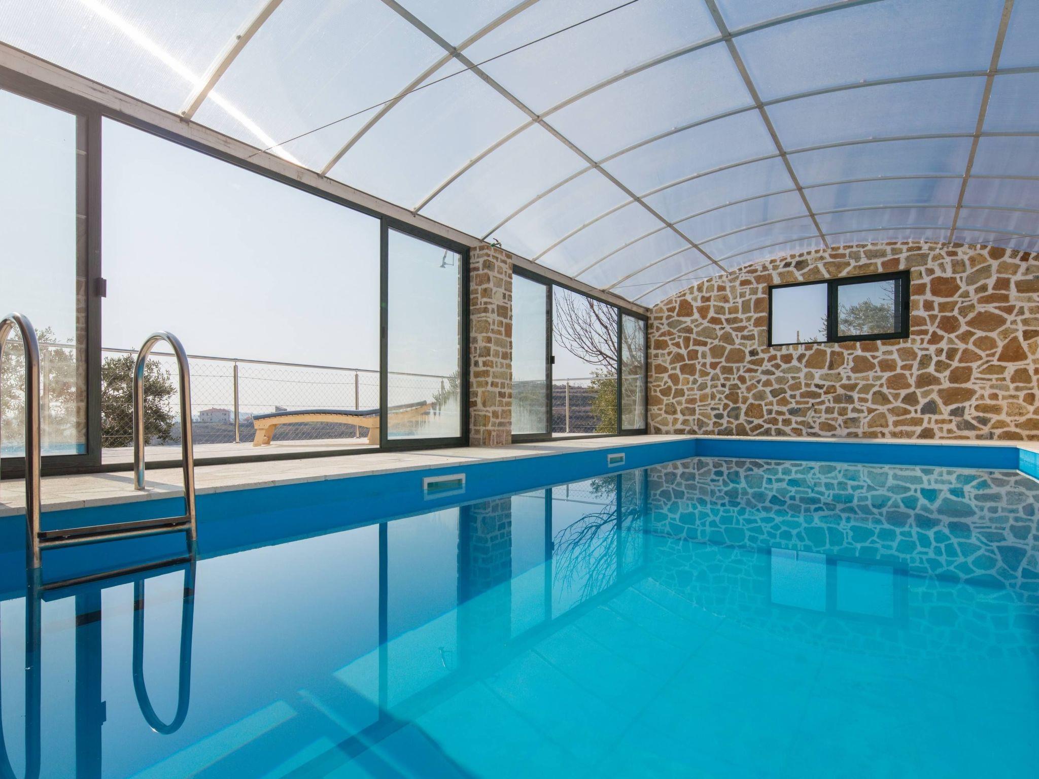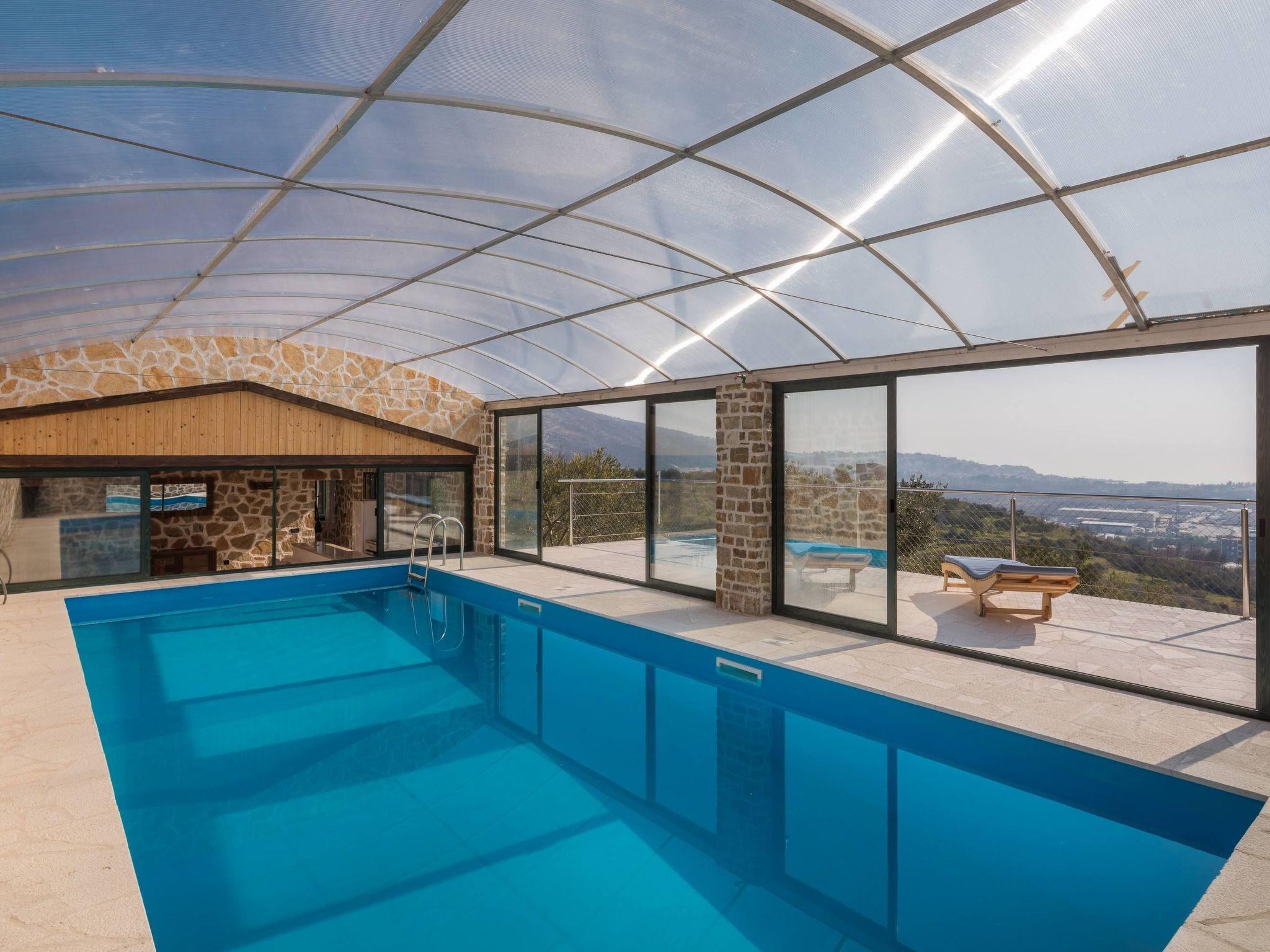 The living room provides access to your private indoor pool measuring 4 x 10 metres, with a metal ladder to facilitate entry. After a few rounds of swimming, you can relax on the sun loungers on the terrace (which is equipped with garden furniture with four chairs and a wooden table) and enjoy an extensive panoramic view over the mountainous landscape as far as the sea. If you arrive by car than you can use the secure parking spaces right in front of the house.