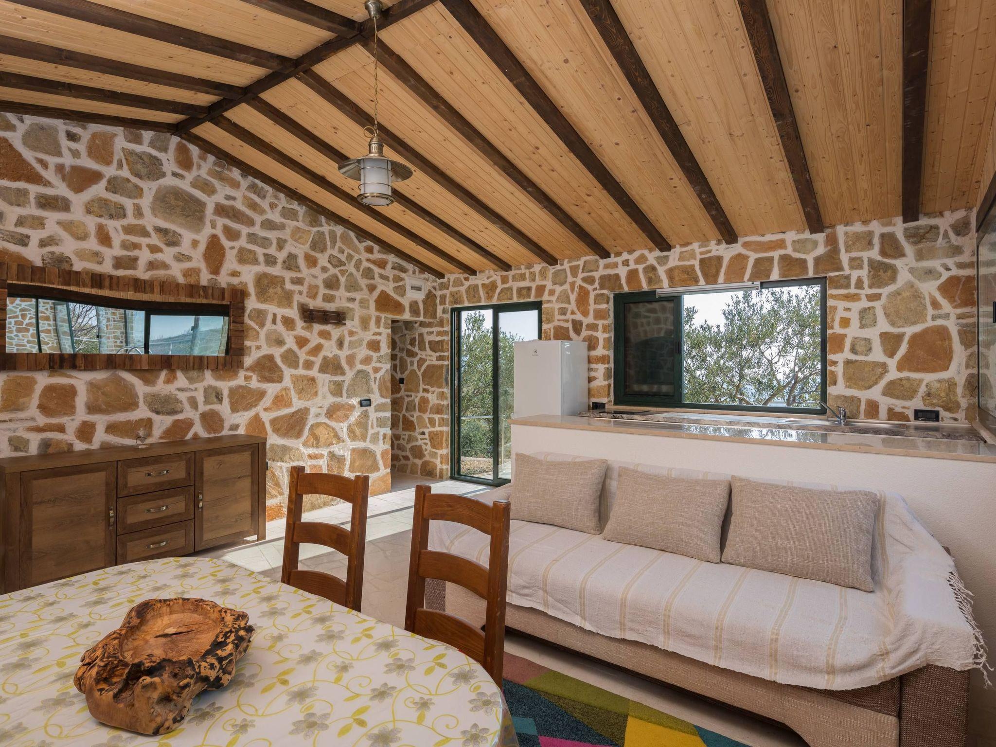 The ground-level holiday house was newly built in 2017 and provides all the necessary modern amenities for a comfortable stay. It consists of a living and dining room with an integrated, fully-equipped kitchen, a light bedroom and a spacious daylight bathroom. The living room provides a comfortable sofa, a flatscreen TV mounted to the wall with a USB port, and a dining table with four chairs. The big open fireplace built into the wall enhances the rustic atmosphere and exudes cosy warmth on cooler evenings. The kitchen is equipped with a dishwasher, a two-ring electric touch screen stove, an extra large fridge with a freezer compartment, and plenty of crockery and cutlery. The bedroom has a double bed (180 x 200cm), and a wall cupboard with plenty of storage space for your clothing and luggage. The sofa in the living room can be converted into an additional double bed (140 x 200cm). The bathroom has a shower cubicle, a washbasin with a wide wall mirror, a hairdryer, a toilet, urinal basin and even a washing machine. Plenty of bed linen and towels are provided and the reliable wireless Internet connection in the apartment can be used free of charge.