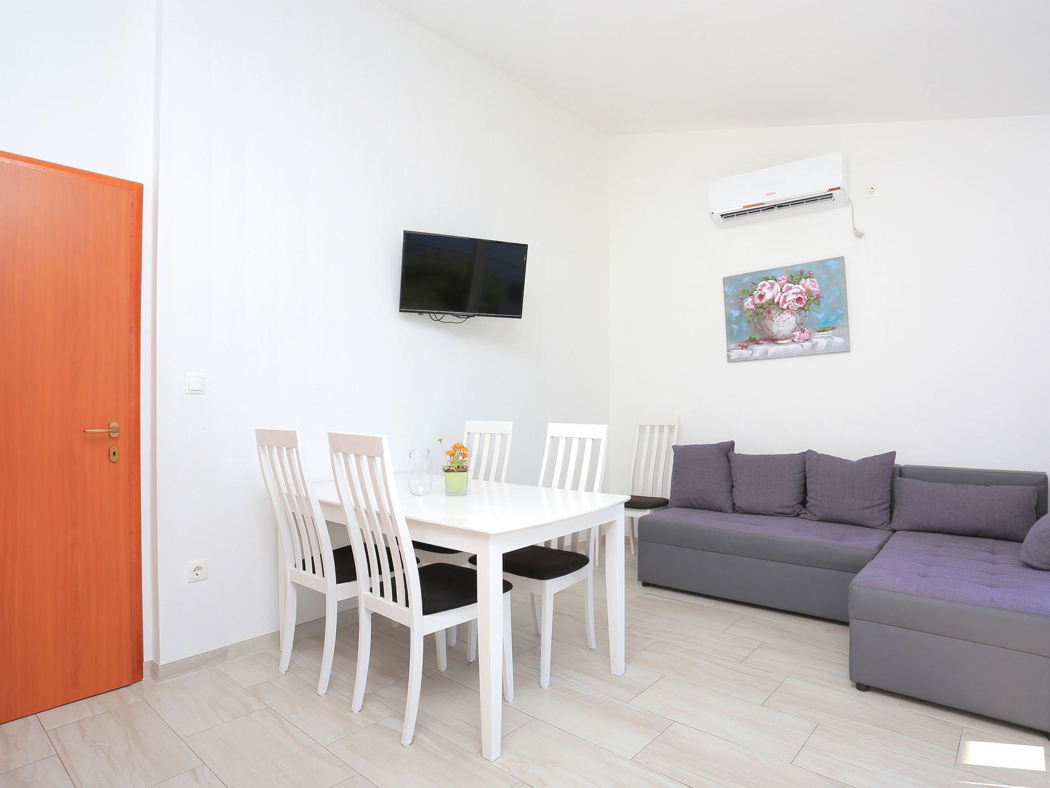 Ferienwohnung bietet Platz für 6 Gäste. Die Betten sind in Schlafzimmern, die es 2 gibt, und in Wohnzimmer, innerhalb einer Gesamtfläche von 51m2, angeordnet. Die Gäste haben eine eigene Terrasse zur Verfügung, auf der sie in warmen Sommernächten genießen können. Das Apartment bietet Meerblick. Es ist erlaubt, Speisen auf dem Gemeinschafts-Grill vorzubereiten. In der Unterkunftseinheit besteht die Möglichkeit des Mitbringens von Haustieren gegen Aufpreis. IM PREIS INBEGRIFFEN: Kurtaxe, Endreinigung, Klimatisierung, Parkplatz, Internet, Kinderbett, Bügeleisen, Bügelbrett, Föhn. VERBINDLICHE ZUSÄTZLICHE KOSTEN: Aufzahlung für Kurzaufenthalte (prozentualer Zuschlag pro Nächtigungsanzahl: 30% - 1, 20% - 2, 10% - 3). UNVERBINDLICHE ZUSÄTZLICHE KOSTEN: Wäschewaschen (5,00 € Waschen), Haustiere (5,00 € pro Nacht). Die Verfügbarkeit zusätzlicher Dienstleistungen in Ihrem reservierten Termin und die Preise derselben (falls nicht aufgeführt) müssen im Voraus überprüft werden. Zusätzliche Dienstleistungen die in der Zahlungsaufforderung nicht aufgeführt sind werden direkt beim Vermieter bezahlt, angenommen der Gast nutzt auch diese.