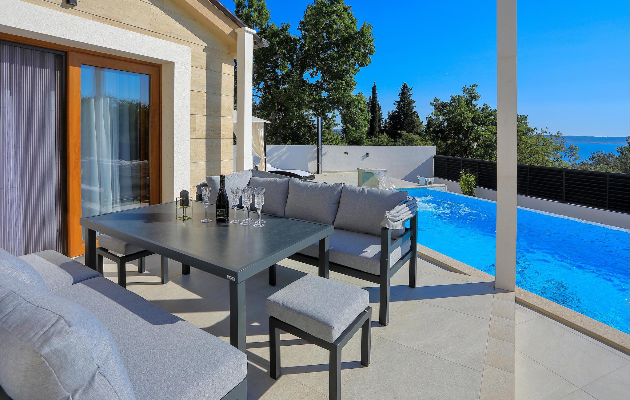 Terrassen er udformet med en pool, som har et vandfald, og her får I en skøn lille oase for jer selv - oven i købet med udsigt til havet. Her kan I nyde solen og jeres morgenkaffe i liggestolene, mens børnene plasker rundt i poolen.
