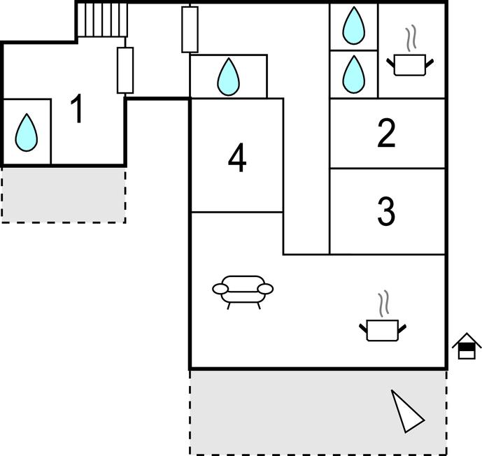 Denne enkelt indrettede lejlighed ligger på første sal i et familiehus og består af en større lejlighed og en etværelses lejlighed, der er forbundet med hinanden. Lejligheden kan nås via en ekstern trappe.