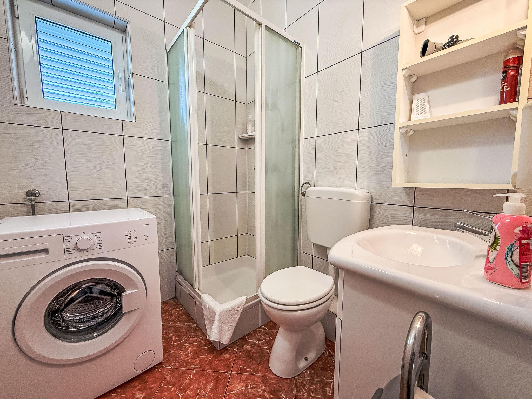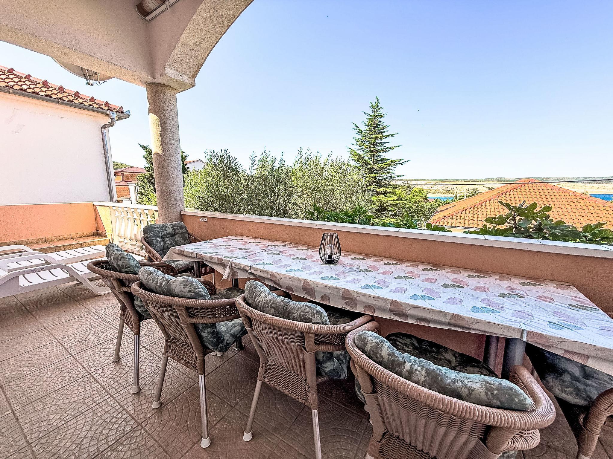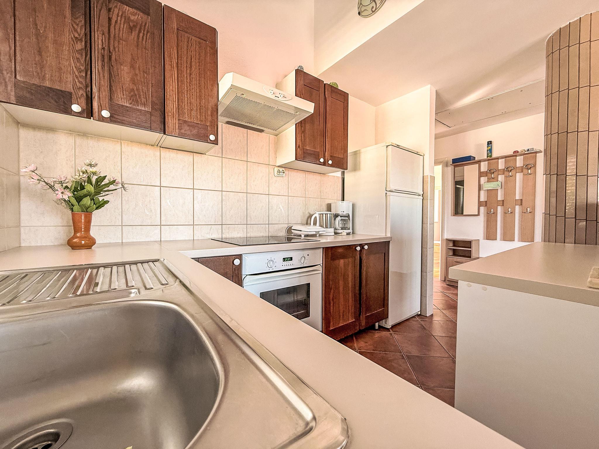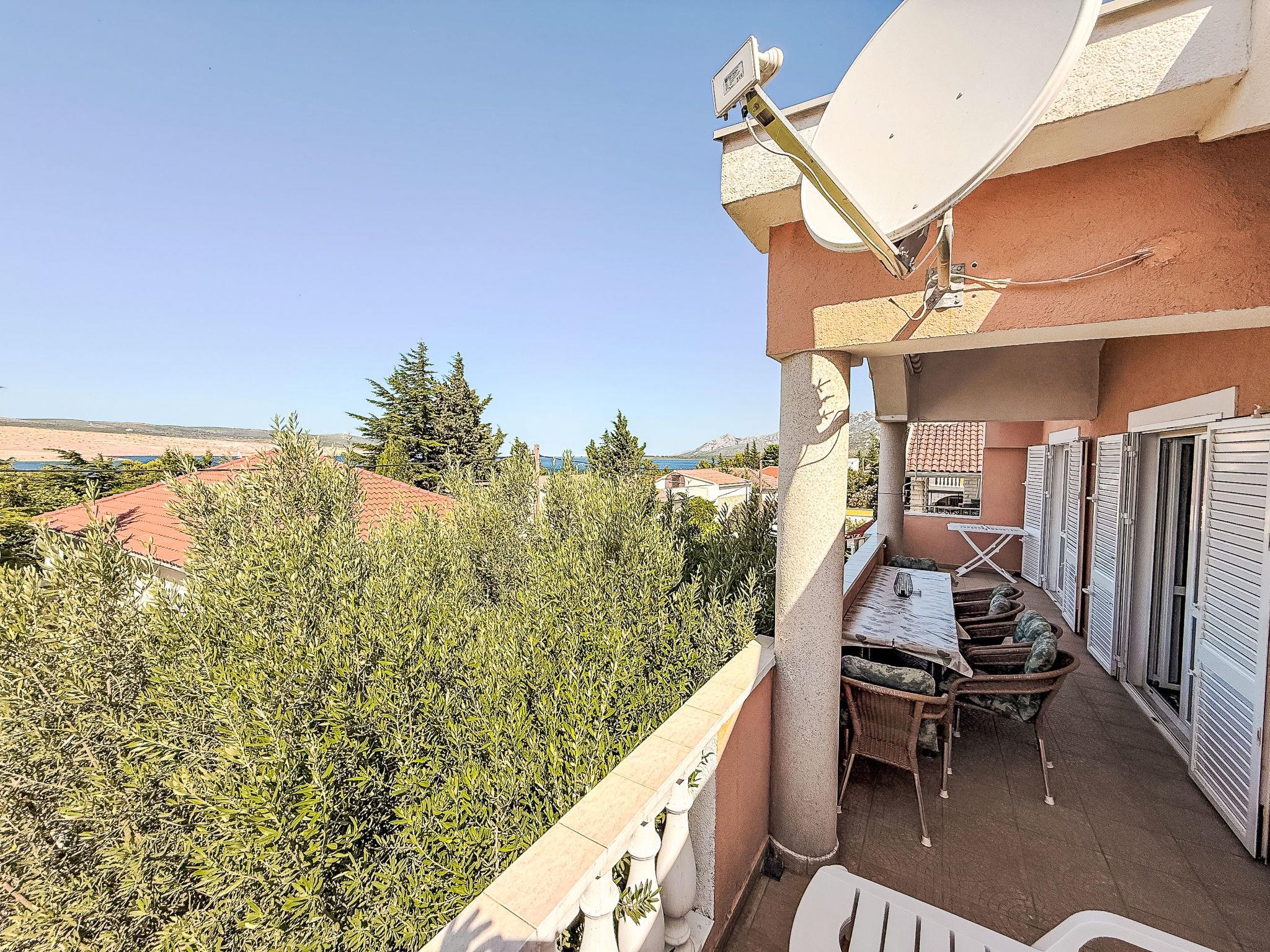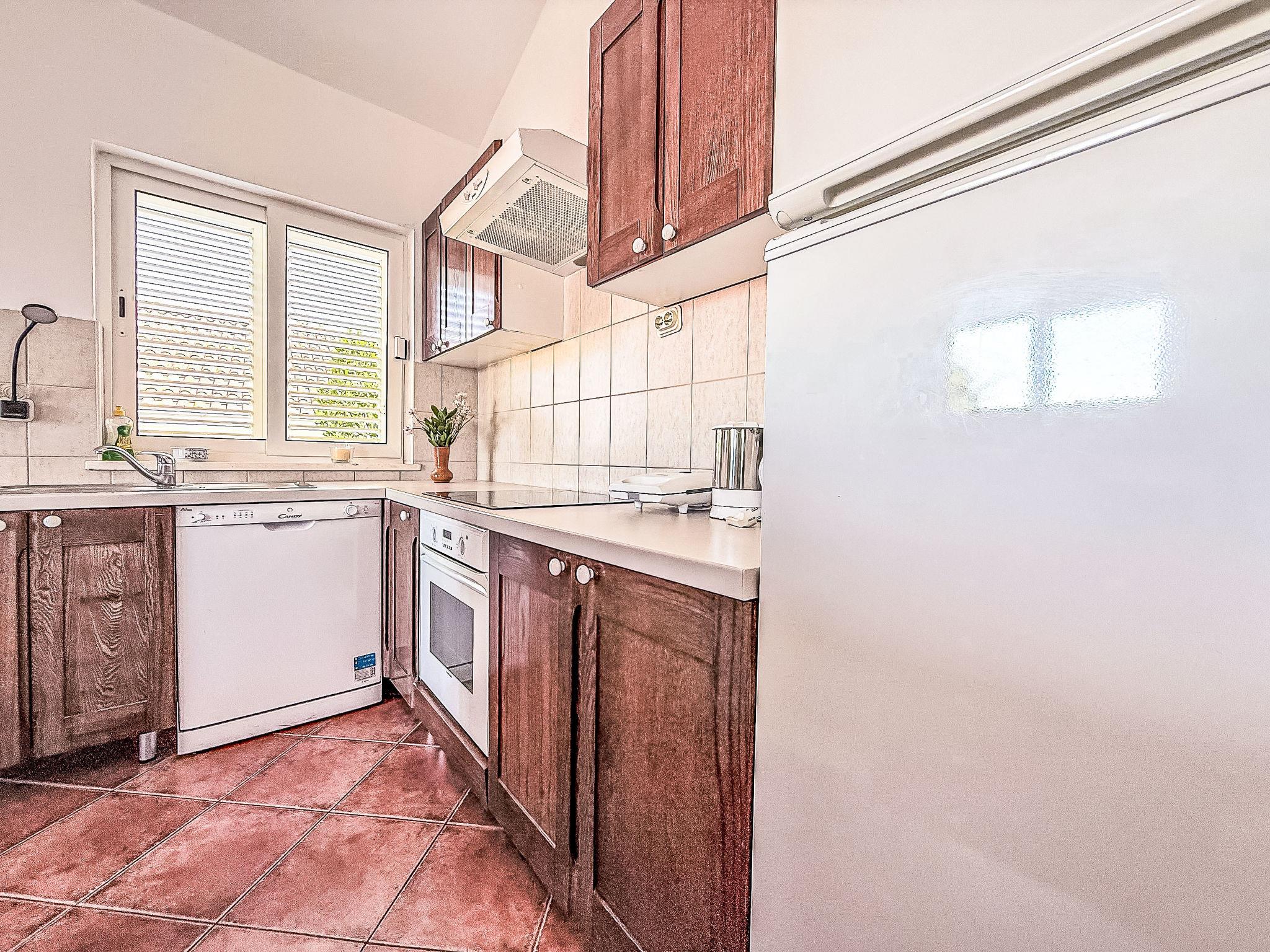 "Ananina", 4-room apartment 85 m2 on 1st floor. Living/dining room with satellite TV and air conditioning. Exit to the balcony. 1 room with 1 double bed (2 x 90 cm, length 200 cm). Walk-through room with 1 double bed (2 x 80 cm, length 200 cm). 1 room with 2 beds (90 cm, length 200 cm). Open kitchen (oven, dishwasher, 4 ceramic glass hob hotplates, toaster, kettle, freezer, electric coffee machine). Shower/WC, sep. WC. No heating option. Balcony 22 m2. Balcony furniture. Partial view of the sea. Facilities: washing machine. Internet (WiFi, free). Please note: non-smoking house. Private entrance.