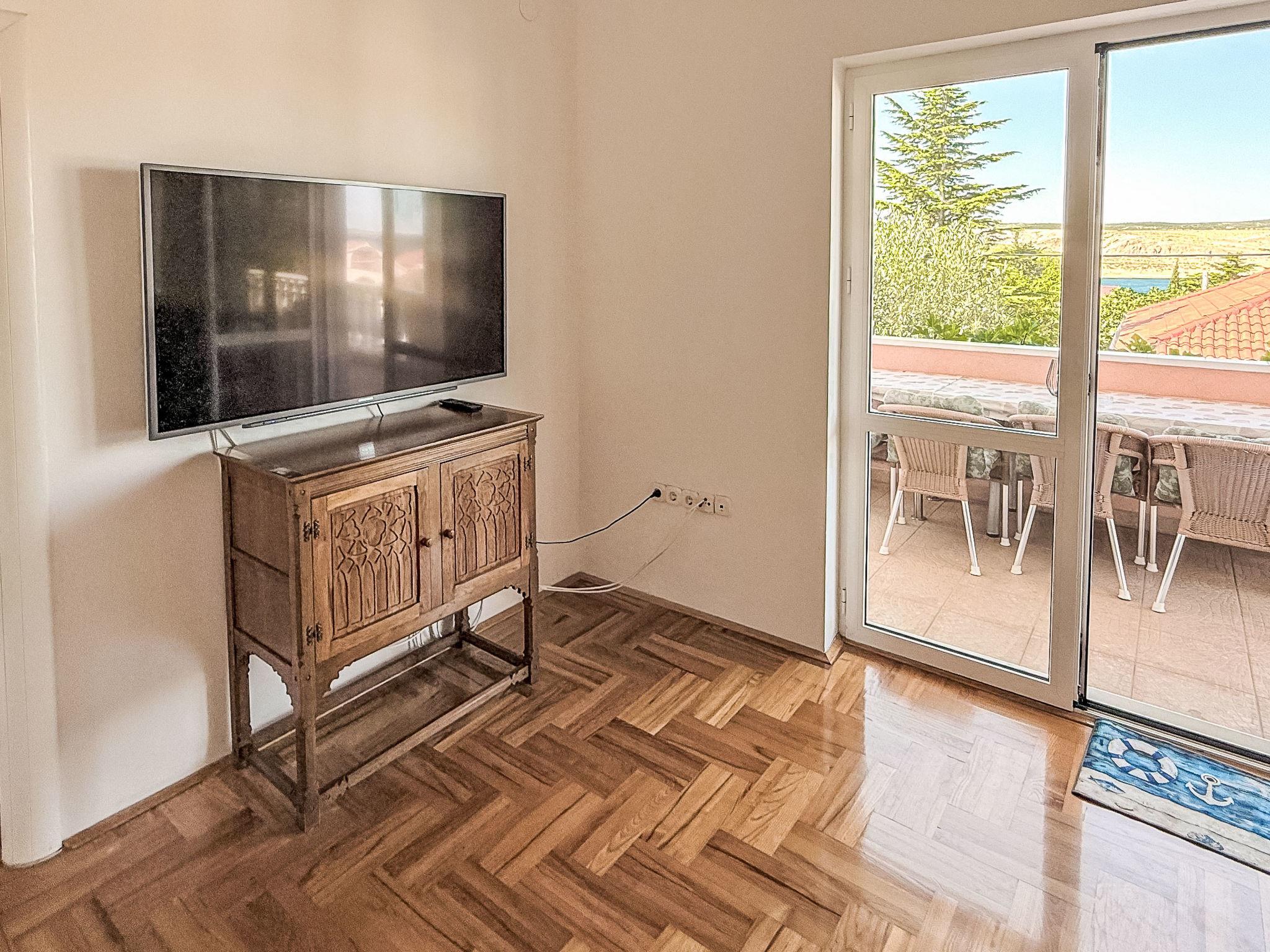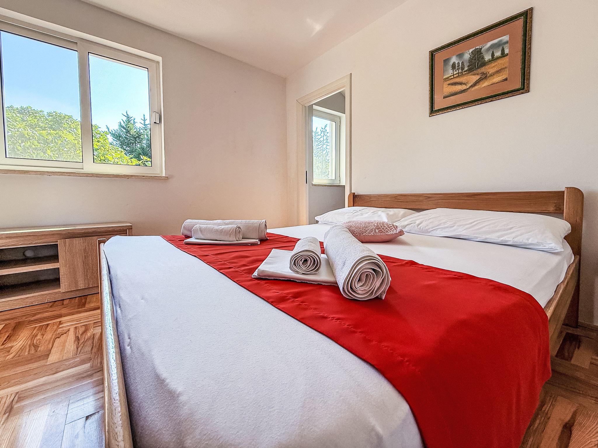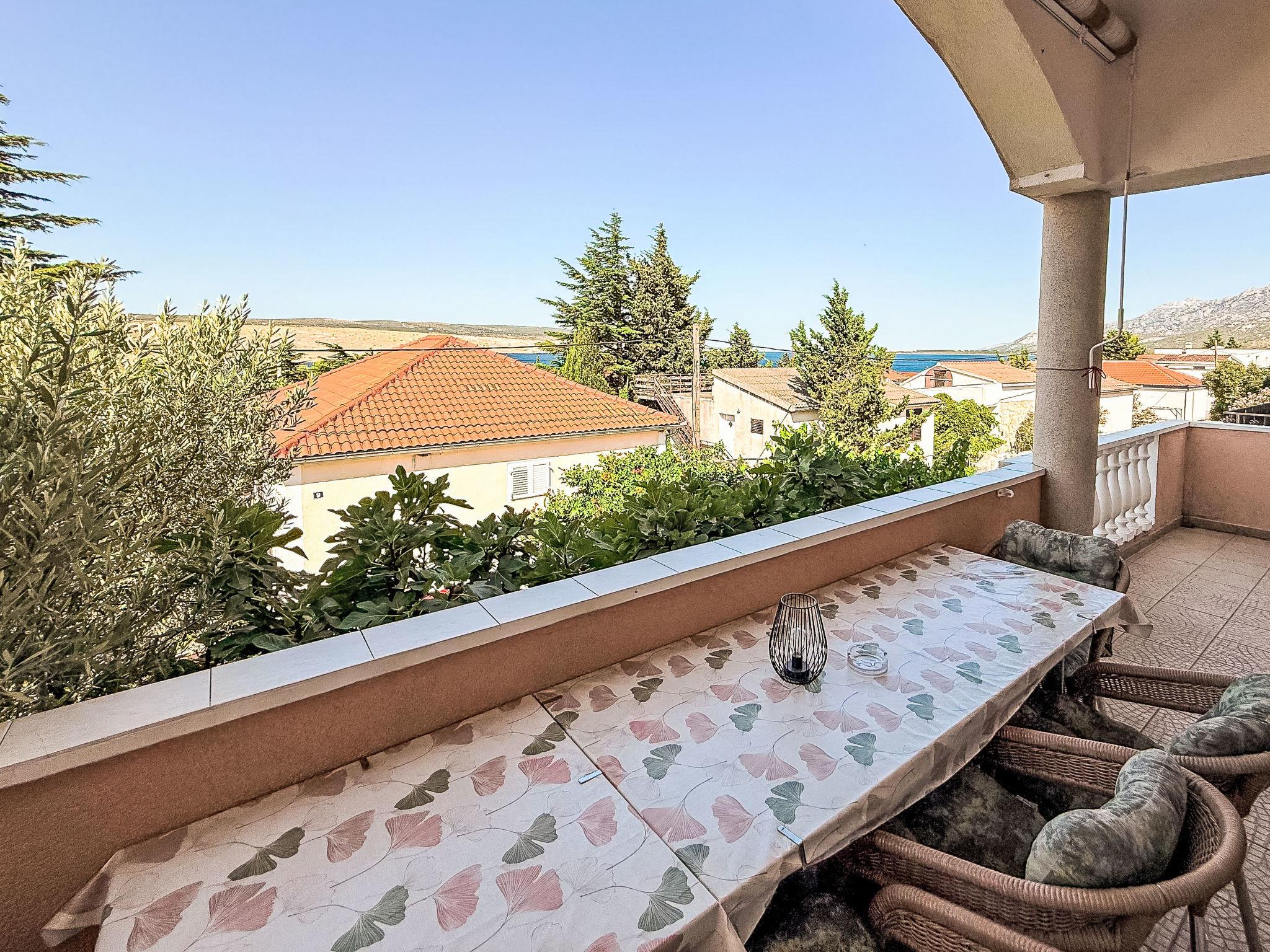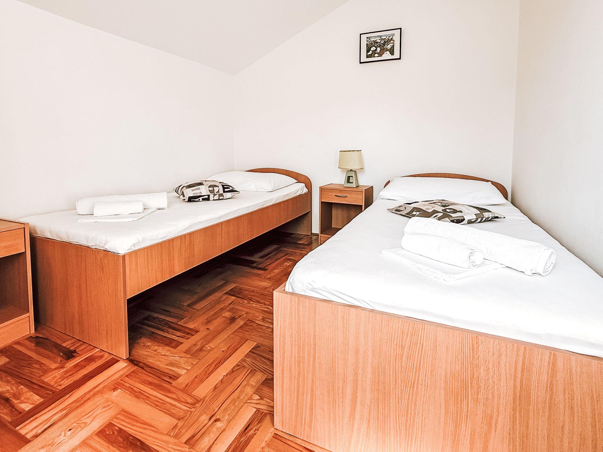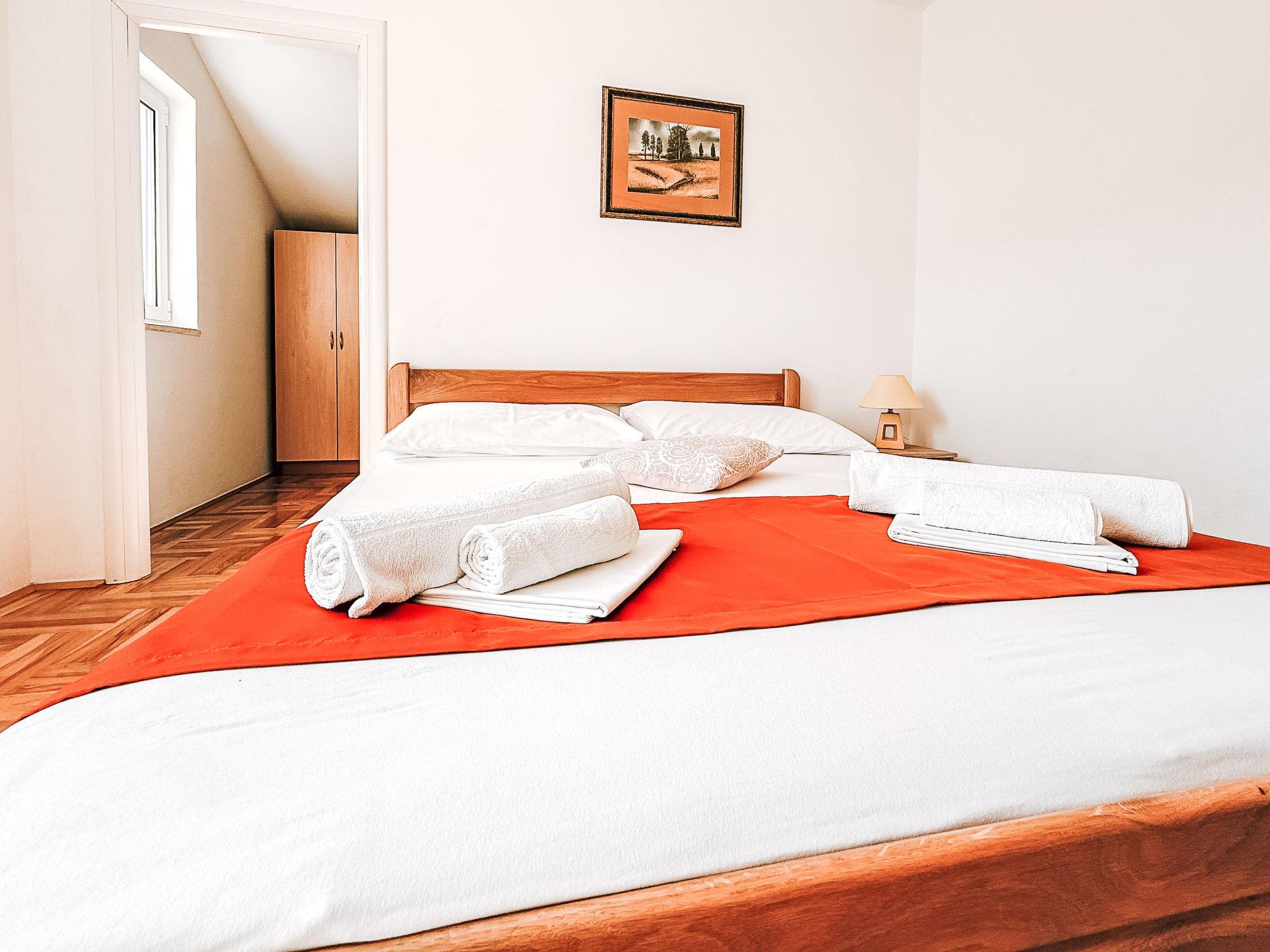 "Ananina", 4-room apartment 85 m2 on 1st floor. Living/dining room with satellite TV and air conditioning. Exit to the balcony. 1 room with 1 double bed (2 x 90 cm, length 200 cm). Walk-through room with 1 double bed (2 x 80 cm, length 200 cm). 1 room with 2 beds (90 cm, length 200 cm). Open kitchen (oven, dishwasher, 4 ceramic glass hob hotplates, toaster, kettle, freezer, electric coffee machine). Shower/WC, sep. WC. No heating option. Balcony 22 m2. Balcony furniture. Partial view of the sea. Facilities: washing machine. Internet (WiFi, free). Please note: non-smoking house. Private entrance.
