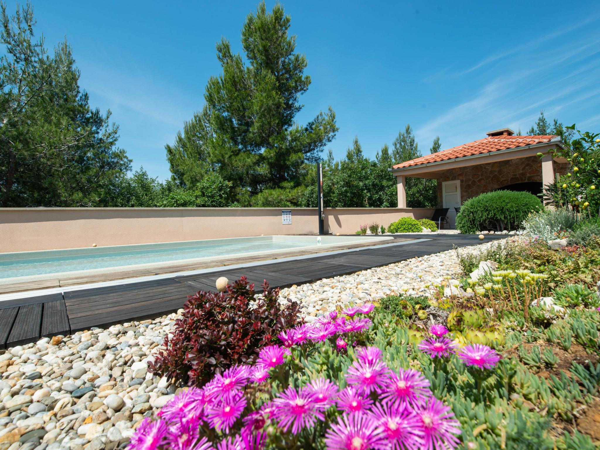 Apartment house "Matas". 12 km from the centre of Starigrad, 300 m from the centre of Rovanjska, 35 km from the centre of Zadar, 200 m from the sea, 200 m from the beach, in a cul-de-sac. For shared use: property 500 m2 (fenced) with trees, swimming pool angular heated (8 x 3 m, 30 m2, depth 150 cm, seasonal availability: 28.Mar. - 17.Oct.) with internal staircase and shutter cover. Outdoor shower, terrace, garden furniture, barbecue, pool maintenance by the owner/gardener. In the house: internet access. Parking on the premises, public parking. Shop 300 m, restaurant 500 m, bus stop 350 m, rocky beach 200 m. Swimming pool with counterflow.