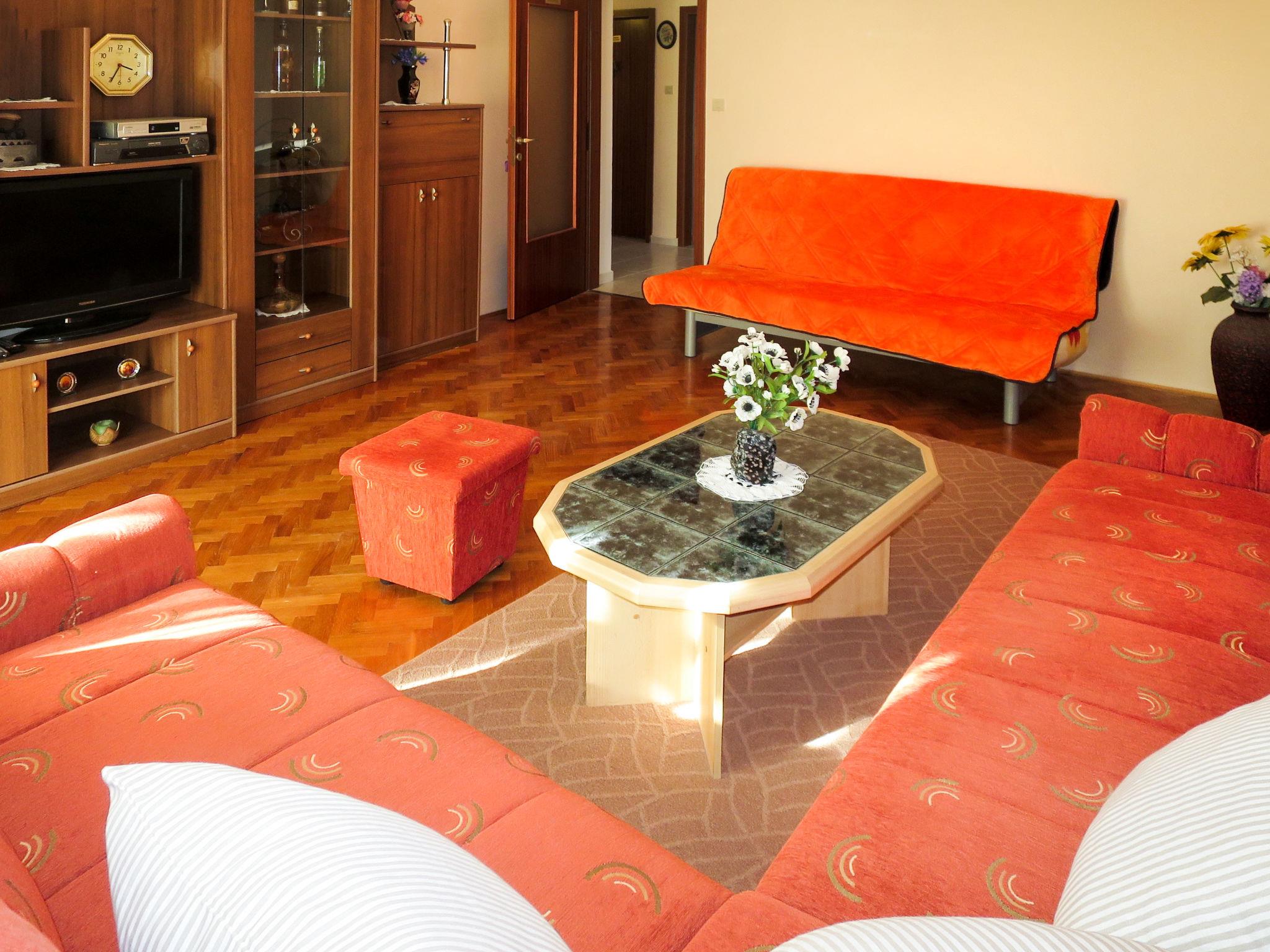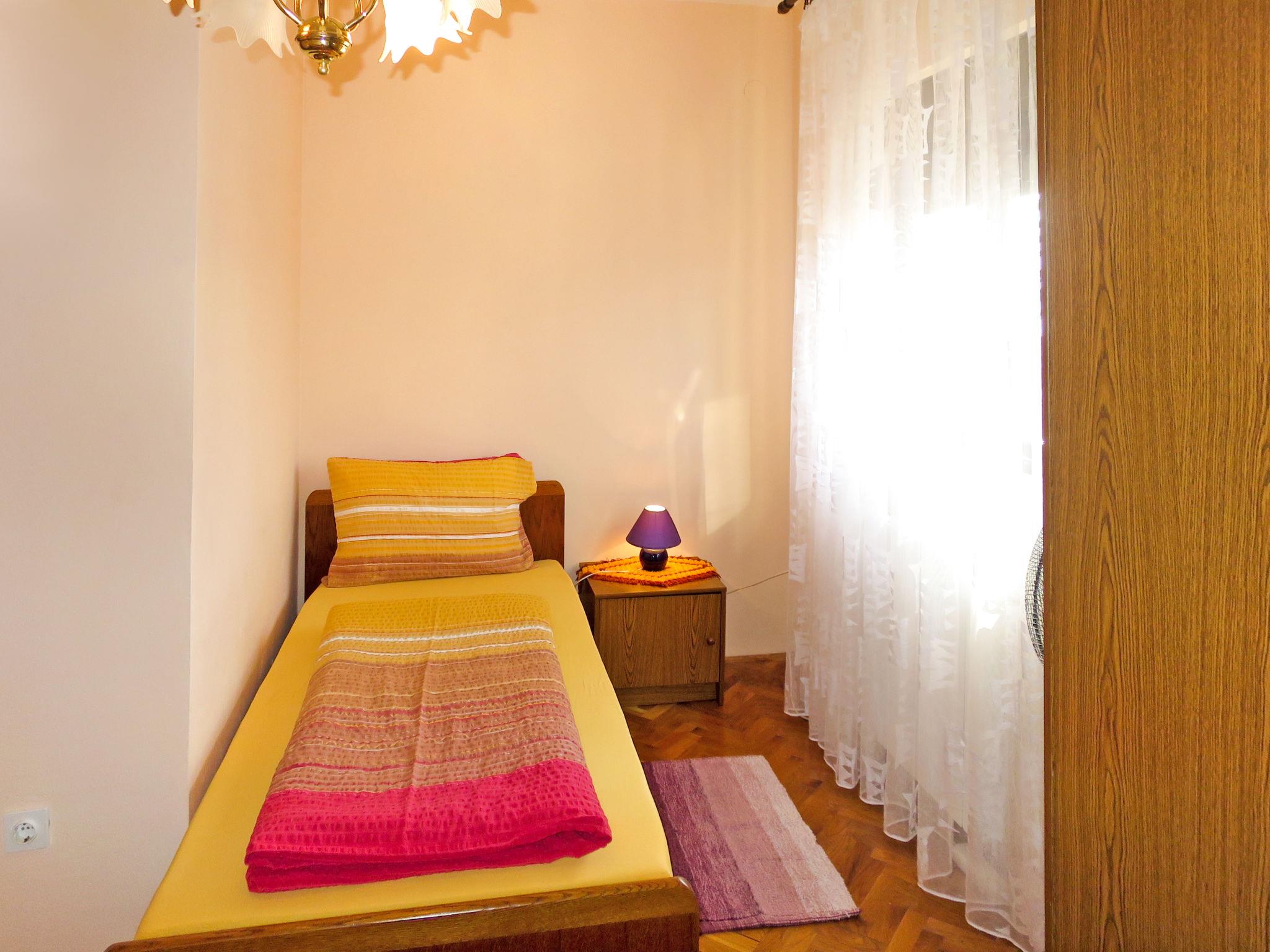 "Stjepan", 4-room apartment 90 m2 on 1st floor. Living room with 1 sofabed, satellite TV and air conditioning. Exit to the balcony. 1 room with 1 double bed (2 x 90 cm, length 200 cm), air conditioning. Exit to the balcony. 2 rooms, each room with 2 beds (90 cm, length 200 cm). Kitchen (2 hot plates, oven, dishwasher, 2 gas rings, toaster, kettle, freezer, electric coffee machine) with dining table. Bath/bidet/WC, sep. WC. No heating option. Balcony. Balcony furniture. Facilities: washing machine, iron, baby cot. Internet (WiFi, free). Please note: non-smoking house. Private entrance.