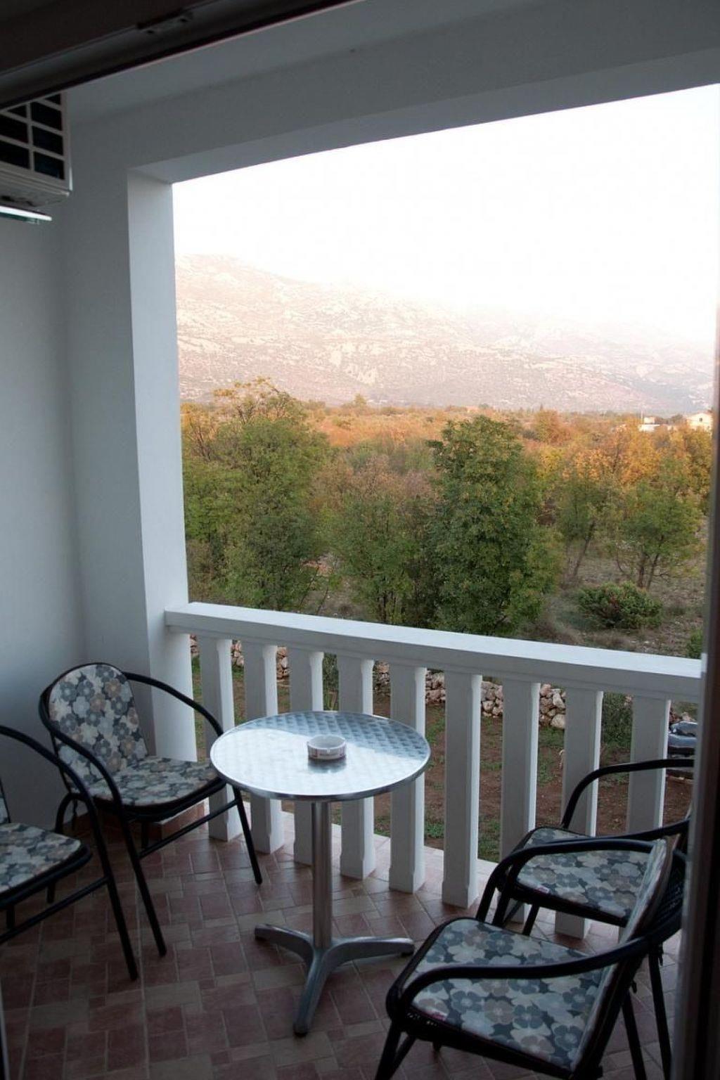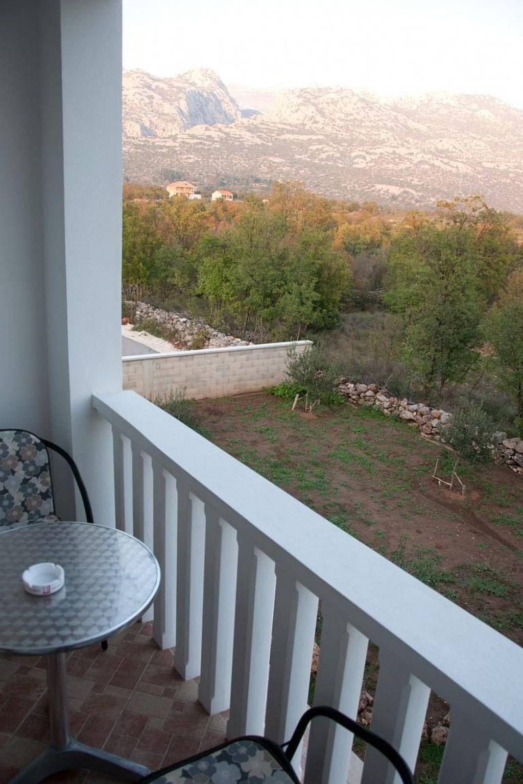 The balcony is furnished with a table and chairs and provides a beautiful view of the surrounding landscape.