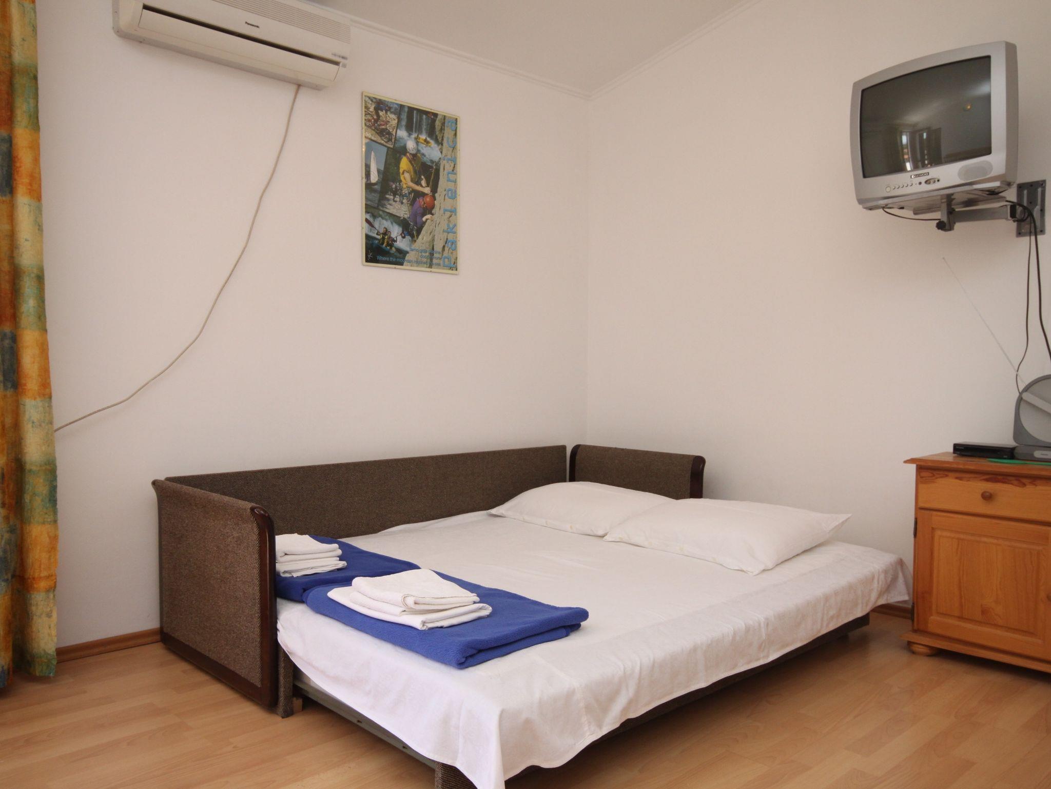 Ferienwohnung bietet Platz für 4 Gäste. Die Betten sind in Schlafzimmern, die es 1 gibt, und in Wohnzimmer, innerhalb einer Gesamtfläche von 35m2, angeordnet. Die Gäste haben eine eigene Terrasse zur Verfügung, auf der sie in warmen Sommernächten genießen können. Das Apartment bietet Meerblick. Es ist erlaubt, Speisen auf dem Gemeinschafts-Grill vorzubereiten. IM PREIS INBEGRIFFEN: Kurtaxe, Endreinigung, Parkplatz, Internet. VERBINDLICHE ZUSÄTZLICHE KOSTEN: Aufzahlung für Kurzaufenthalte (prozentualer Zuschlag pro Nächtigungsanzahl: 30% - 1, 20% - 2, 10% - 3). UNVERBINDLICHE ZUSÄTZLICHE KOSTEN: Klimatisierung (5,00 € pro Nacht), Wäschewaschen (5,00 € Waschen). Die Verfügbarkeit zusätzlicher Dienstleistungen in Ihrem reservierten Termin und die Preise derselben (falls nicht aufgeführt) müssen im Voraus überprüft werden. Zusätzliche Dienstleistungen die in der Zahlungsaufforderung nicht aufgeführt sind werden direkt beim Vermieter bezahlt, angenommen der Gast nutzt auch diese. Ermäßigung auf den Grundpreis: Gratistag 14=13 (bei einem Aufenthalt von 14 Tagen oder mehr erhalten Sie einen Gratistag für den Aufenthalt bis 31.12.26).